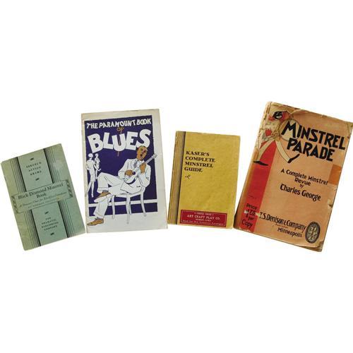<B>Group of Four Minstrel and Blues Books.</B></I> The minstrel show was the first distinctly American form of theatre. It consisted of comedy skits, jokes, dancing, variety acts, and singing- usually performed by white performers in blackface. It reached the peak of its popularity in the middle of the nineteenth century but continued in various forms up until the 1950s. This lot contains four interesting publications: <BR><B><I>The Paramount Book of Blues</B></I></B></I> (Port Washington, WI: New York Recording Laboratories, nd [1927?]). This is a must-bid item for the blues fan. It has photo biographies of some of the legends of blues: Blind Lemon Jefferson, "Ma" Rainey, Blind Blake, Ida Cox, Charlie Jackson, and Elzadie Robinson. It also prints the music for these artists' popular songs including: "Long Lonesome Blues", "Moon Shine Blues", "Early Morning Blues", "Chicago Monkey Man Blues", "Salty Dog", and "Pig Meat Blues". 40 pages, stiff paper cover with color image, 8vo (6.25" x 9.5"), fine condition. <BR><B><I>Black Diamond Minstrel Book</B></I></B></I> <I>A Treasure Chest for Blackface Comedians</B></I> by Gordon Griffith (Chicago: The Dramatic Publishing Company, 1930). 64 pages, paper wraps, 12mo (5" x 7.25"), very good condition with some minor cover stains. <BR><B><I>Kaser's Complete Minstrel Guide</B></I></B></I> by Arthur LeRoy Kaser (Chicago: The Dramatic Publishing Company, 1934). A complete guide to staging a minstrel show with a number of scripts for single and multiple performers, 152 pages, paper wraps, 12mo (5" x 7.25"), very good condition. <BR><B><I>Minstrel Parade</B></I></B></I> <I>A Complete Minstrel Revue</B></I> by Charles George (Minneapolis: T. S. Denison & Company, 1950). Jokes, routines, and musical numbers, 119 pages, paper covers, 4to (6.75" x 10.25"), fair to good condition with cover tears, ex-library.