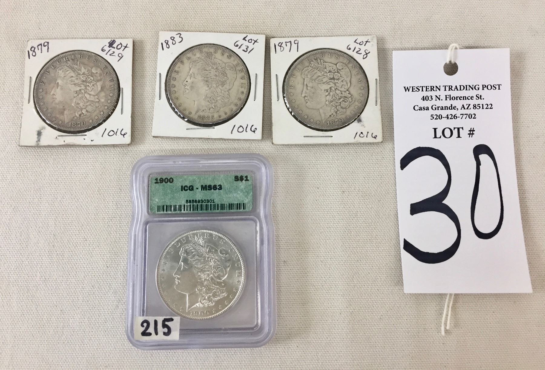 Description: For sale in this lot is a group of four Morgan Dollars. Check these out! Maker: US Treasury. Approx. Age: 1879 to 1900. Size: Silver Dollar. Condition: Good for its age, normal wear expected. Please look closely at the pictures - they are an important part of our description. Shipping: There will be a $5 handling / packaging fee for shipping this lot. The actual cost of postage will be added on top of that.