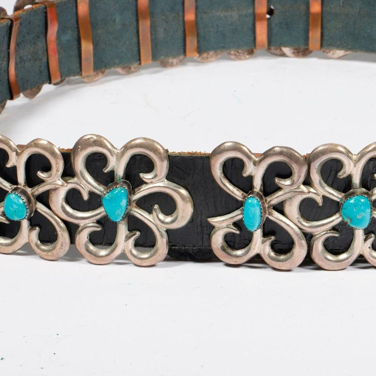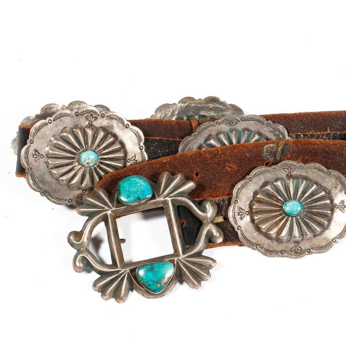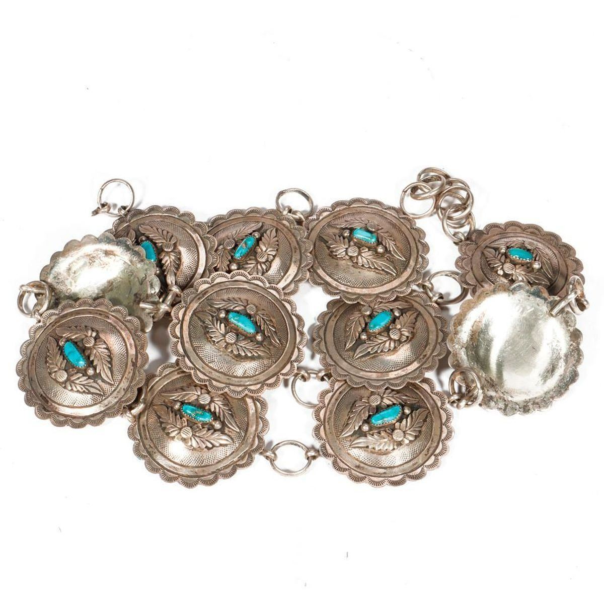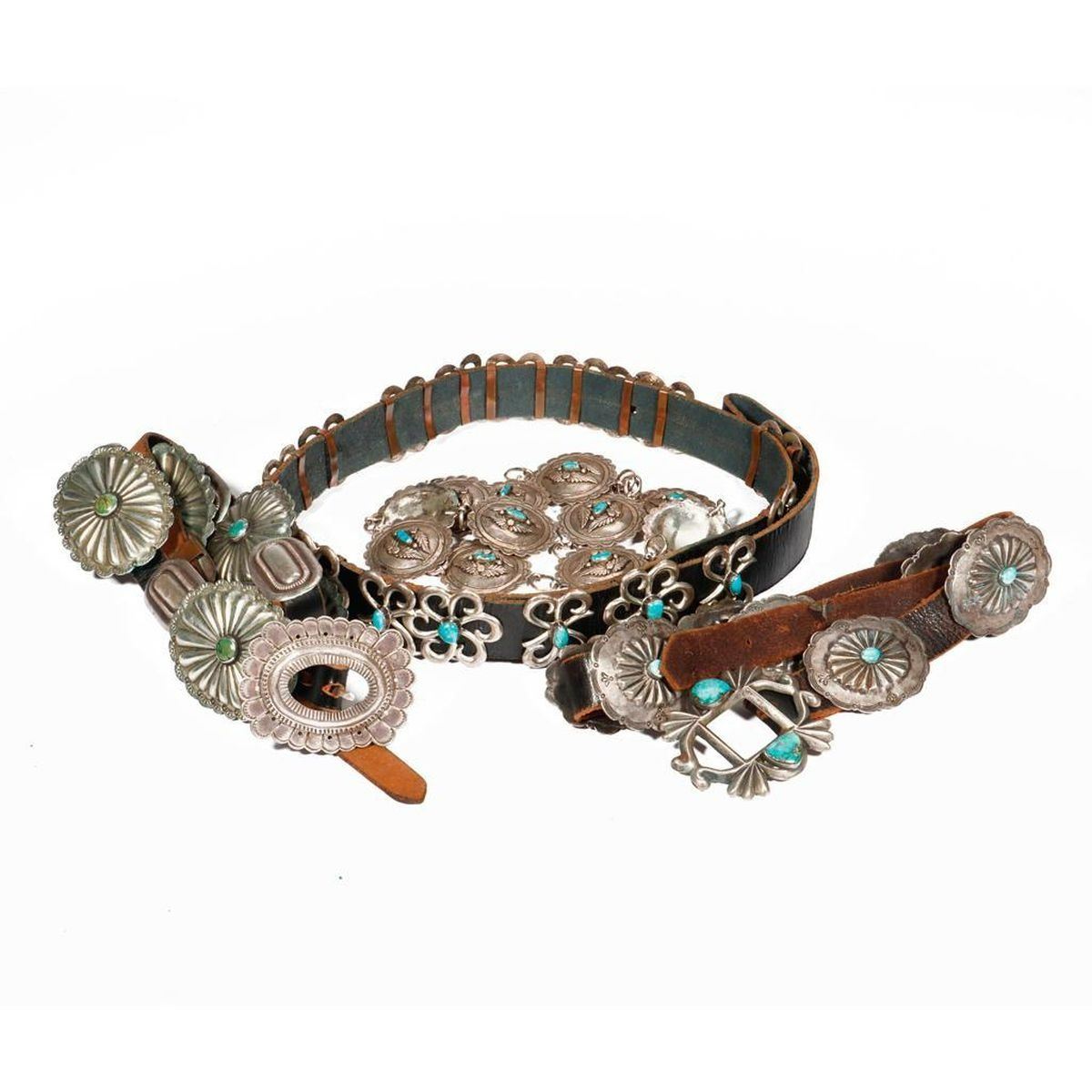 Group of Four Navajo Concho Belts. Consisting of one leather belt with seventeen conchos, each with one turquoisebead, measures 46in length. Second leather Belt with9 conchos with single bead of turquoise in each concho and a buckle with two turquoise stones, measures 38in. Third leather belt with 11 conchos alternating shapes, 6 of the conchos have a single green turquoise stone, one concho turned into the buckle, measures 38in. Fourth chain link belt with 11 conchos with stamping and single turquoise bead, measures 28in. Condition Report: All lots are sold as is and where is. Turner Auctions + Appraisals, LLC provides condition reports upon request to aid in your bidding decision. No statement regarding age, condition, kind, value, or quality of a lot, whether made orally at the auction or at any other time, or in writing in this catalog or elsewhere, shall be construed to be an express or implied warranty, representation, or assumption of liability. All sales are final, Turner Auctions + Appraisals, LLC does not give refunds based on condition. Turner Auctions + Appraisals, LLC does not perform any shipping or packing services. We do have a list of suggested shippers who gladly provide quotes prior to your bidding. Please visit our webpage for a list of recommended shippers.