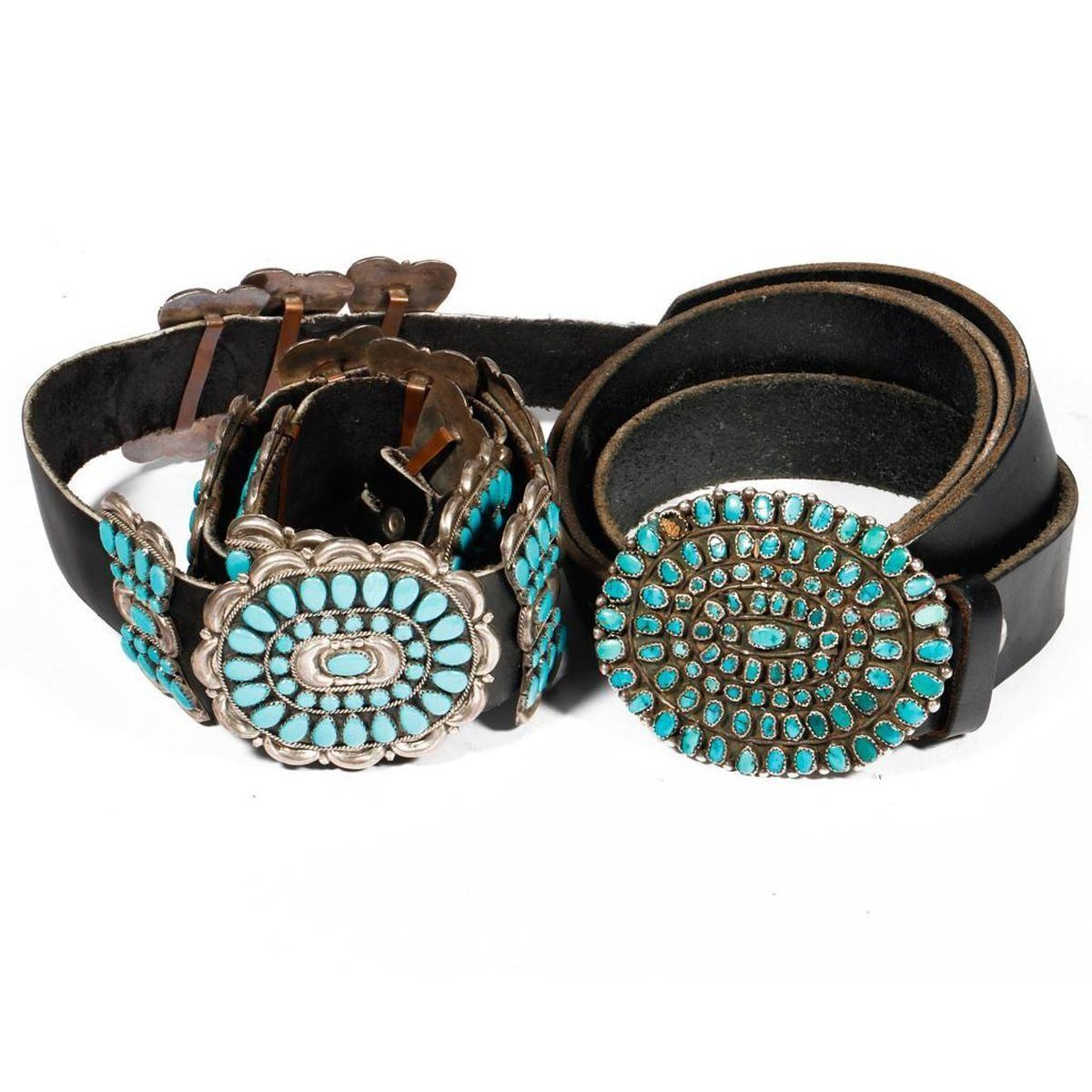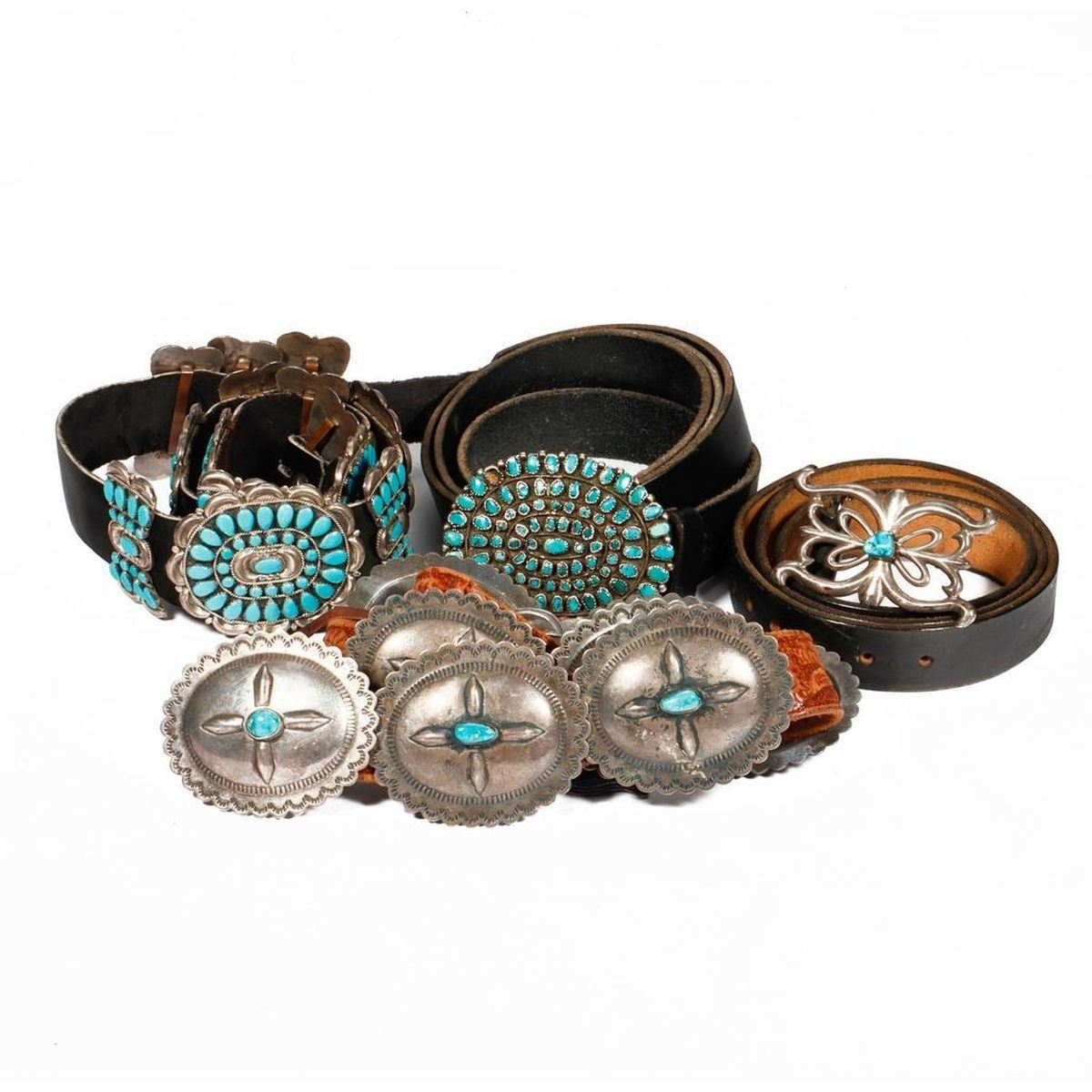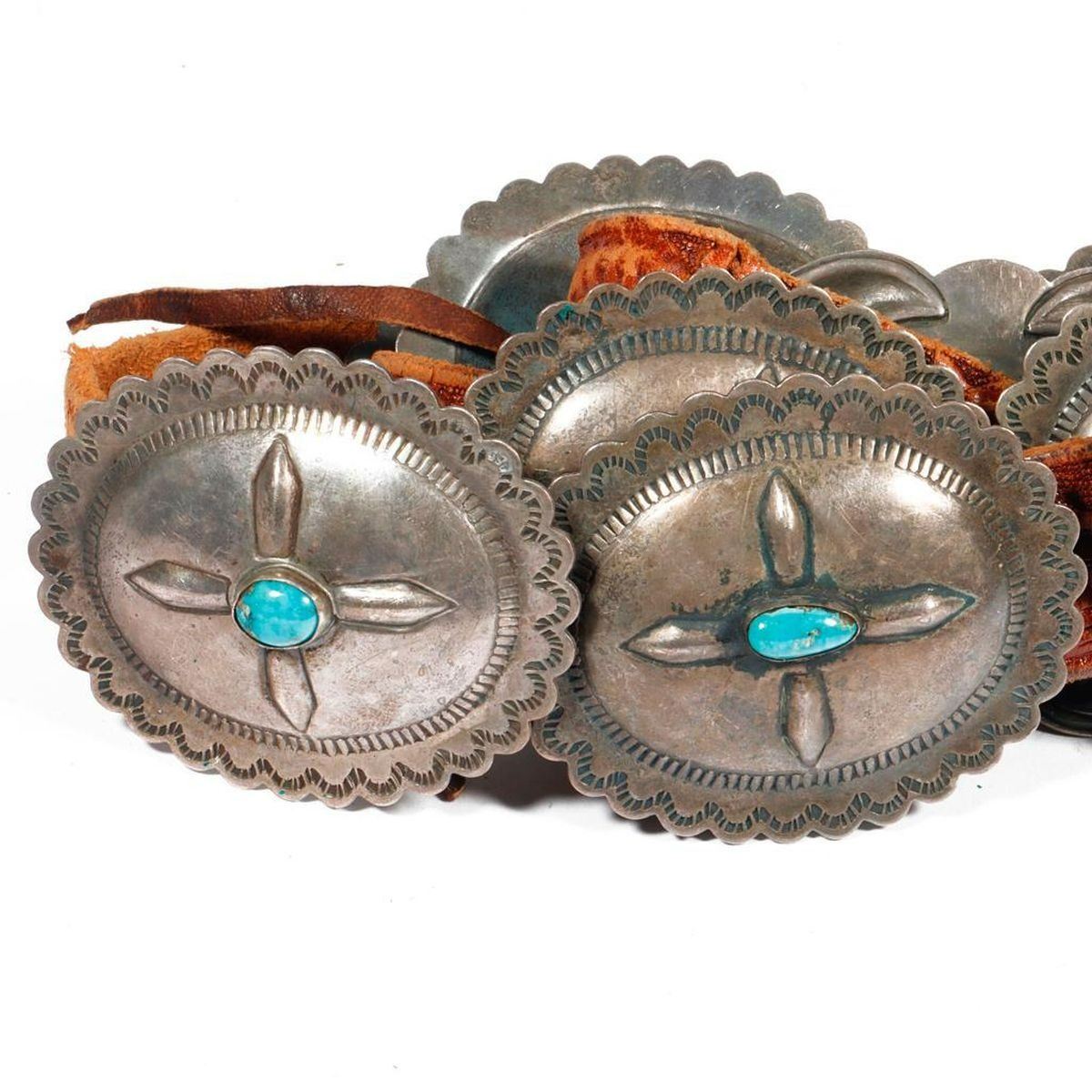 Group of Four Navajo Concho Belts. Consisting of one leather belt and a buckle with a single turquoise stone,measures 44in length. Second leather Belt with one multi stone turquoise buckle, measures 53in length. Third leather belt with 14conchos alternating shapes with mutli stoneturquoise conchos, measures 42in length. Fourth leather belt with 9conchos with stamping and single turquoise bead, and a buckle with two stones, one is cracked and missing part of one of the two stones,measures 40in length. Condition Report: All lots are sold as is and where is. Turner Auctions + Appraisals, LLC provides condition reports upon request to aid in your bidding decision. No statement regarding age, condition, kind, value, or quality of a lot, whether made orally at the auction or at any other time, or in writing in this catalog or elsewhere, shall be construed to be an express or implied warranty, representation, or assumption of liability. All sales are final, Turner Auctions + Appraisals, LLC does not give refunds based on condition. Turner Auctions + Appraisals, LLC does not perform any shipping or packing services. We do have a list of suggested shippers who gladly provide quotes prior to your bidding. Please visit our webpage for a list of recommended shippers.