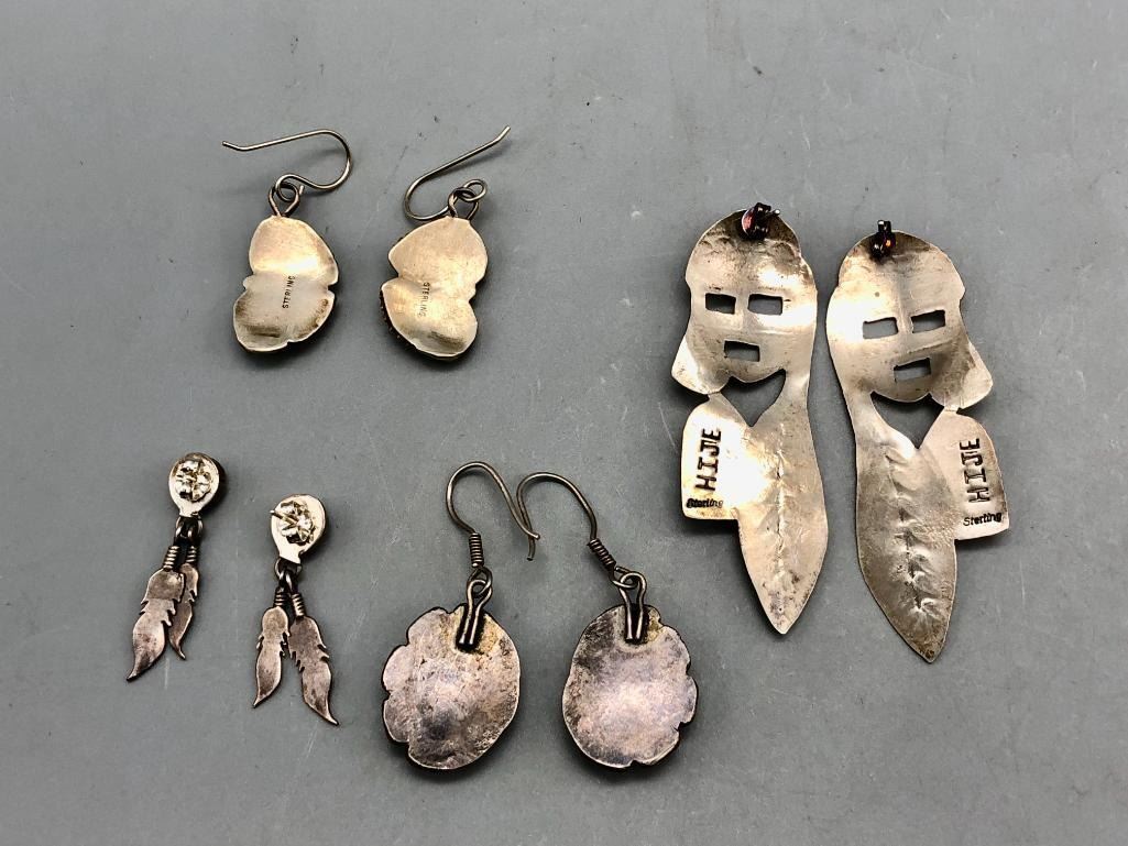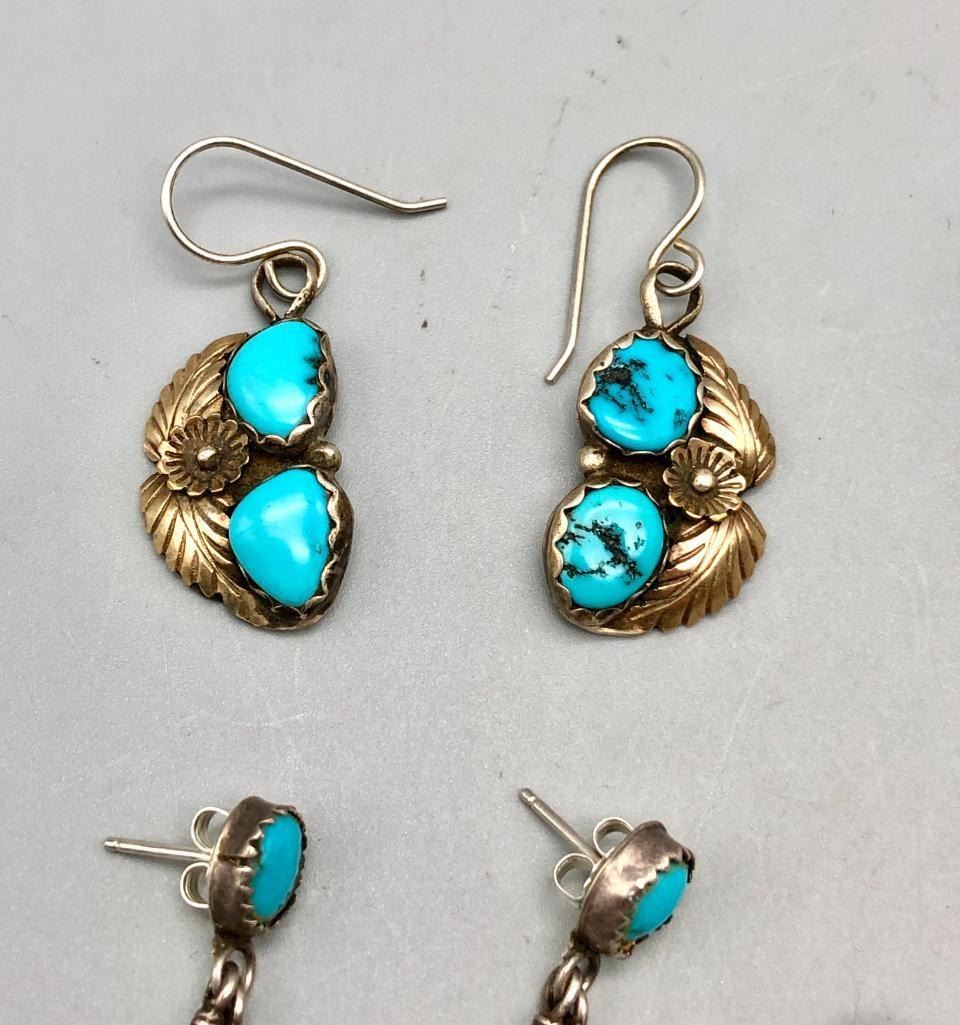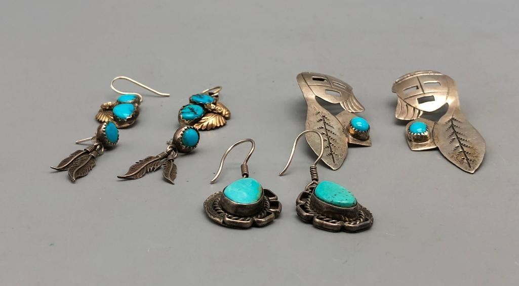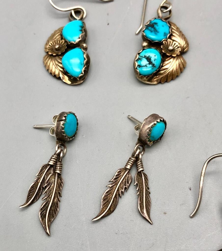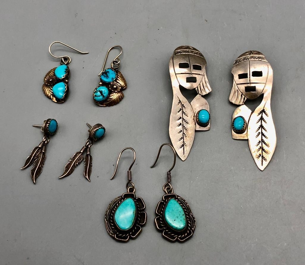 For sale in this lot is a group of four pairs of earrings. This is an awesome group of earrings! All are various sizes, styles and are set with turquoise stones. They all are made from sterling silver as well.