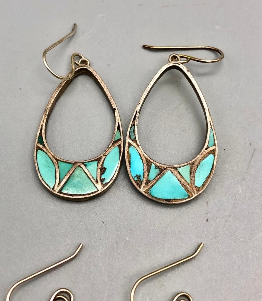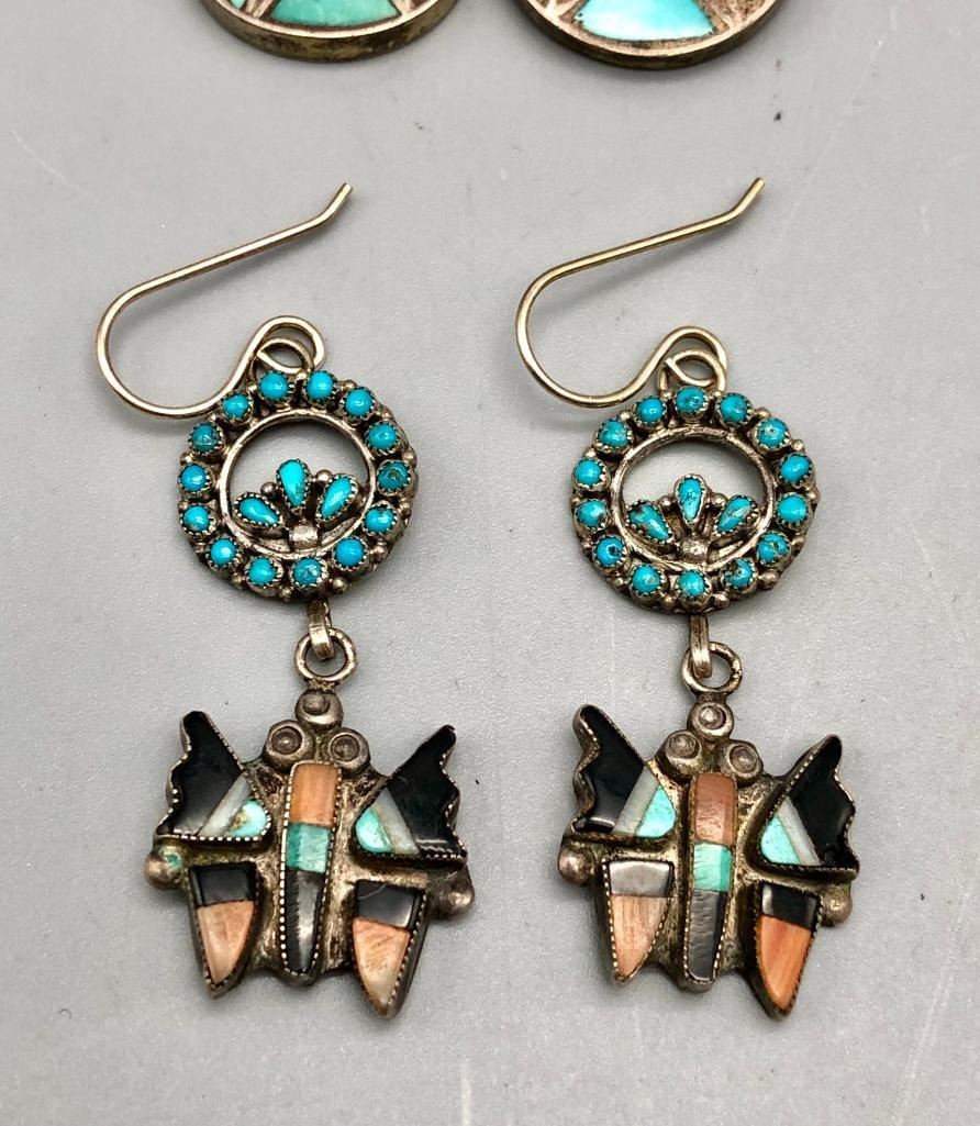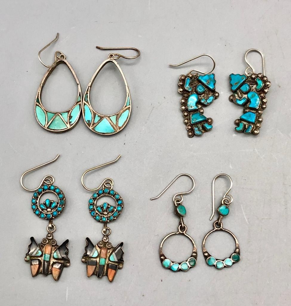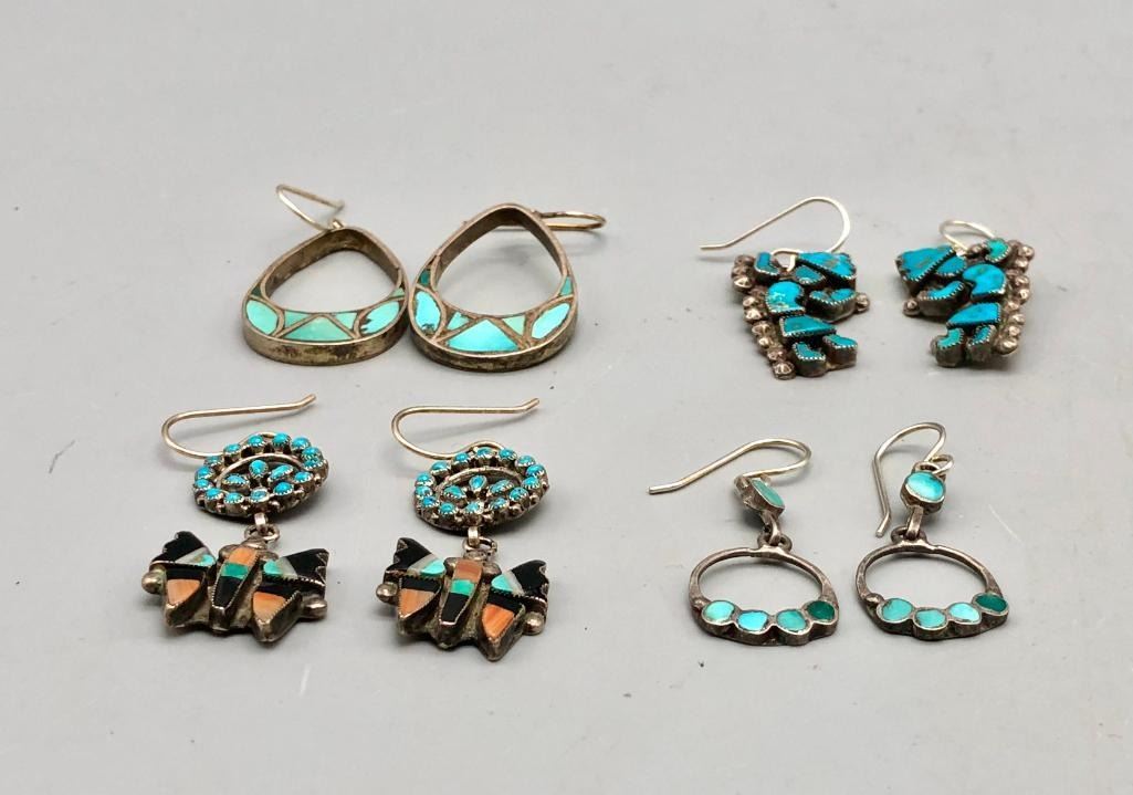 Offered for sale in this lot s a group of four pairs of vintage earrings. This is a great group of inlay style earrings. All are various sizes, styles and are made from sterling silver. MAKER: Various. APPROX AGE: Vintage. SIZE: Various. Combined weight is 35.5 grams. CONDITION: Good for their age, normal wear expected. Please look closely at the pictures as they are an important part of our description and are hereby incorporated into the description, specifically with regards to condition. SHIPPING: There will be a $5 handling / packaging fee for shipping this lot. The actual cost of postage will be added on top of that. BUY IT NOW: If you would like to buy this item now, without waiting for the auction day to bid on it, we do offer this option (which is available up to 48 hours before the actual auction starts). The “Buy it Now†price is the high estimate of this lot (plus applicable fees and the Buyer's premium is discounted to 10% when using the Buy it Now option). If you would like to exercise this option, you must contact us by email (or phone as long as you talk to someone live). Reference this lot number and your intention to "Buy it Now."