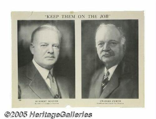 <B>Group of Four Presidential Campaign Posters</B></I> An interesting, mixed lot of posters including a Herbert Hoover and Charles Curtis re-election jugate from 1932, 22" x 16" in size, fine condition. Also from the 1932 election is a handsome "Keep Him on the Job" poster for Herbert Hoover, 16" x 22", fine condition. The 1928 election is represented by an Alfred E. Smith and Joe T. Robinson jugate, 24" x 20", condition only good with some tears and creases. Last is a 1936 Franklin Roosevelt and Henry Horner "Honest - Courageous - Independent" coat-tail poster showing Franklin D. Roosevelt and all the major Democratic candidates from the state of Illinois, 24" x 30", fine condition. Lot:263