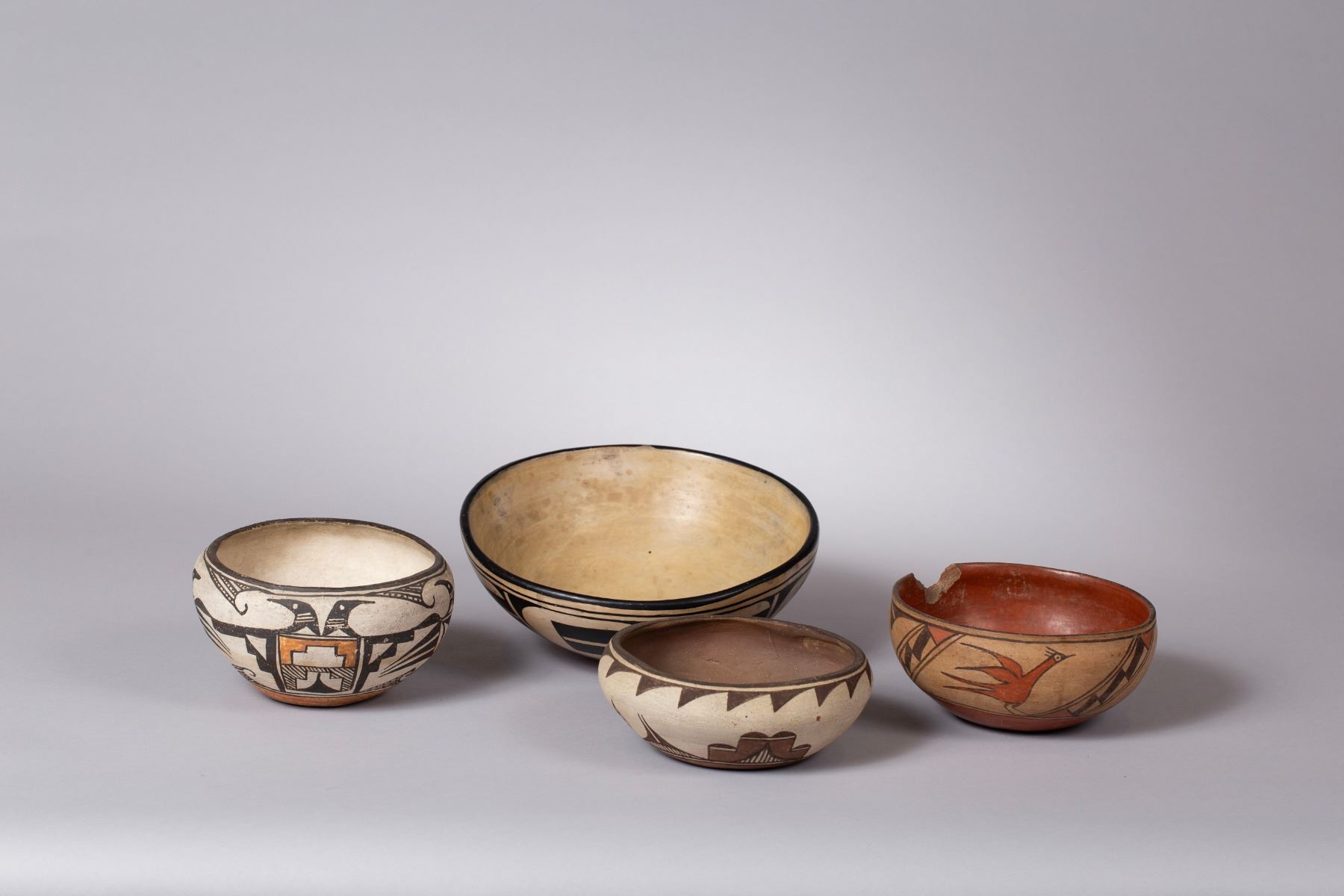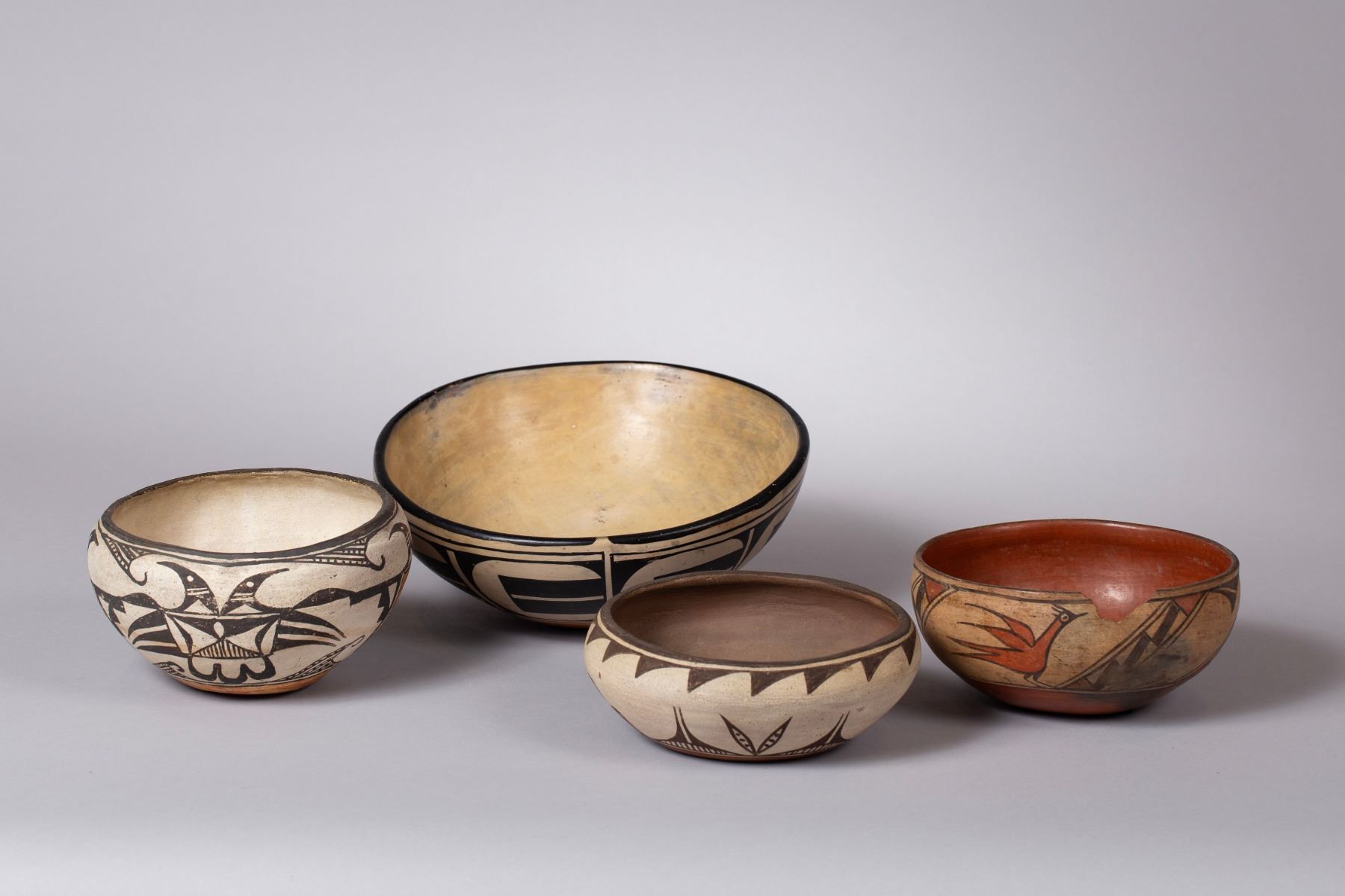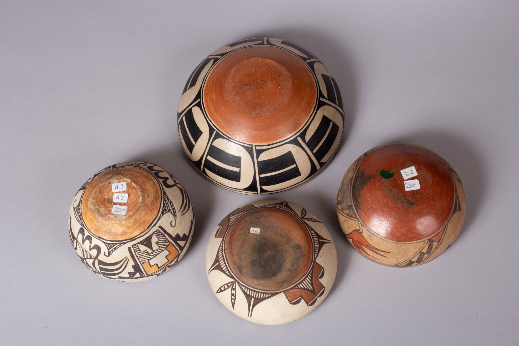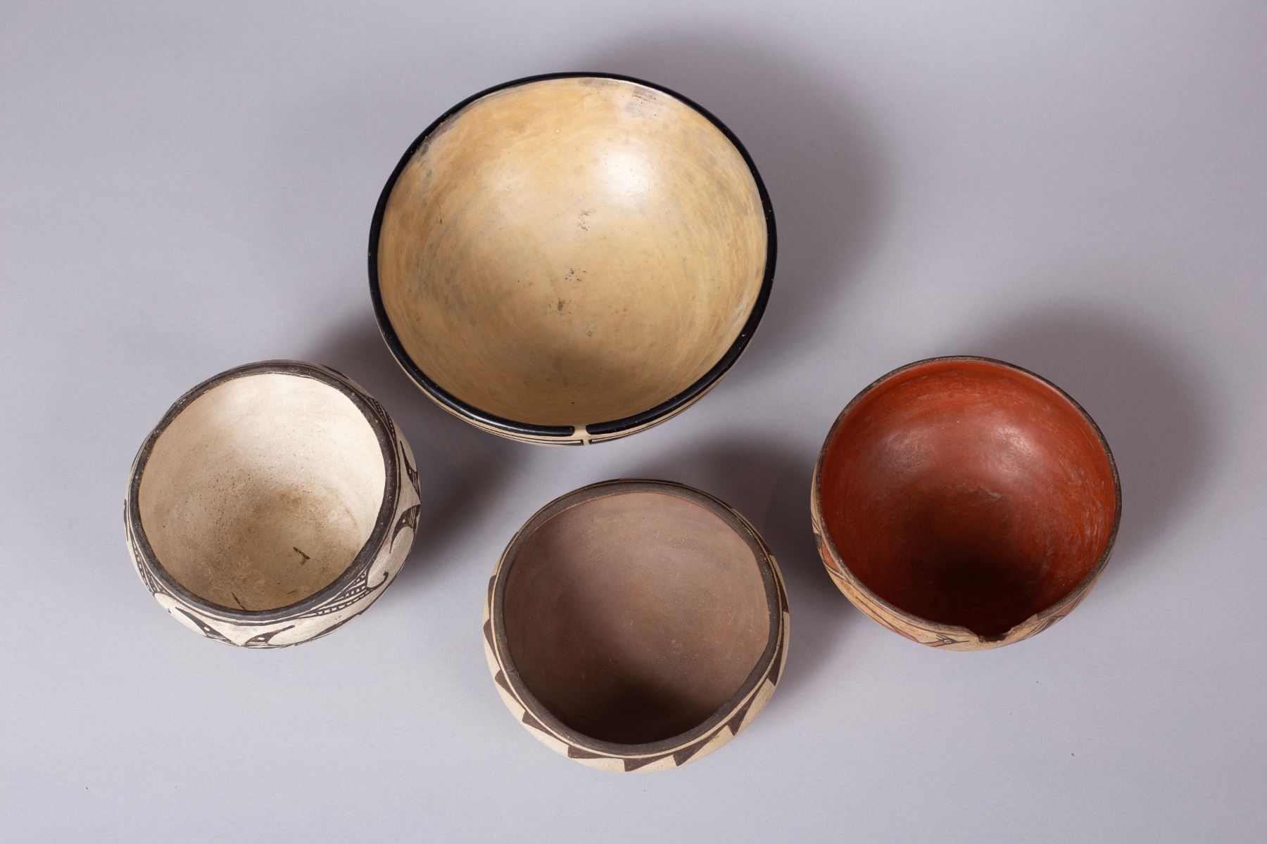 This collection features four hand-coiled pottery bowls crafted by a Pueblo artisan, displaying the unique aesthetic and craftsmanship of the tradition. The set includes a range of sizes, from a larger serving bowl to smaller vessels, each one showcasing the individuality of hand-built pottery. The largest bowl (D) offers a wide, open form suitable for a dough or serving bowl.