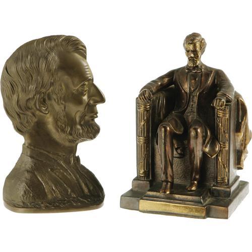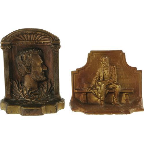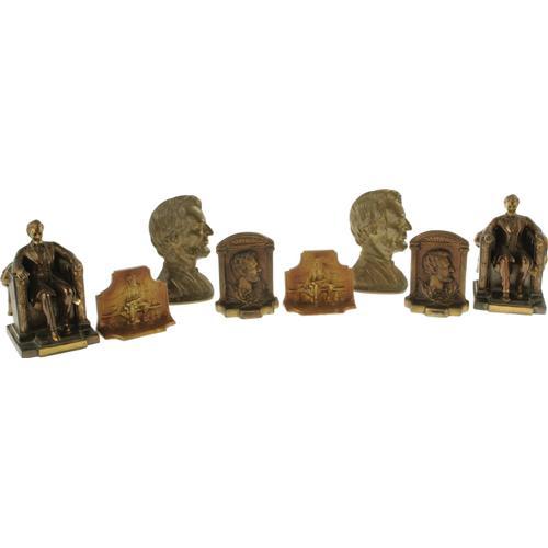<B>Group of Four Sets of Lincoln Bookends.</B></I> <B>1.)</B></I> Tombstone-shaped bronze-plated set of Lincoln in profile: each measures 4" wide x 2" deep x 5.5" tall. Some loss to the plating, but generally very good. <B>2.)</B></I> Copper-colored set of Lincoln sitting on a bench with capitol panorama behind him. Each measures 4.75" wide x 2.25" deep x 3.75" tall. Generally very good, with a few nicks. <B>3.)</B></I> Spelter set of Lincoln sitting in chair: each measures 4.75" wide x 4.5" deep x 7.25" tall. Marked on the back of each, "Dodge Inc. LA Chi NY". Very good condition. <B>4.)</B></I> Brass set of Lincoln profile bookends: each measures 4.25" wide x 1.5" deep x 7.25" tall. Very good condition. Superb lot of Lincoln bookends.<BR><BR><b>Shipping:</b> Miscellaneous Collectibles, Larg (<a target="_blank" href="http://www.heritageauctions.com/common/shipping.php">view shipping information</a>)