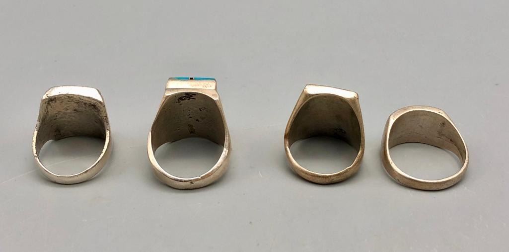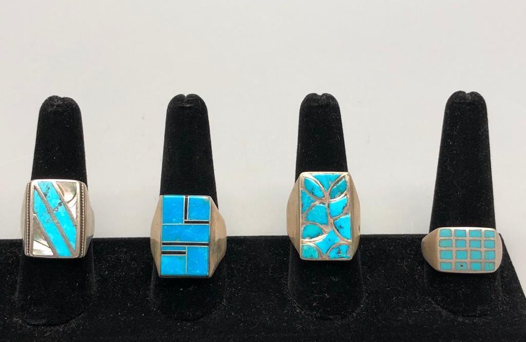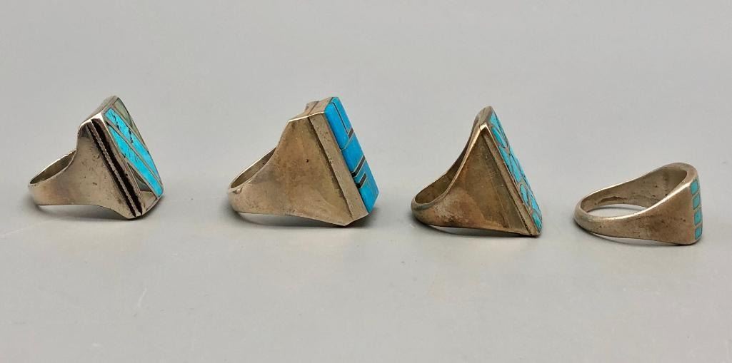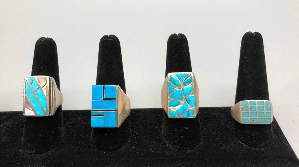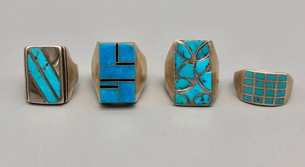 Offered for sale in this lot is a group of four turquoise inlay rings. All are various sizes and styles. All the rings are set with turquoise, other stones, and are made from sterling silver. MAKER/ARTIST: Various. APPROX AGE: Circa 1970s. SIZE: 9-12.5. Combined weight is 68.9 grams. CONDITION: Good for their age, normal wear expected. Please look closely at the pictures as they are an important part of our description and are hereby incorporated into the description, specifically with regards to condition. SHIPPING: There will be a $5 handling / packaging fee for shipping this lot. The actual cost of postage will be added on top of that. BUY IT NOW: If you would like to buy this item now, without waiting for the auction day to bid on it, we do offer this option (which is available up to 48 hours before the actual auction starts). The “Buy it Now†price is the high estimate of this lot (plus applicable fees and the Buyer's premium is discounted to 10% when using the Buy it Now option). If you would like to exercise this option, you must contact us by email (or phone as long as you talk to someone live). Reference this lot number and your intention to "Buy it Now."