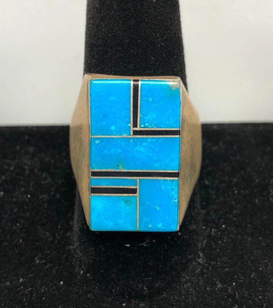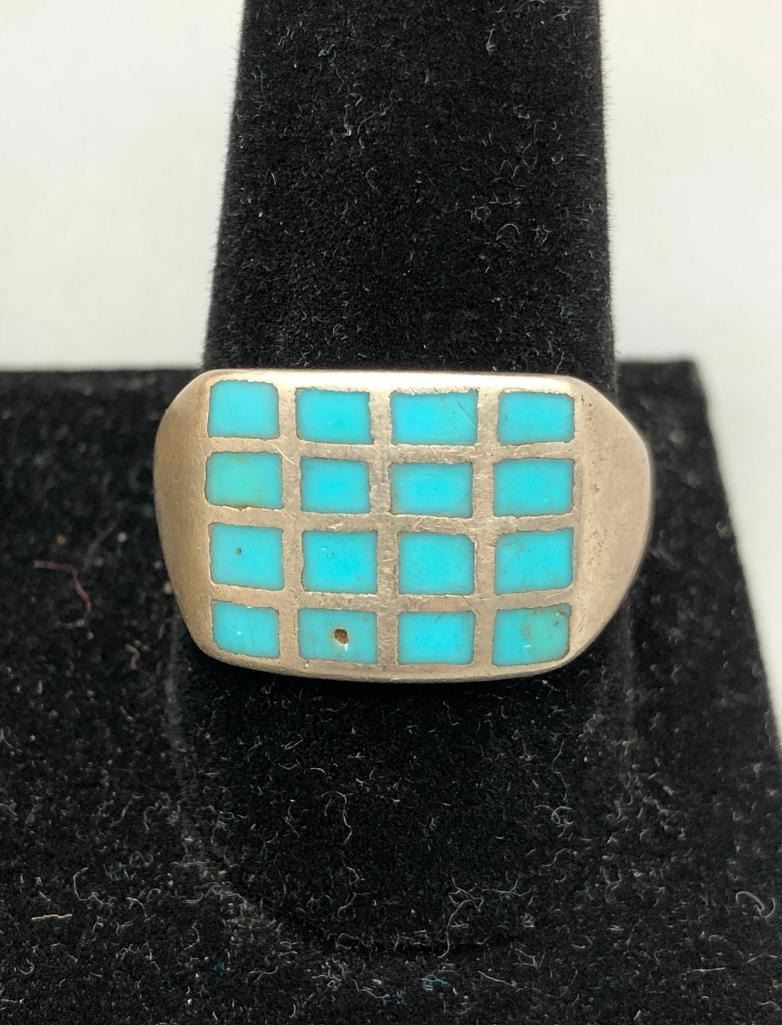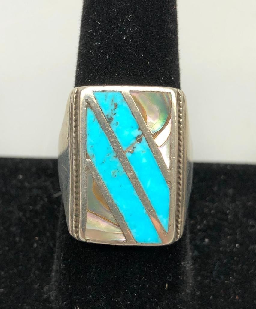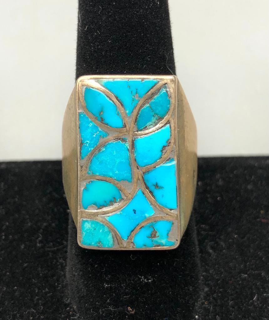 Offered for sale in this lot is a group of four turquoise inlay rings. All are various sizes and styles. All the rings are set with turquoise, other stones, and are made from sterling silver. MAKER/ARTIST: Various. APPROX AGE: Circa 1970s. SIZE: 9-12.5. Combined weight is 68.9 grams. CONDITION: Good for their age, normal wear expected. Please look closely at the pictures as they are an important part of our description and are hereby incorporated into the description, specifically with regards to condition. SHIPPING: There will be a $5 handling / packaging fee for shipping this lot. The actual cost of postage will be added on top of that. BUY IT NOW: If you would like to buy this item now, without waiting for the auction day to bid on it, we do offer this option (which is available up to 48 hours before the actual auction starts). The “Buy it Now†price is the high estimate of this lot (plus applicable fees and the Buyer's premium is discounted to 10% when using the Buy it Now option). If you would like to exercise this option, you must contact us by email (or phone as long as you talk to someone live). Reference this lot number and your intention to "Buy it Now."