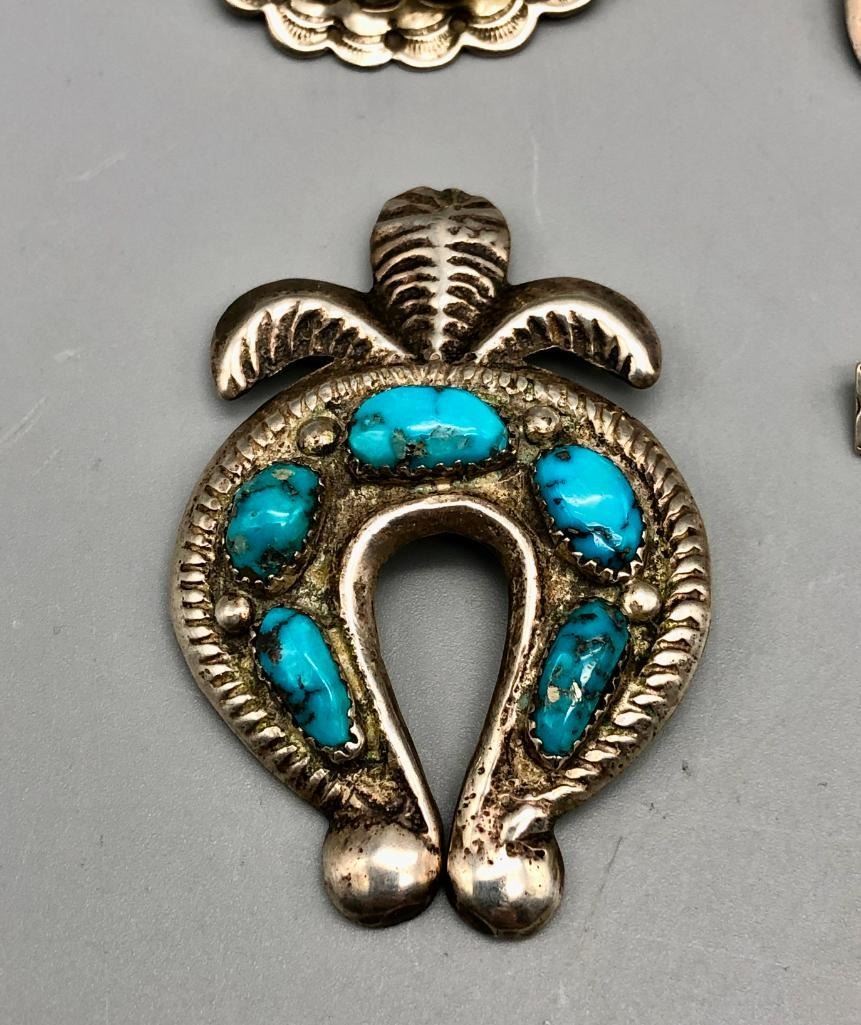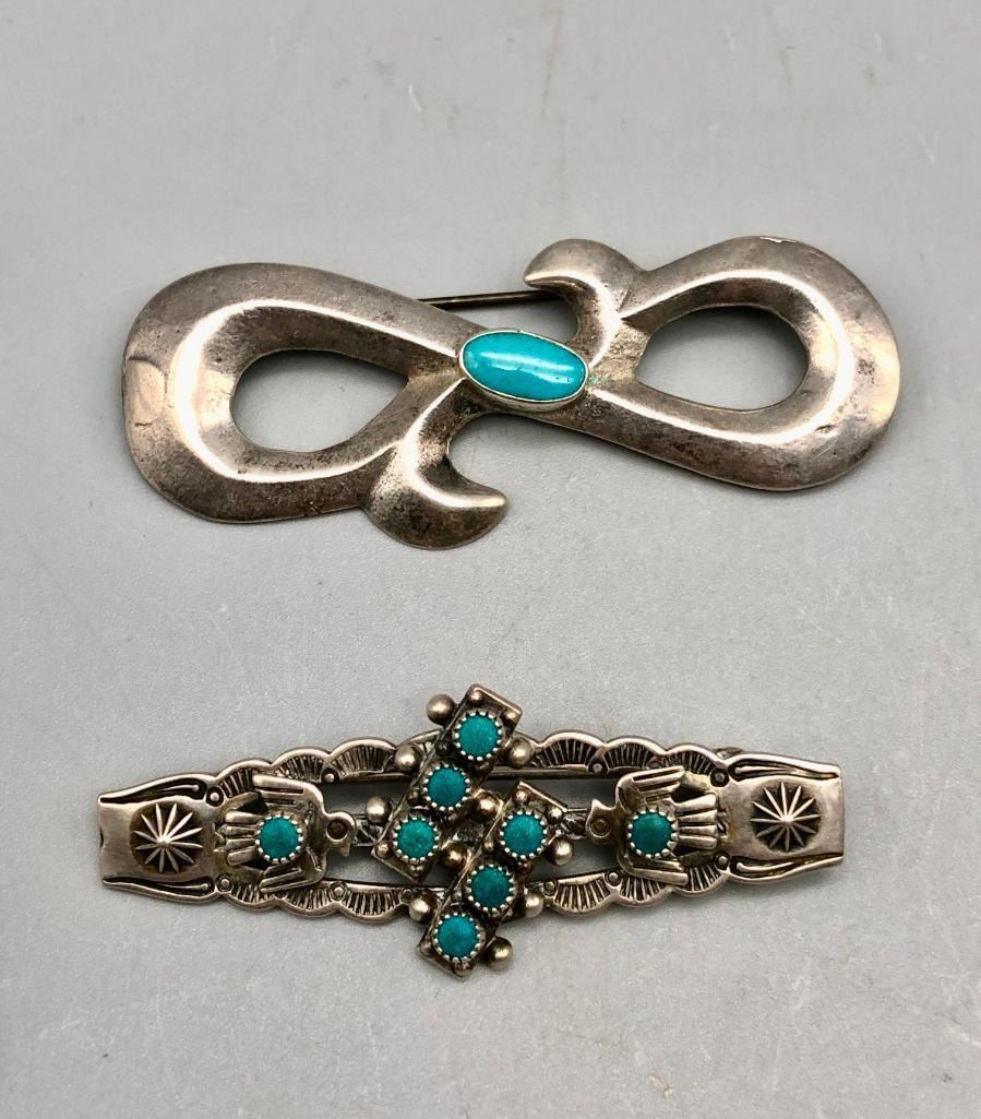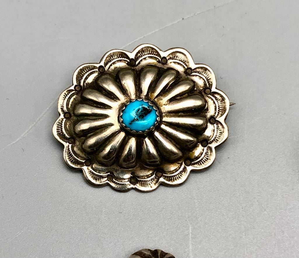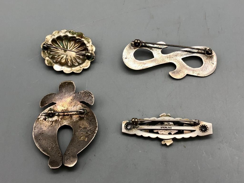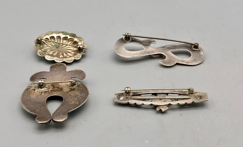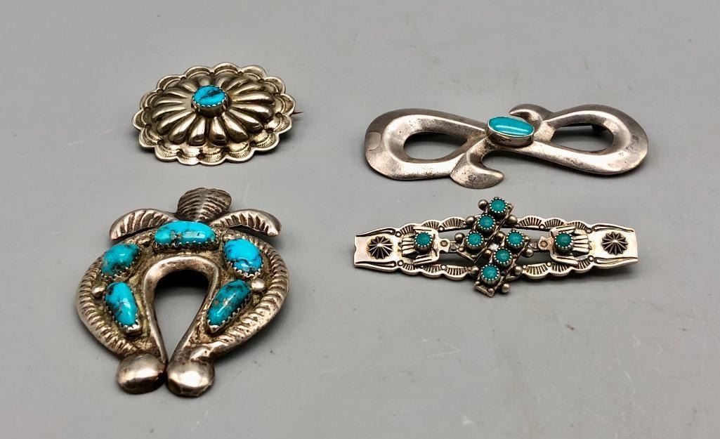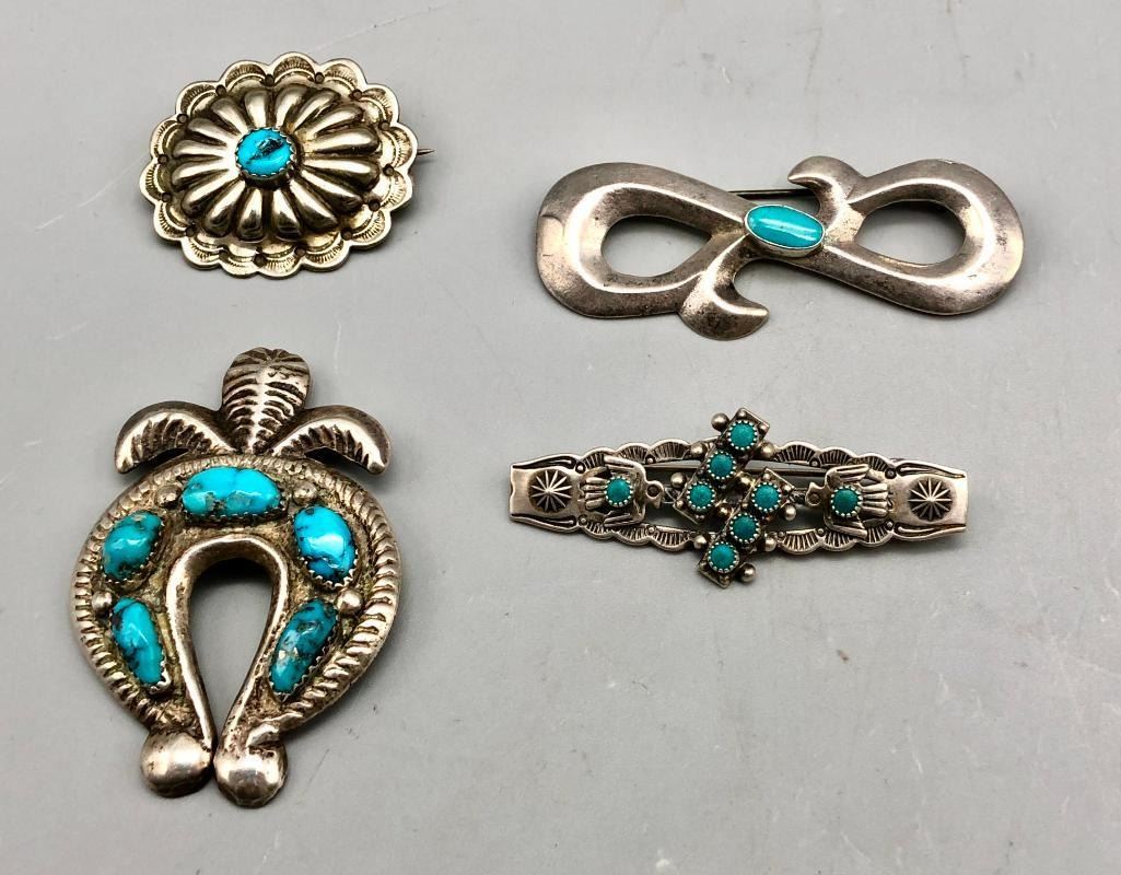 For sale in this lot is a group of four vintage sterling silver and turquoise pins. All are set with turquoise stones and are various sizes. This is a great assortment of pins and all are made from sterling silver. MAKER: Unmarked. APPROX AGE: Vintage. SIZE: Various. Combined weight is 47.8 grams. CONDITION: Good for their age, normal wear expected. Please look closely at the pictures as they are an important part of our description and are hereby incorporated into the description, specifically with regards to condition. SHIPPING: There will be a $5 handling / packaging fee for shipping this lot. The actual cost of postage will be added on top of that. BUY IT NOW: If you would like to buy this item now, without waiting for the auction day to bid on it, we do offer this option (which is available up to 48 hours before the actual auction starts). The “Buy it Now†price is the high estimate of this lot (plus applicable fees and the Buyer's premium is discounted to 10% when using the Buy it Now option). If you would like to exercise this option, you must contact us by email (or phone as long as you talk to someone live). Reference this lot number and your intention to "Buy it Now."