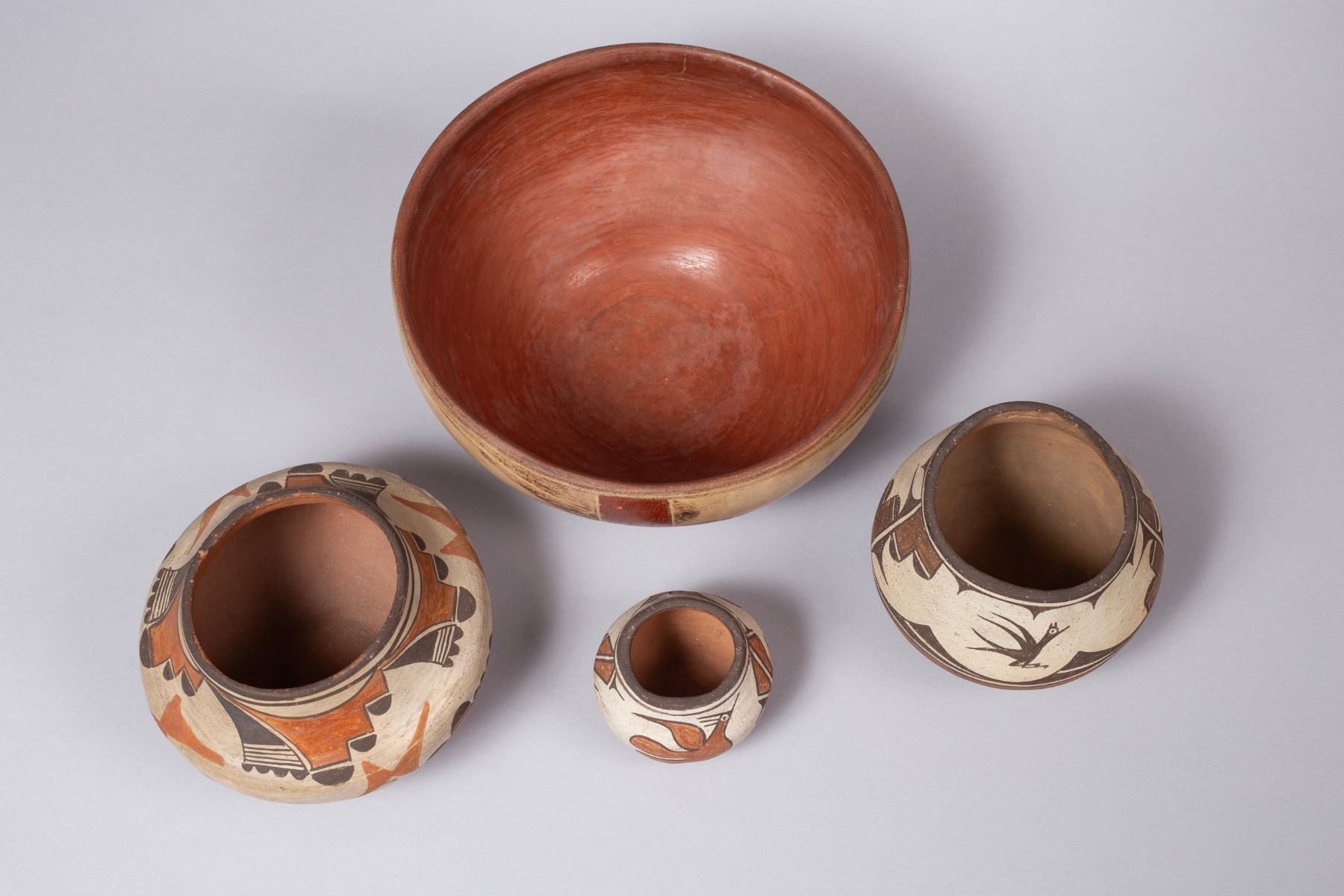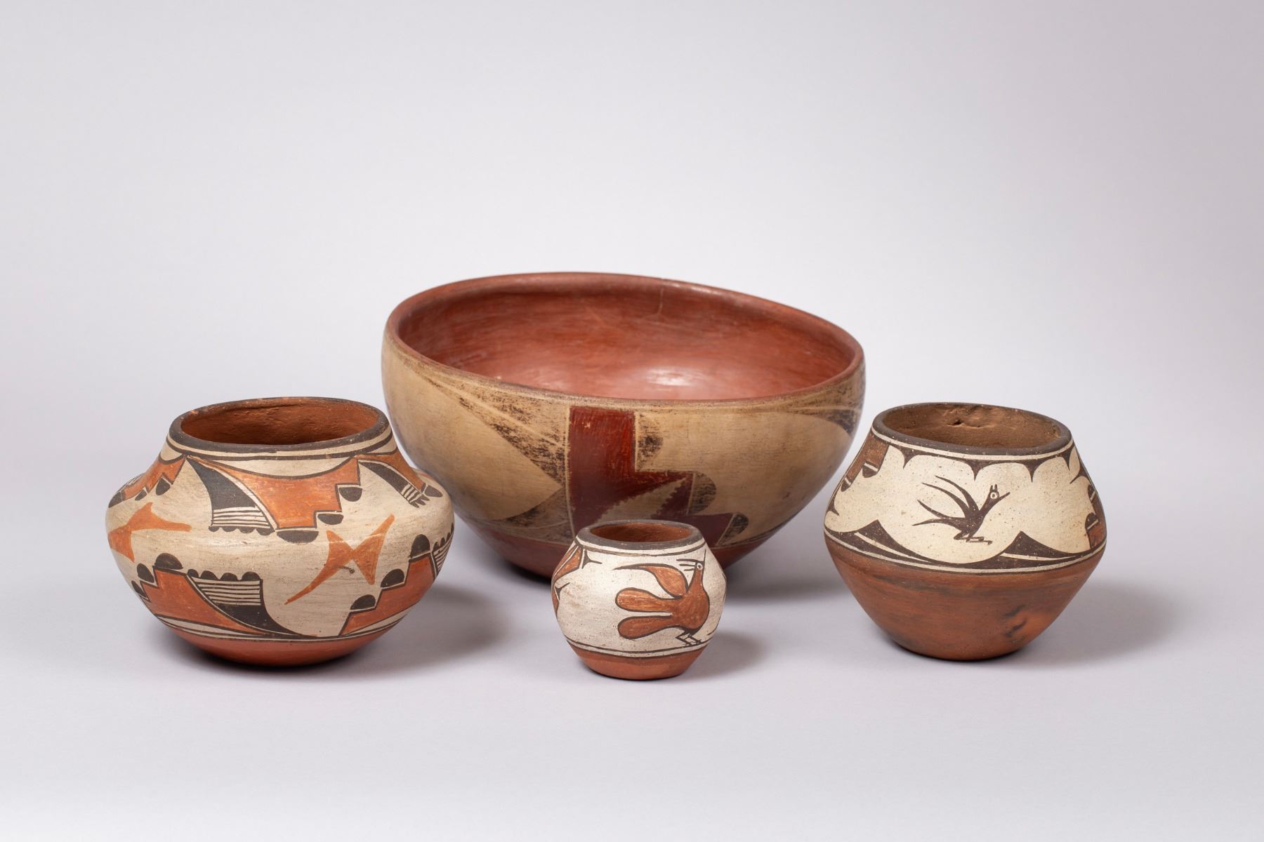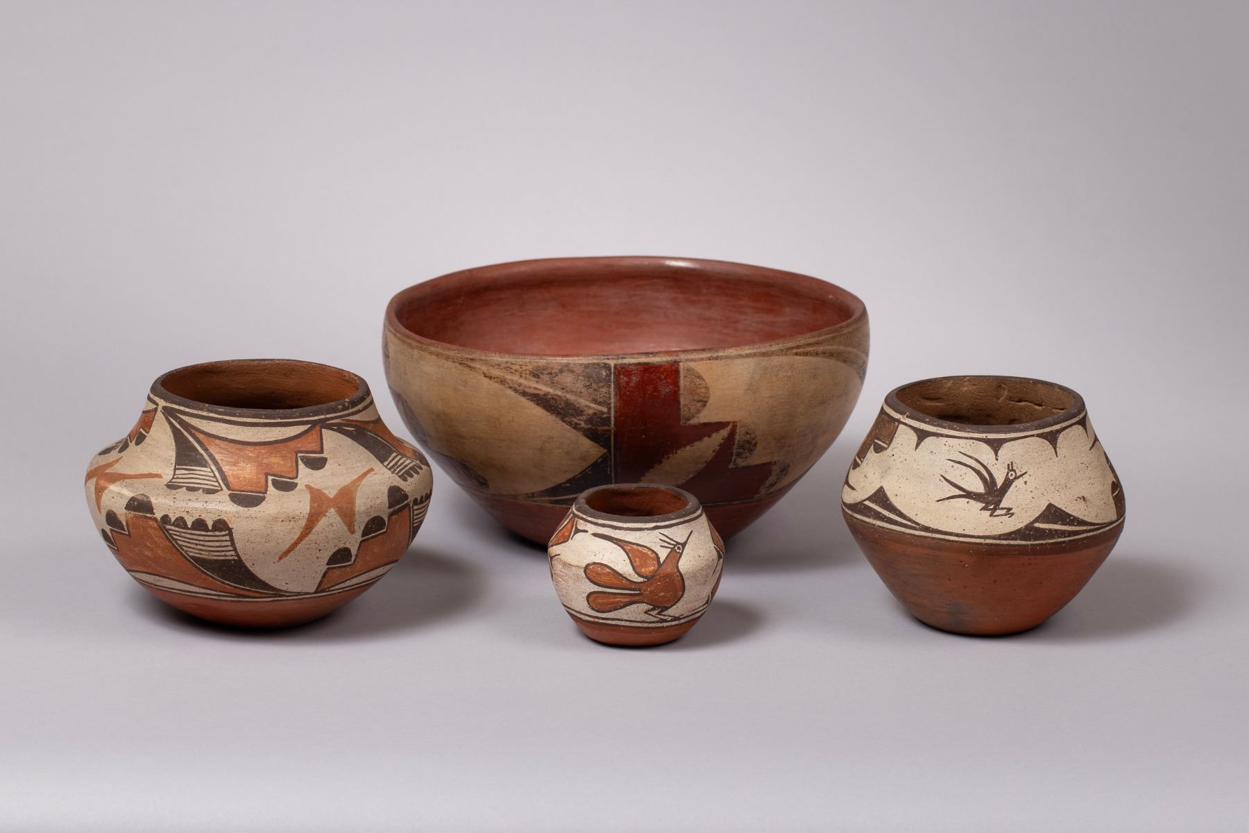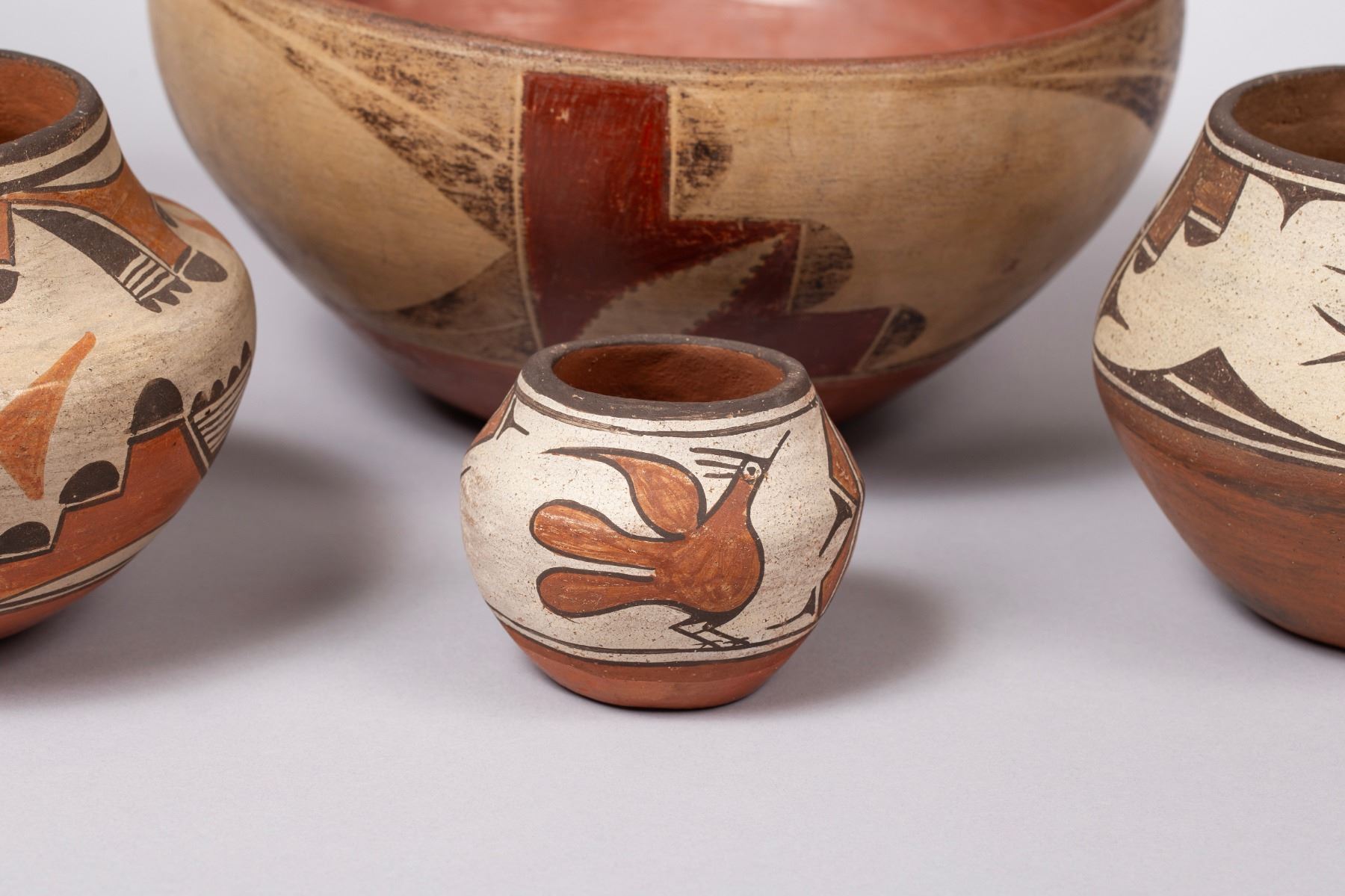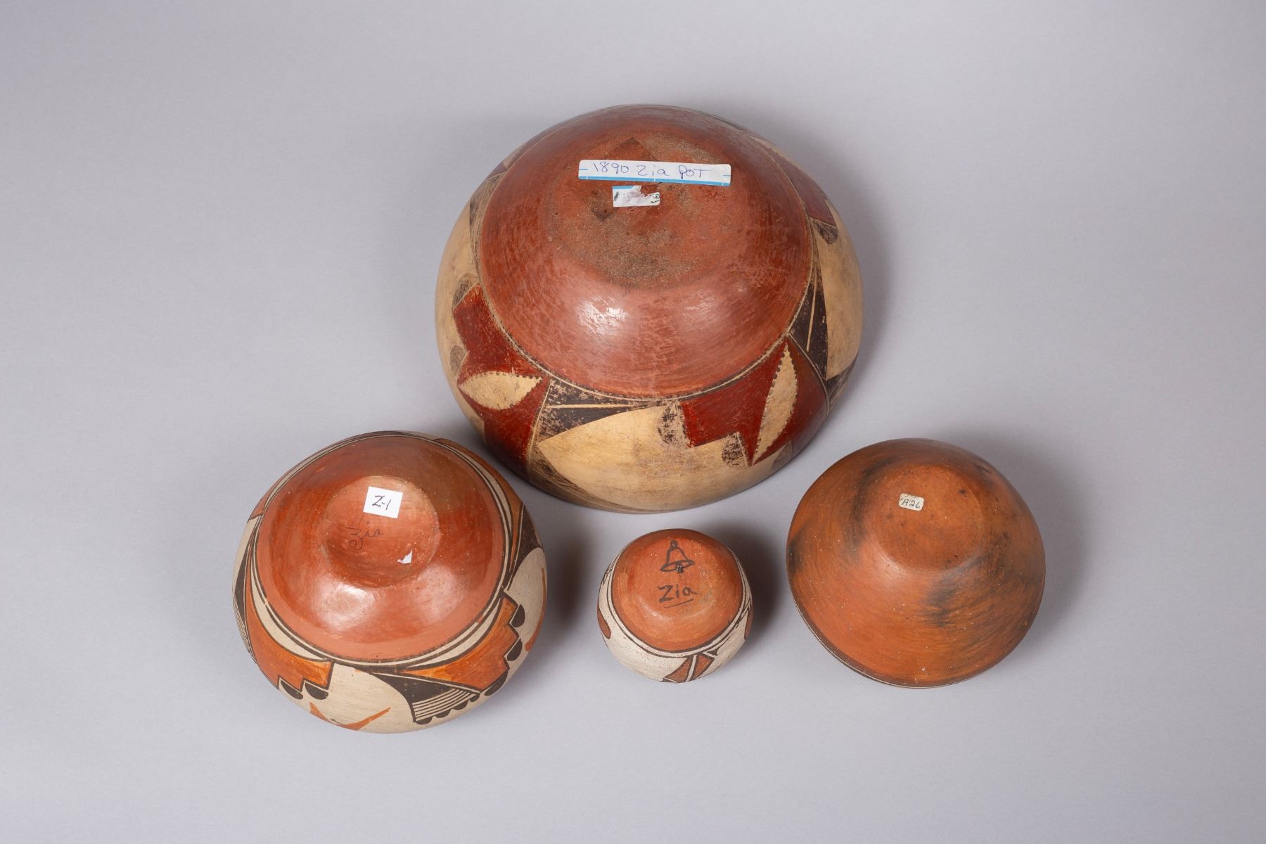 A collection of four Zia Pueblo polychrome pottery vessels. This group includes a miniature seed pot, two mid-sized jars or bowls, and a larger, shallow bowl or olla. Painted with traditional Zia motifs on a cream-colored slip, including the iconic Zia bird design. Dimensions noted are approximately: