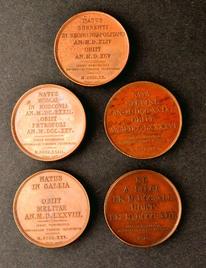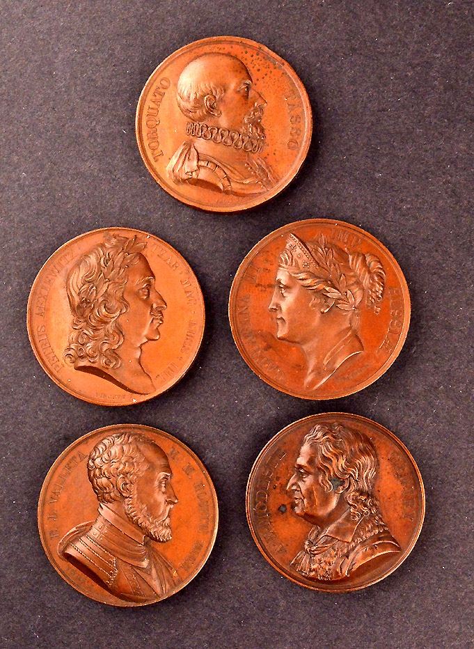 France, series of medals from the Series Numismatica Universalis Virorum Illustrium, by Durand, struck between 1817 and 1826. All are Ae and measure 41 mm: (1)- A.E. Modeste Gretry, by Grerard, 1818, EF, spot; (2)- Torquato Tasso, by Caque, 1820, VF, spots, edge bump; (3)- Petrus Aexiewitz, Tzar of Russia, by Pingret, 1823, FDC; (4)- F.J. Valletta, by Vivier, 1825, EF; (5)- Catherine II, Tzarina of Russia, by Pingret, 1826, EF; total 5 medals.