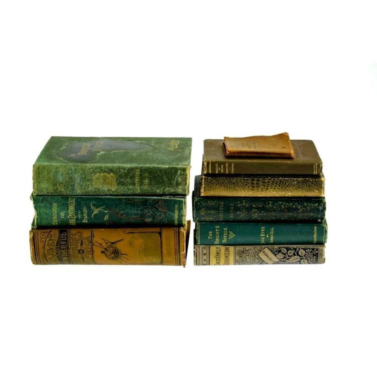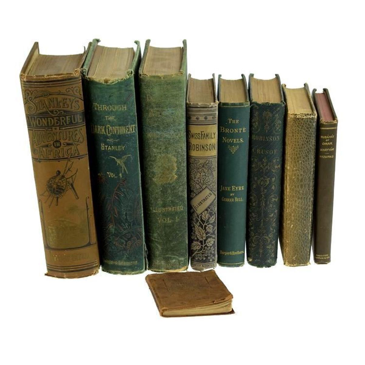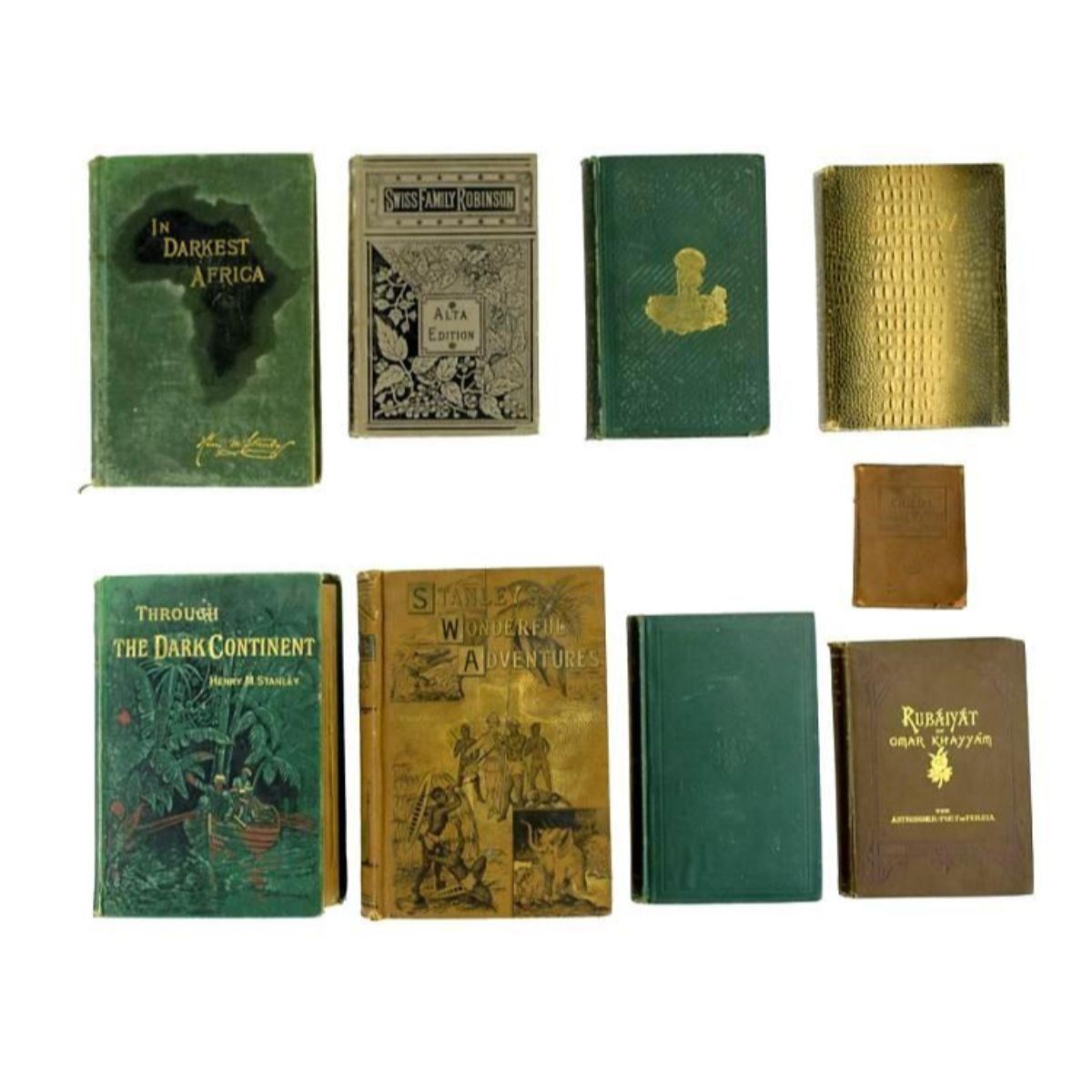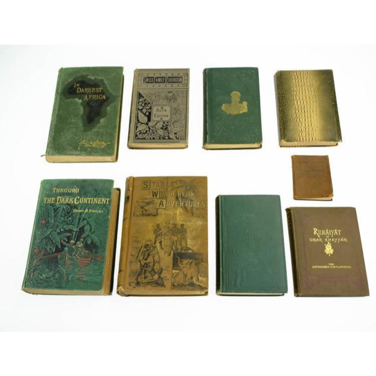 Group of nine decorative antique estate books feature literature & poetry subjects, as shown in the corresponding images. A sample of titles in this group includes: "Rubaiyat of Omar Khayyam;" "Through the Dark Continent" Vol. I by Henry M. Stanley; "In Darkest Africa" Vol.I by Henry M. Stanley; "Jane Eyre;" "Robinson Crusoe;" & "Swiss Family Robinson." "Poems" by James Russell Lowell is decoratively bound in an alligator pattern. Â ** some volumes show moderate to significant signs of age & wear with rubbing to the boards, age-toning, & cracked hinges. The Stanley books are coming partially disbound. - 10401-050518-IN-02165