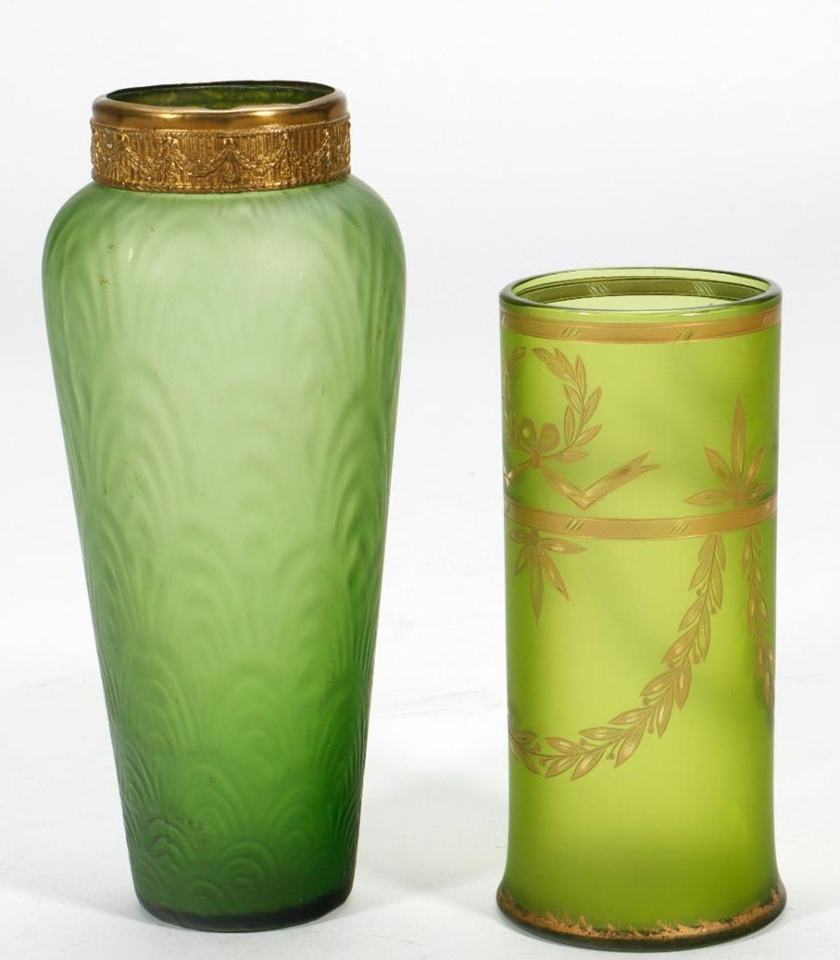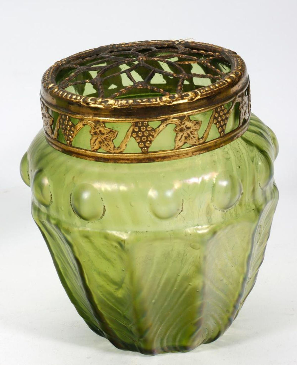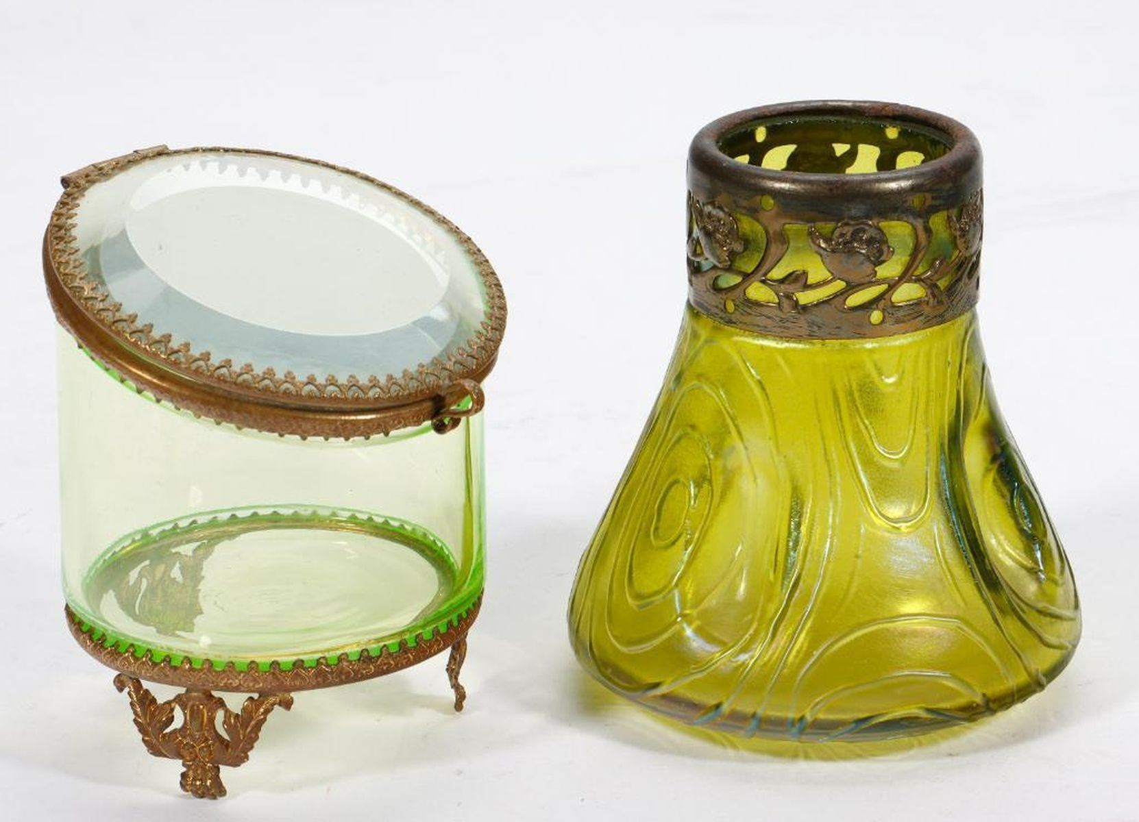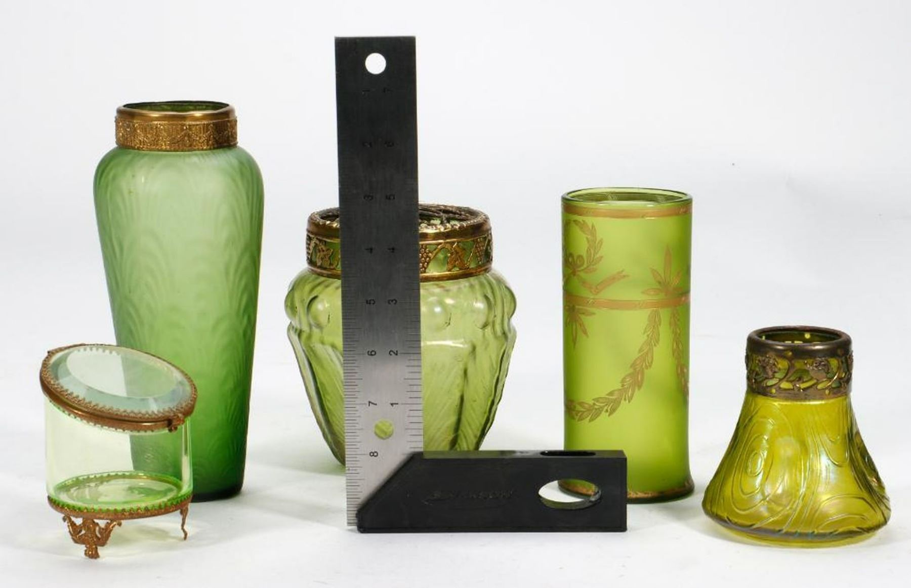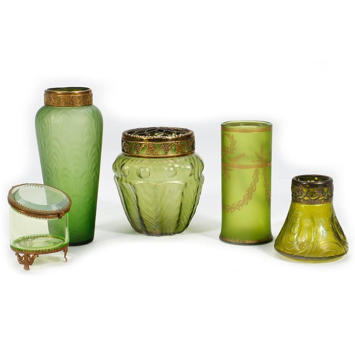 The small Art Nouveau jar is iridescent green with a gilt-metal openwork floral rim band (note: chip on bottom of jar); together with a large iridescent green potpourri jar with gilt-metal grape motif openwork lid; a cylindrical gilt-painted vase; a gilt-metal rimmed vase; and a pale green glass and gilt-metal box. Condition: The chip on the bottom of the small jar includes a hole, and the gilt is largely worn off the rim band. The others with some wear to guilt, but otherwise good condition.