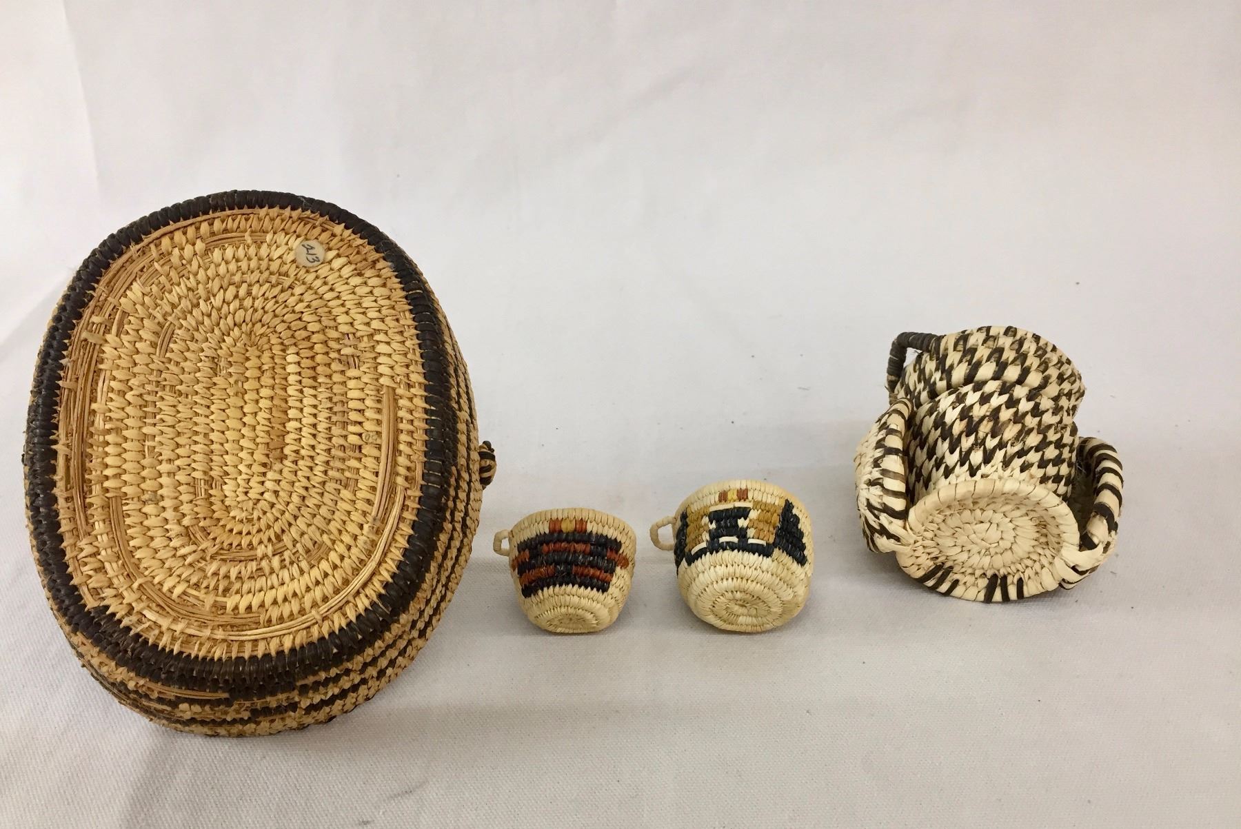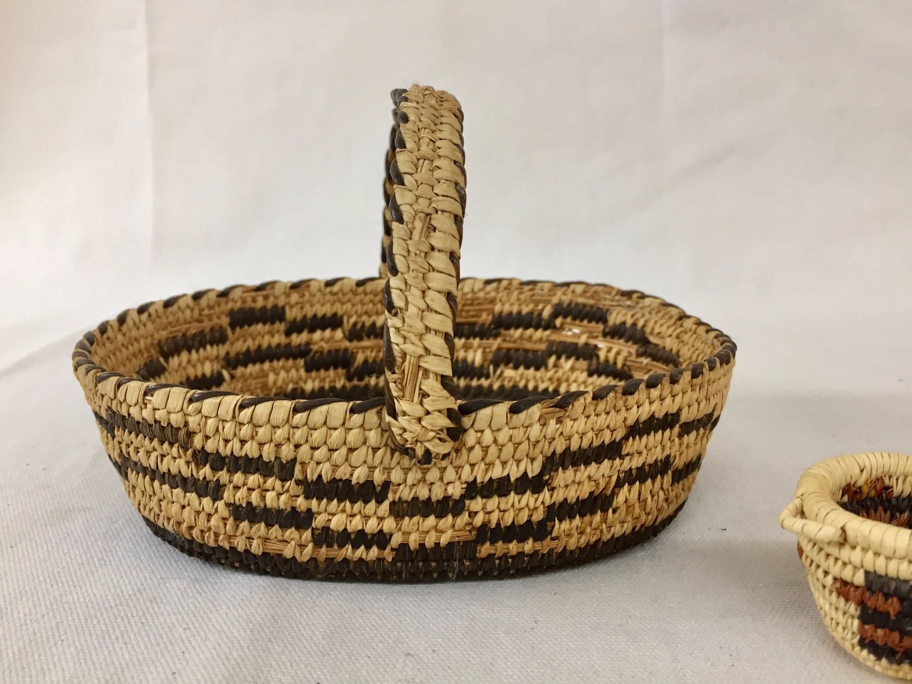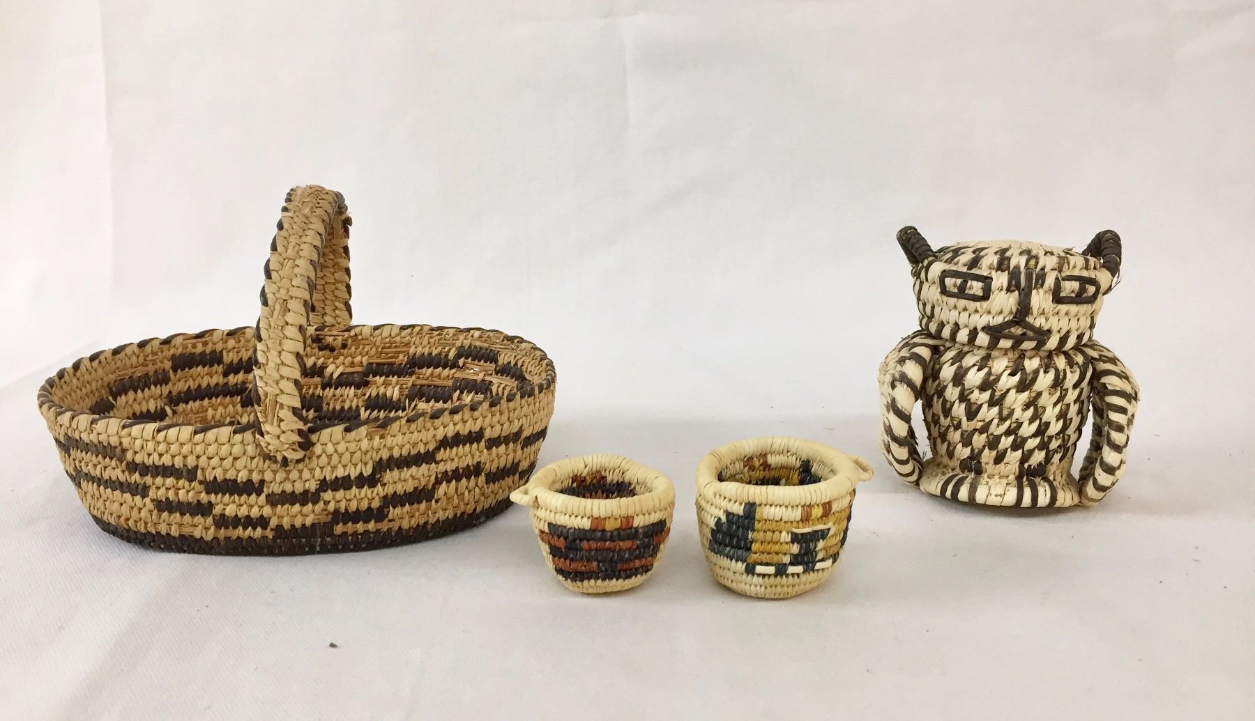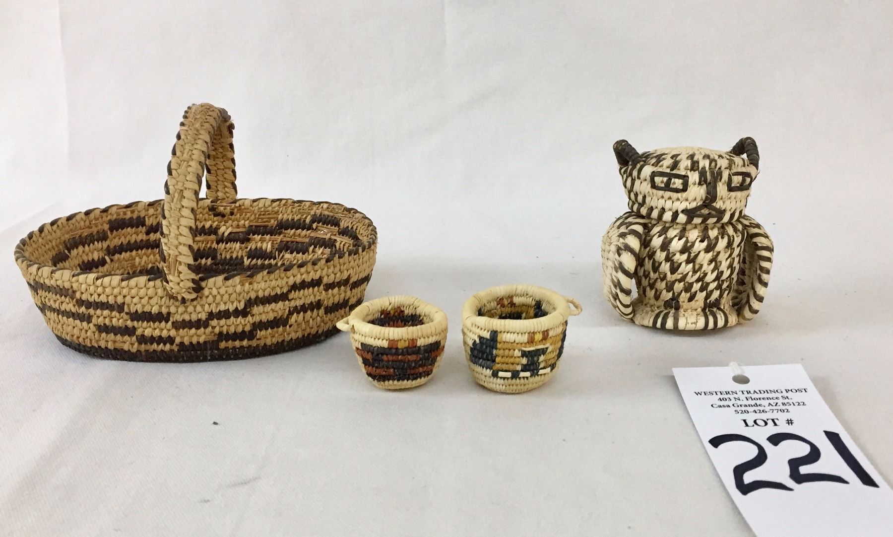 Description: Group of smaller sized, Hopi and Tohono O’Odham baskets. One is an owl effigy. Maker: Various Hopi and Tohono O’Odham Artists. Approx. Age: Vintage. Size: From 6-1/4”w x 3-3/4” tall to 1-1/2” x 1-1/4” tall. Condition: Good for its age, normal wear expected. Please look closely at the pictures - they are an important part of our description. Shipping: There will be a $7 handling / packaging fee for shipping this lot. The actual cost of postage will be added on top of that.