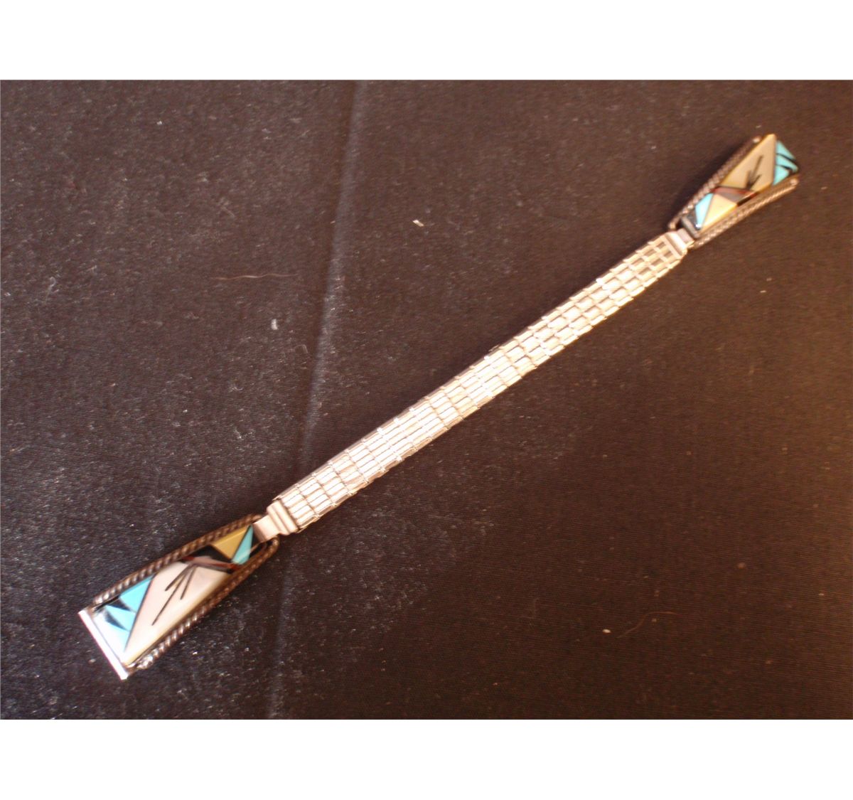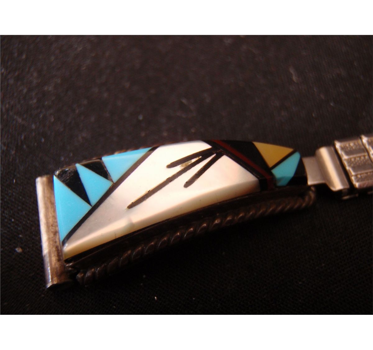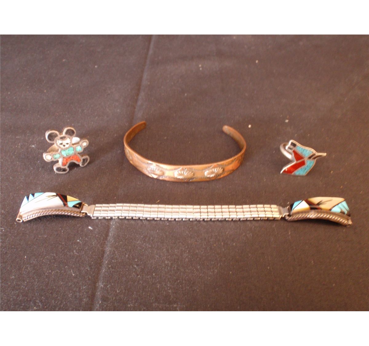 Ladies inlay watch tips, Zuni. Signed "T&J". + A copper bracelet by Bell. + Chip inlay horse head ring. Size 5.5 + Chip inlay mickey mouse ring size 5.5. Shipping on this lot: $5.00. Additional Shipping Charges for Lots sent outside of the U.S