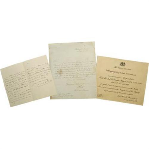 <B>Group of Three Items Signed by British Diplomats</B></I>. Includes a three page autograph letters signed by the aide de camp to the British Consul in Havana, March 28, 1885, on British Consulate letterhead, fine; a one page autograph letter signed by the principal librarian at the British Museum (A. Pavisse?), April 25, 1865, with the usual folds, toned at the edges, else very good; and a mentioned in dispatches document dated November 7, 1917 with a printed Winston Churchill signature, mounted to a stiff backing board, good condition. <I>Ex. Henry E. Luhrs Collection</B></I>.<BR><BR><BR><b>Shipping:</b> Flat Material, Small (<a target="_blank" href="http://www.heritageauctions.com/common/shipping.php">view shipping information</a>)