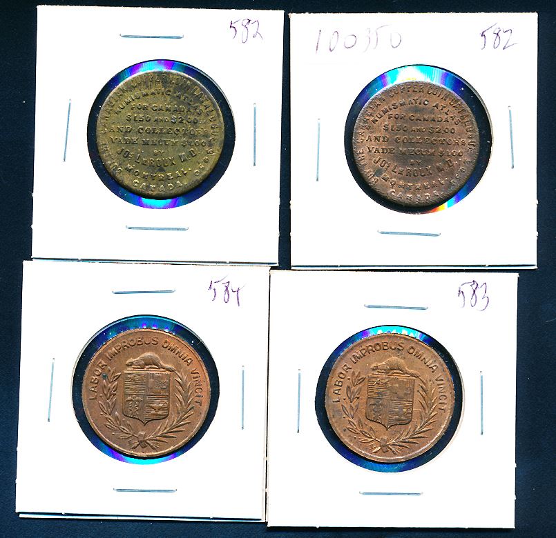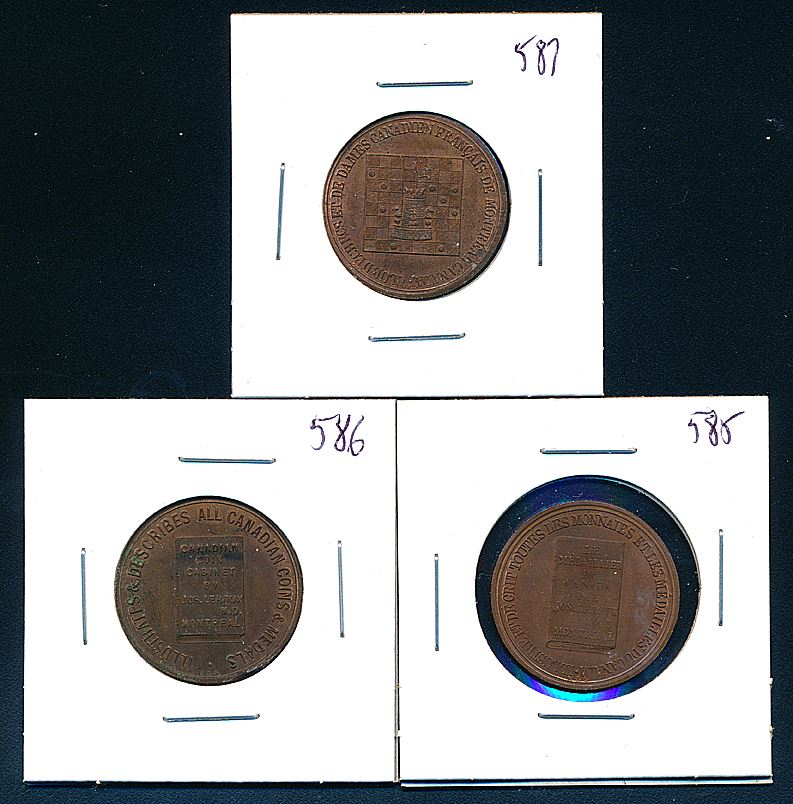 Numismatic Atlas, Br.582, Ae, Unc; Brass, AU, corrosion; Copper Coin Cat., French, Br.583, Ae, ??, Unc.; English,Br.584, Ae, ??, Unc.; Le Medaillier du Canada, Br.585, Ae, ??, AU; Canadian Coin Cabinet, Br.586, Ae, ??, AU; Checker Club, Br.587, Ae, ??, Unc; Total 7 pcs.
