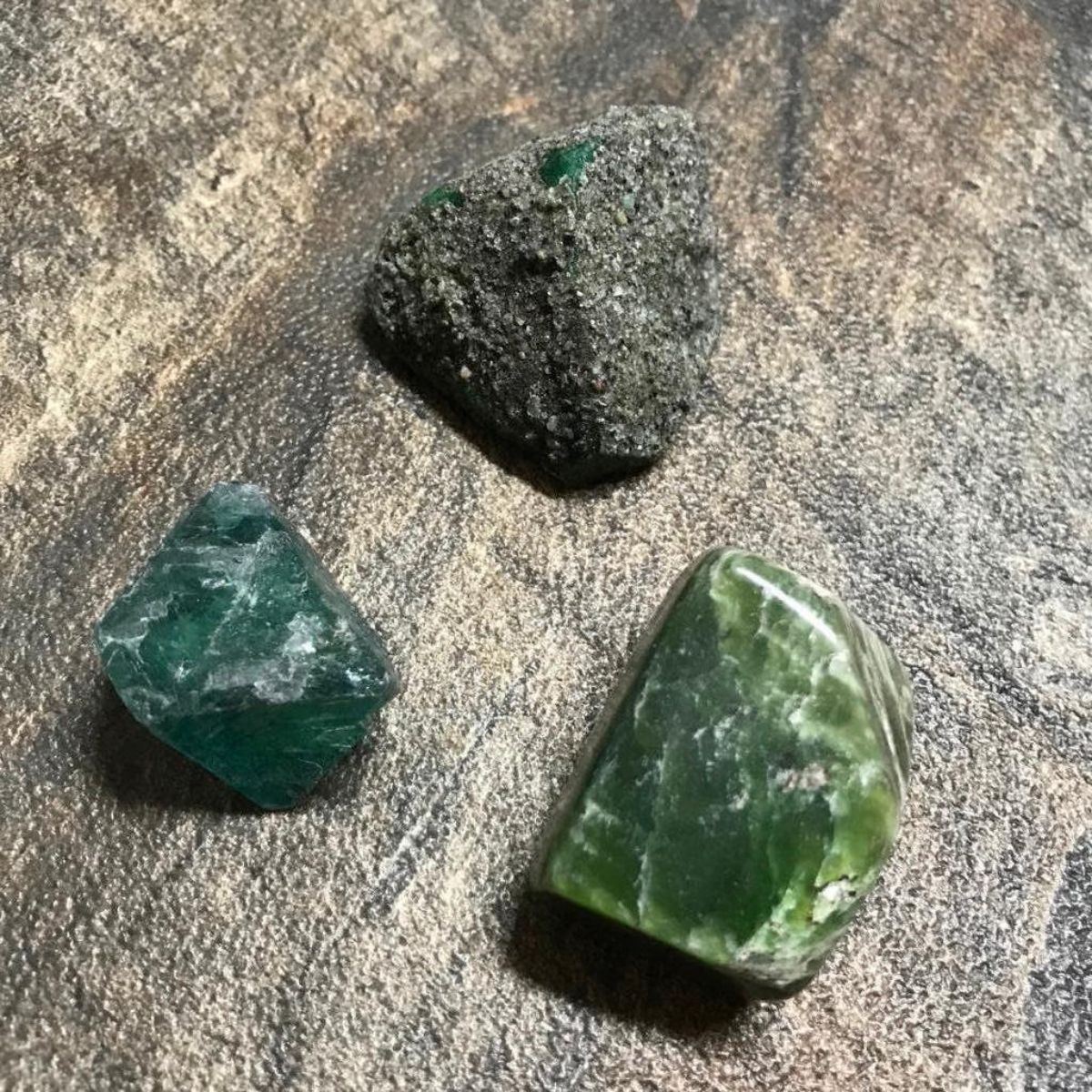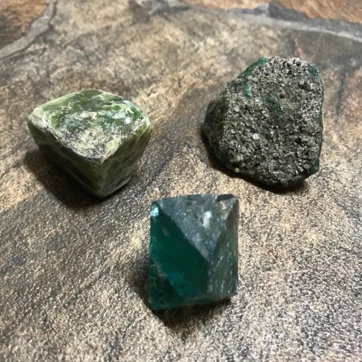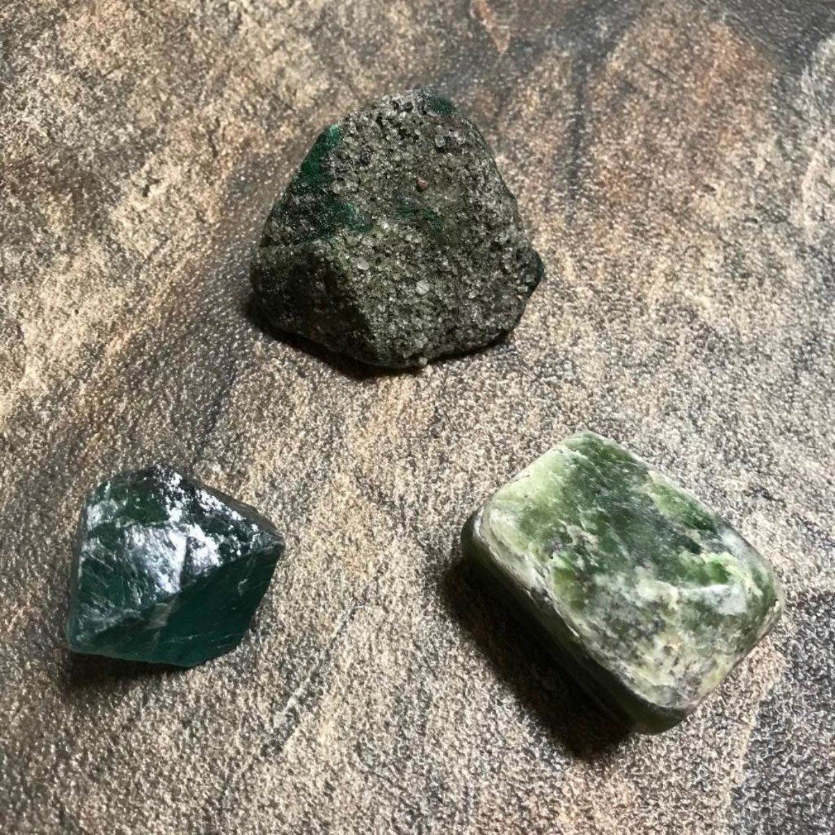 Group of large size ( 1 1/4" - 2" ) rough green gemstones, emerald in matrix, flourite & chrysoprase or calcite. Lovely display specimens.Â