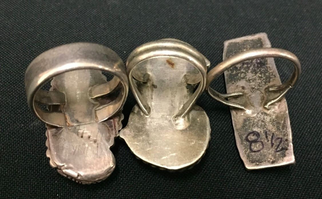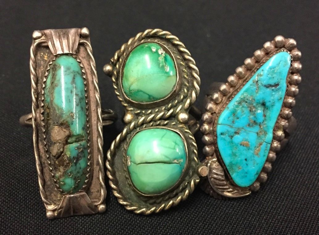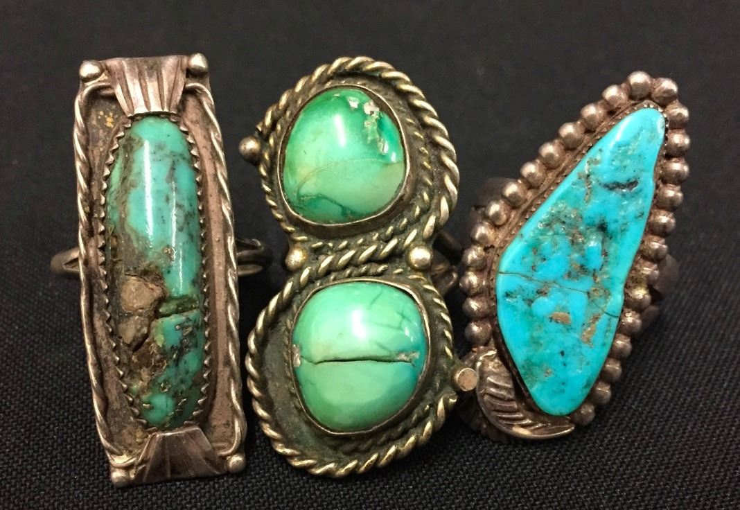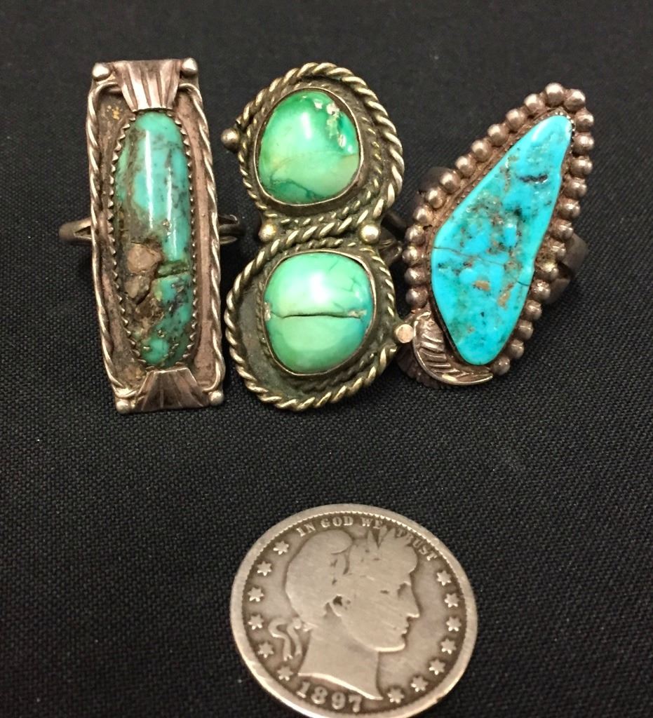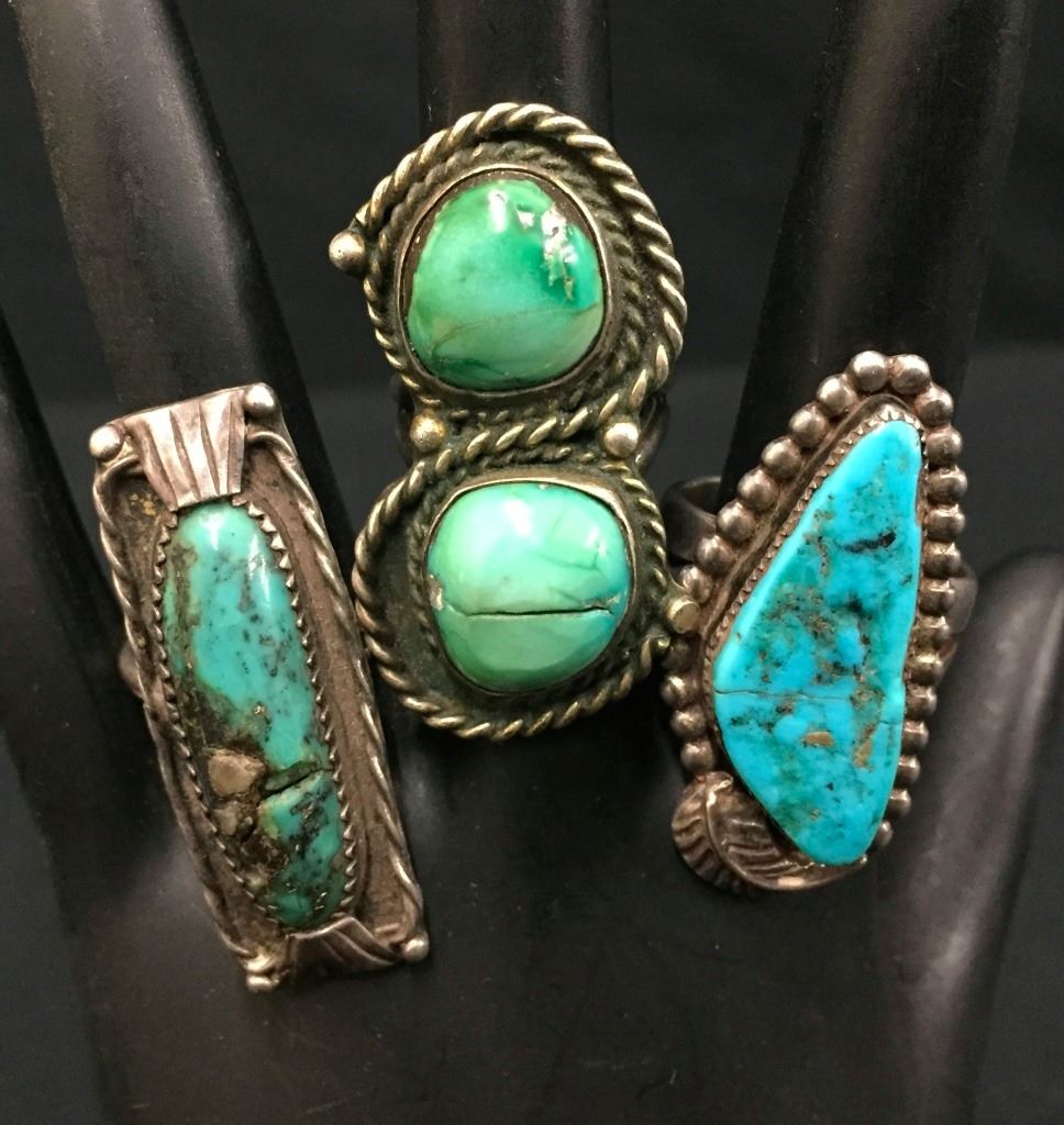 Maker: Various Navajo artisans. Approx. Age: Vintage. Size: 5.5, 8.5 and 8.5. Weighs 30.8g. Condition: Pretty good, 2 of them have small fractures in the turquoise. Additional Info: 3 Navajo turquoise rings set in sterling silver. Please look closely at the pictures - they are an important part of our description. Shipping: There will be a $5 handling / packaging fee for shipping this lot. The actual cost of postage will be added on top of that.