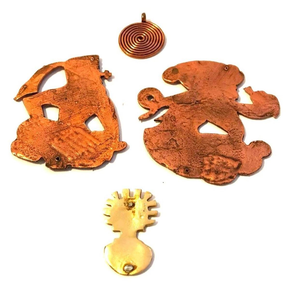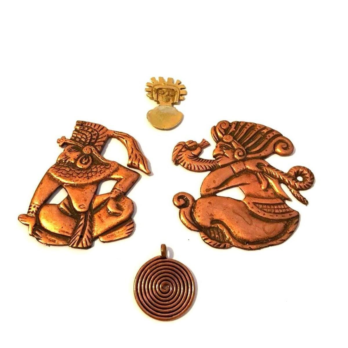 Group of copper & brass Mayan, Aztec themed jewelry findings; including a copper tone spiral pendant, two copper tone Mayan figural embellishments & a vintage Alva Museum reproduction tribal face brooch - Â *missing the back pin. Grouping for jewelry repurpose or metal work.Â