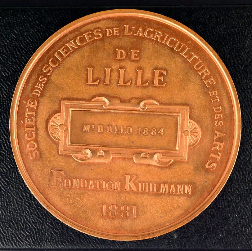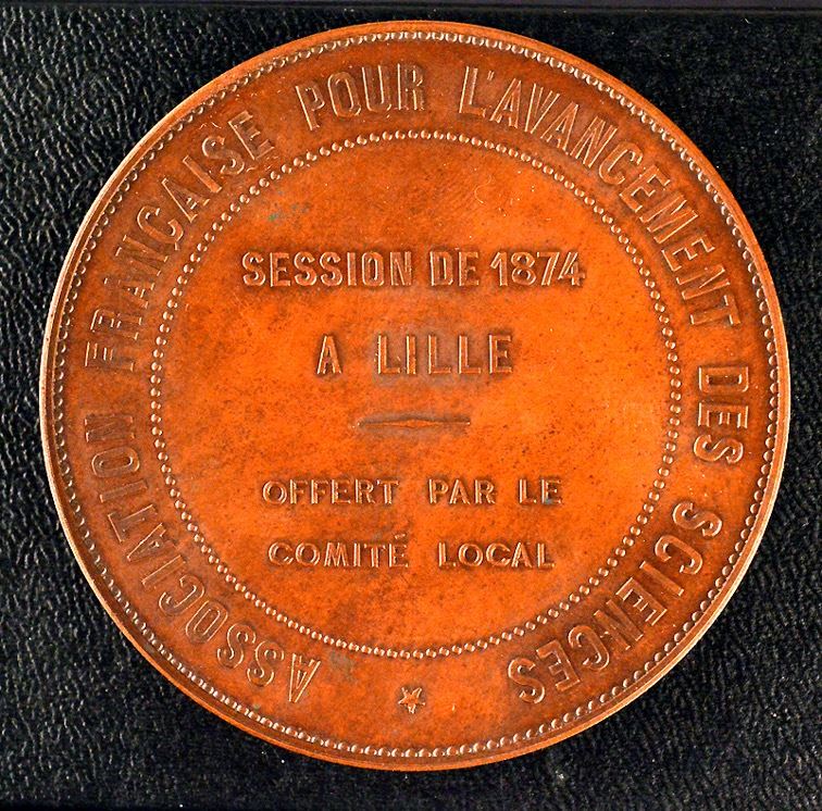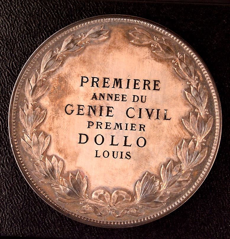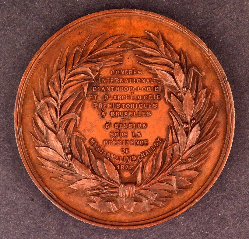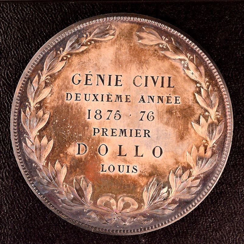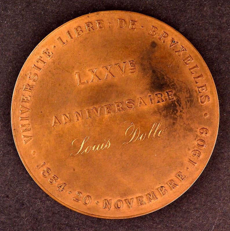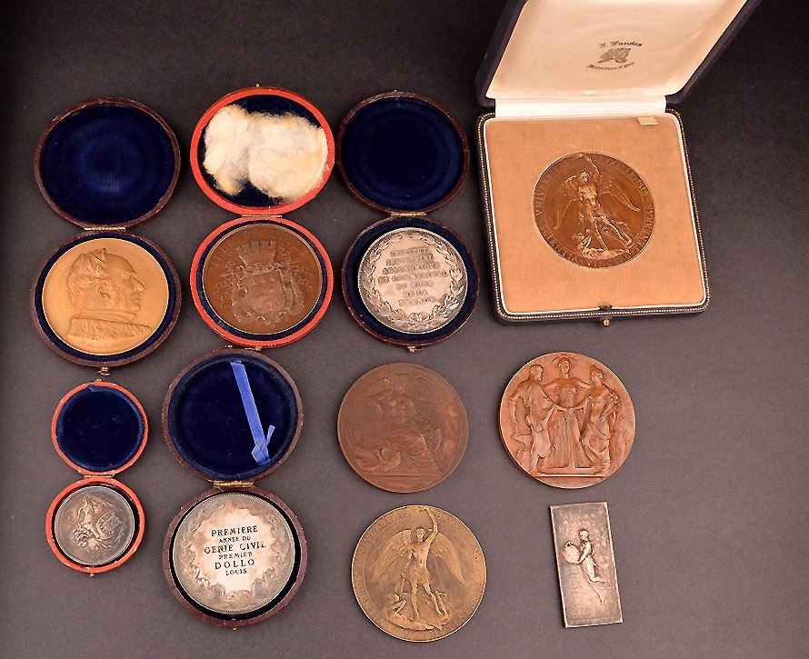 A group of medals presented to Louis Dollo, 1857-1931: (1)- Obv: Winged woman reclining, facong left, "Furfooz" on tablet, Ed. Geerts. Sculp & Fec. In exergue; Rev: "Congres International D'Anthropologie et D'Archeologie Prehistorique A Bruxelles. 6e Session Sous la Presidance de Mr. J.J. D'Omalius d'Halloy, 1872", surrounded by palm leaves; Ae, 65mm; Furfooz refers to Furfooz Man, discovered in Fufooz, Namur, Belgium, in 1866. Dollo would have been only 15 if he attended this Congress; (2)- Obv: "Ville de Lille", coat of arms at centre, J. Esparon, F. at bottom; Rev: "Association Francaise pour L'Avancement des Sciences, Session de 1874, A Lille, Offert Par Le Comite Local"; Ae, 60mm, in red fitted case; (3)- Obv: "Institut Industriel Agronomique et Commercial Du Nord de la France", wreath, J.Esparon, at lower right; Rev: Inscribed "Premier Anne du Genie Civil Premier, DOLLO, Louis", surrounded by wreath; Ar, 57.5mm, 70.66 gms, edge marked Argent, in maroon fitted case; (4)- As last, but inscription, "Genie Civil Deuxieme Annee, 1875-76, Premier, DOLLO, Louis"; Ar, 55.5 mm, 75.16gms, edge marked Argent, in maroon fitted case; (5)- Obv:Man facing right, "R. Bureau Gv. Lille" below; Rev: "Societe des Sciences de L'Agriculture des Arts, de Lille, Fondation Kuhlmann, 1881", Inscribed in frame, at centre, "Mr. Dollo 1884"; Ae, 61mm, in maroon fitted case; (6)- Obv: Exposition International Bruxelles, 1897", 3 allegorical figures at centre, Jul Legae Scult, Wolfgang Fecit, in exergue; Rev: "Koninkryk.Belgie.Royaume.Belgique", Crowned emblem of Belgium, "Union Fait La Force" in ribbon at centre; Ae, 70mm; (7)- Obv: "Academia Reg. Scientiar et Litter Belgii", Winged Mercury at centre, "J. Leclercq" on column; Rev: Rampant lion, holding shield with coat of arms, "L. DOLO" inscribed below; Ar, 37mm, 22.39gms, in red fitted case; (8)- Obv: "Universitas Bruxellensis, Scientia Vincere Tennebras", Winged Angel standing on Lucifer; Rev: "Universite Libre de Bruxelles, LXXVe Anniversaire, 1834- 20 Novembre- 1909", "Louis Dollo" inscribed at centre; Ae, 65mm; He began teaching at the University in 1909; (9)- As last but reverse, "Universite Libre de Bruxelles, Fondee le 20 Novembre, 1834", "Hommage A" on die, "Louis Dollo" inscribed at centre; Ae, 65mm, in black case," J. Fonson, Medaille d'Art" on inside lid; He won the Murchison Medal in 1912; (10)- Obv: Woman holding globe, "Fernan Dubois" at bottom; Rev: "Touring Club de Belgique", "CTB", at centre, Winged Eagle at bottom, inscribed, at top, "Le T.C.B. a Mr. L. Dollo, 1917", Ar, plaquette, 60 x 29mm; Most VF to EF, last Fine; Louis Dollo was born in 1857, in France, and graduated as an engineer, in 1878. He was a pre-eminent paleontologist, in Belgium, and was instrumental in the advancement of Paleobiology. From 1882 to 1885, while he was head of the vertebrate fossil section of the Royal Institute, Dollo worked on reconstructing the skeletons of the Iguanodons, as it was necessary to display them on their hind legs. The first one was assembled in the interior of an unused church that Dollo was using as a workshop. Twelve of those skeletons have been the principal attraction of the Museum of Natural Sciences at the Royal Institute. Dollo collaborated with his former professor Alfred Giard and the Université Lille Nord de France. Around 1890, he formulated a hypothesis on the irreversible nature of evolution, known later as "Dollo's Law". According to his hypothesis, a structure or organ lost during the course of evolution would not reappear in that organism. He won the Murchison medal in 1912. This is an interesting collection of an important man's medals.