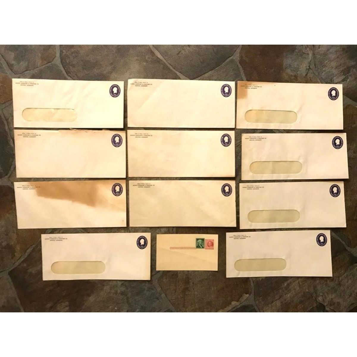 Group of 12 mid-century printed postal stamps, envelopes in unused condition. Includes: 11 envelopes with 3 cent violet Washington stamped window pane & regular envelopes, all imprinted with "After 5 days, return to White's Hardware & Furniture Co. Newton, Mississippi." 6 of them window pane & 5 regular.  2 with age related foxing & 1 has been torn open at top. along with an unused postal card with a printed 2 cent Franklin stamp & an additional 1 cent Washington stamp, unused. * postal card has a bend in the center.Â