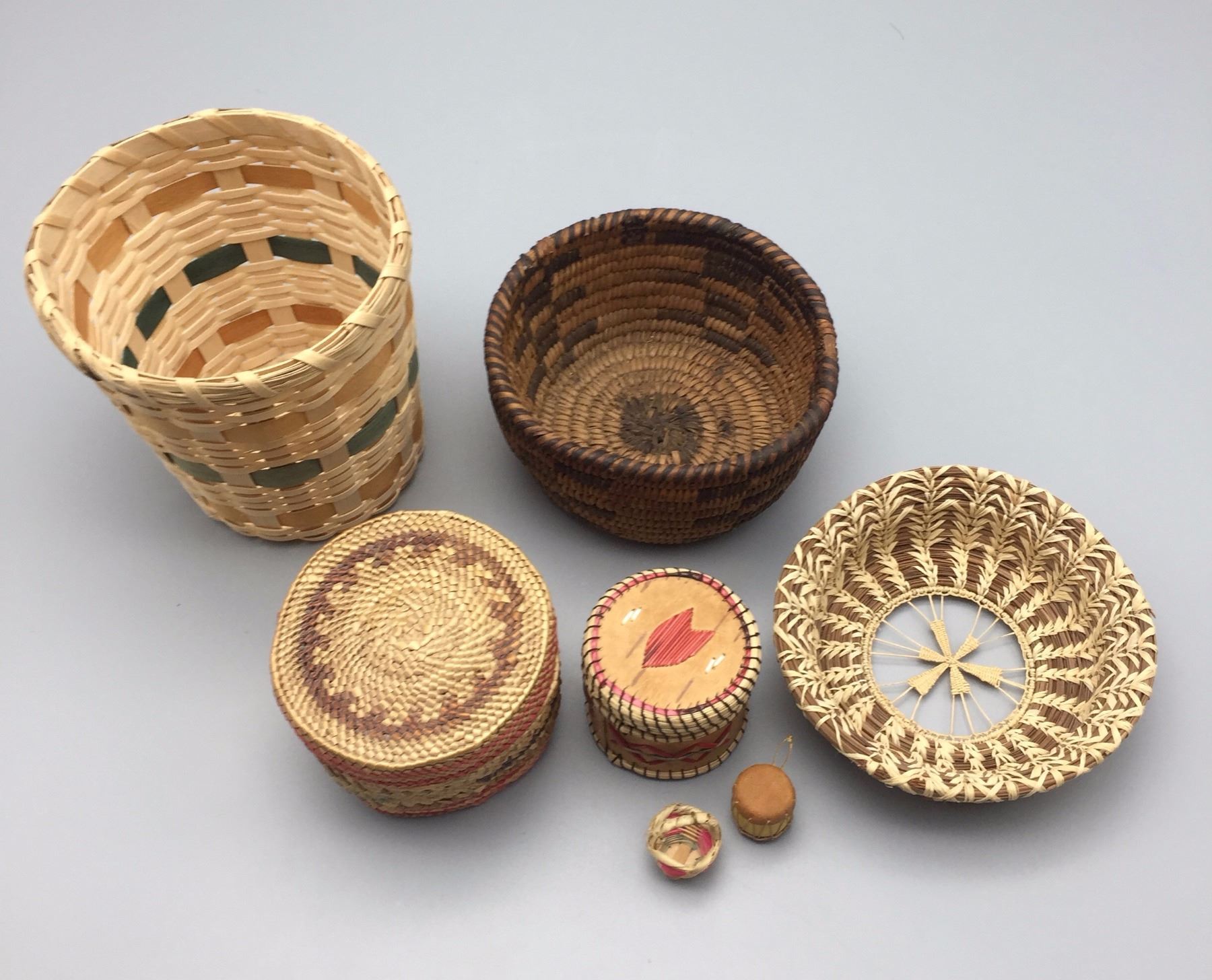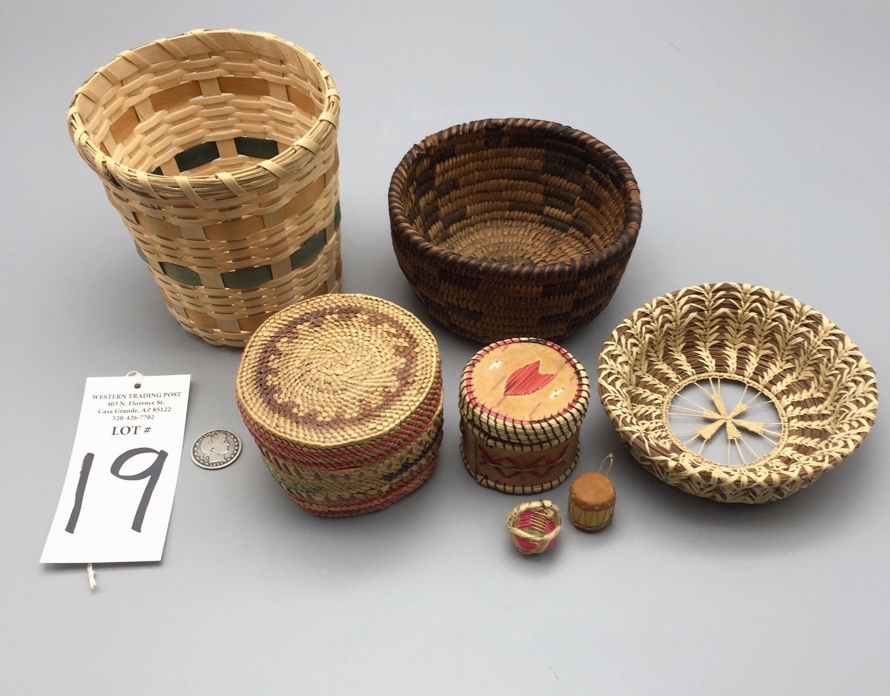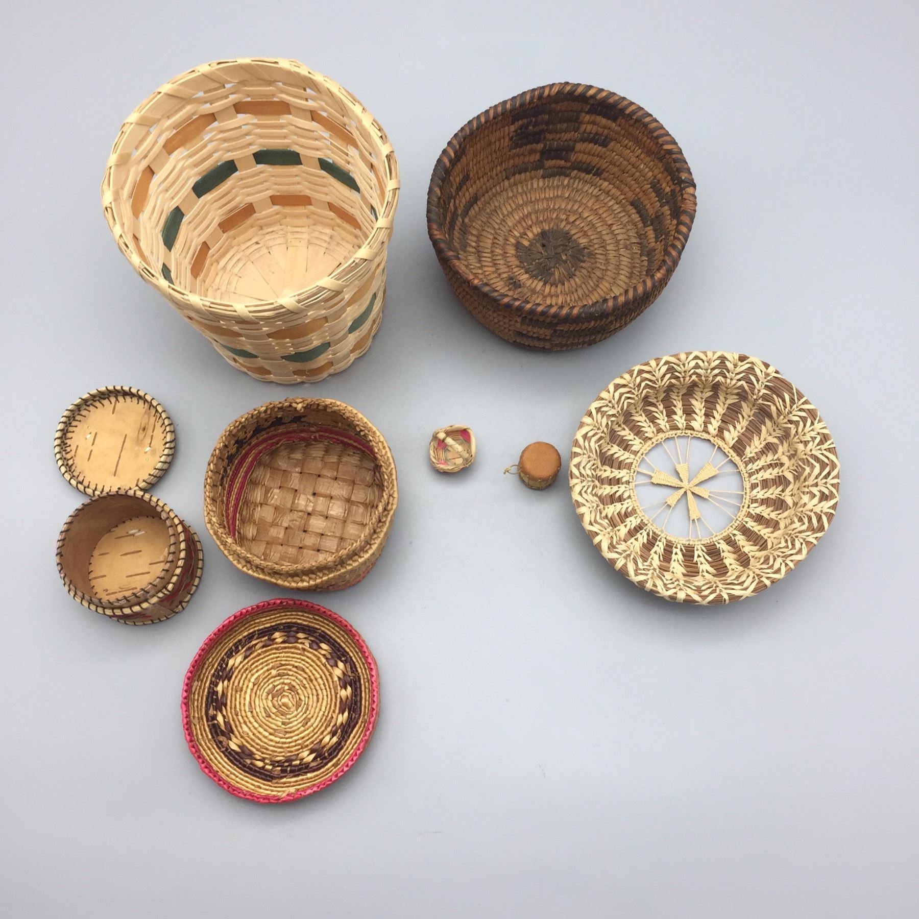 Maker: Various makers. Approx. Age: Vintage to fairly modern. Size: 3 1/4” to 4 3/4” w x 1” to 5 1/2” h. Additional Info: Group of miscellaneous basketry, including an old Pima basket, birch-bark, a couple of eastern baskets, etc. Condition: Pretty good for their ages, normal wear expected. Please look closely at the pictures - they are an important part of our description. Shipping: There will be a $7 handling / packaging fee for shipping this lot. The actual cost of postage will be added on top of that.