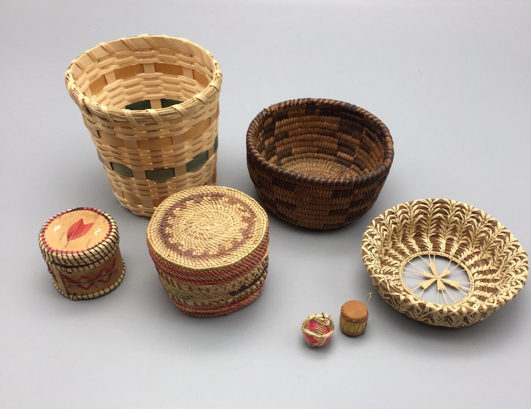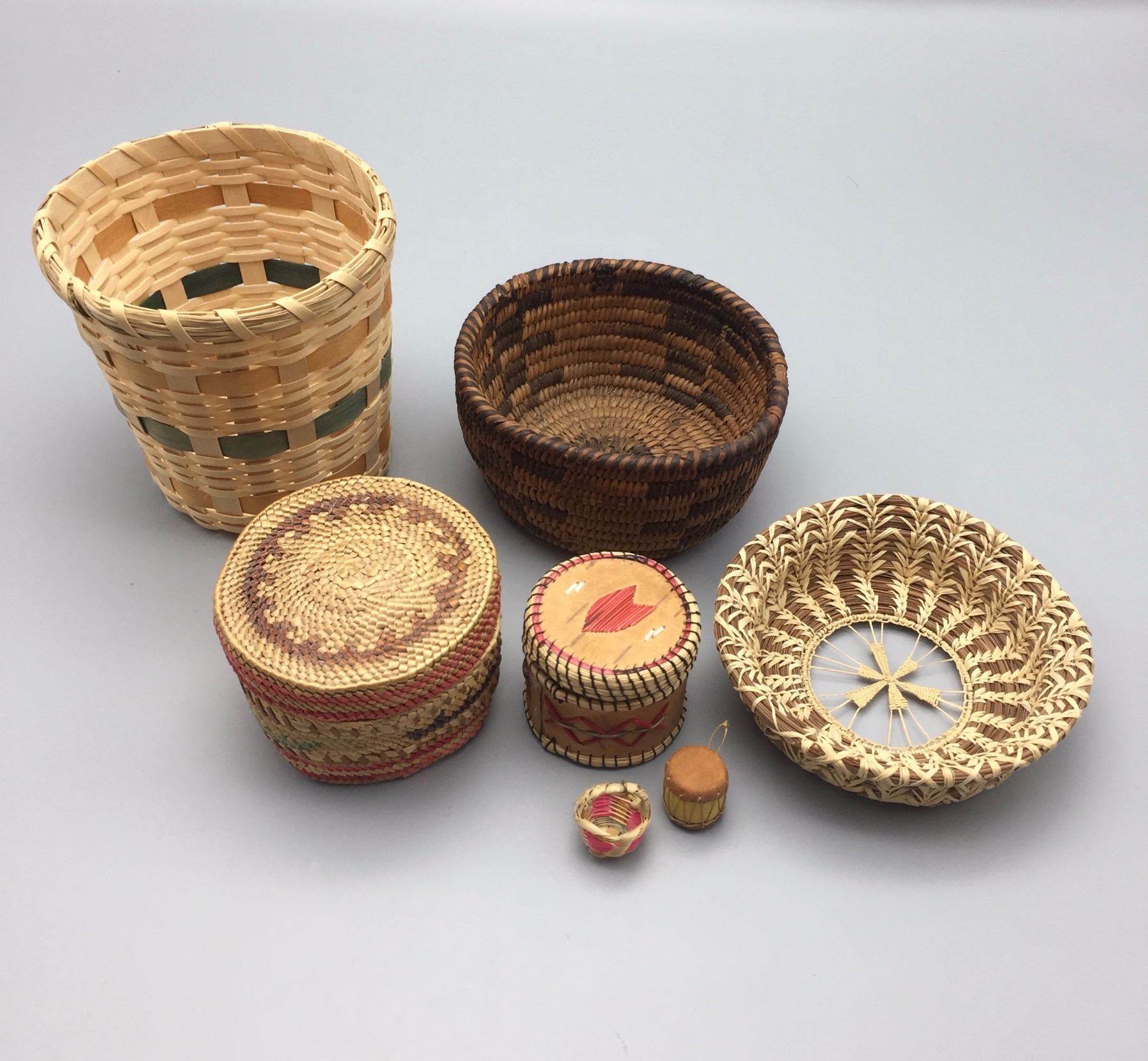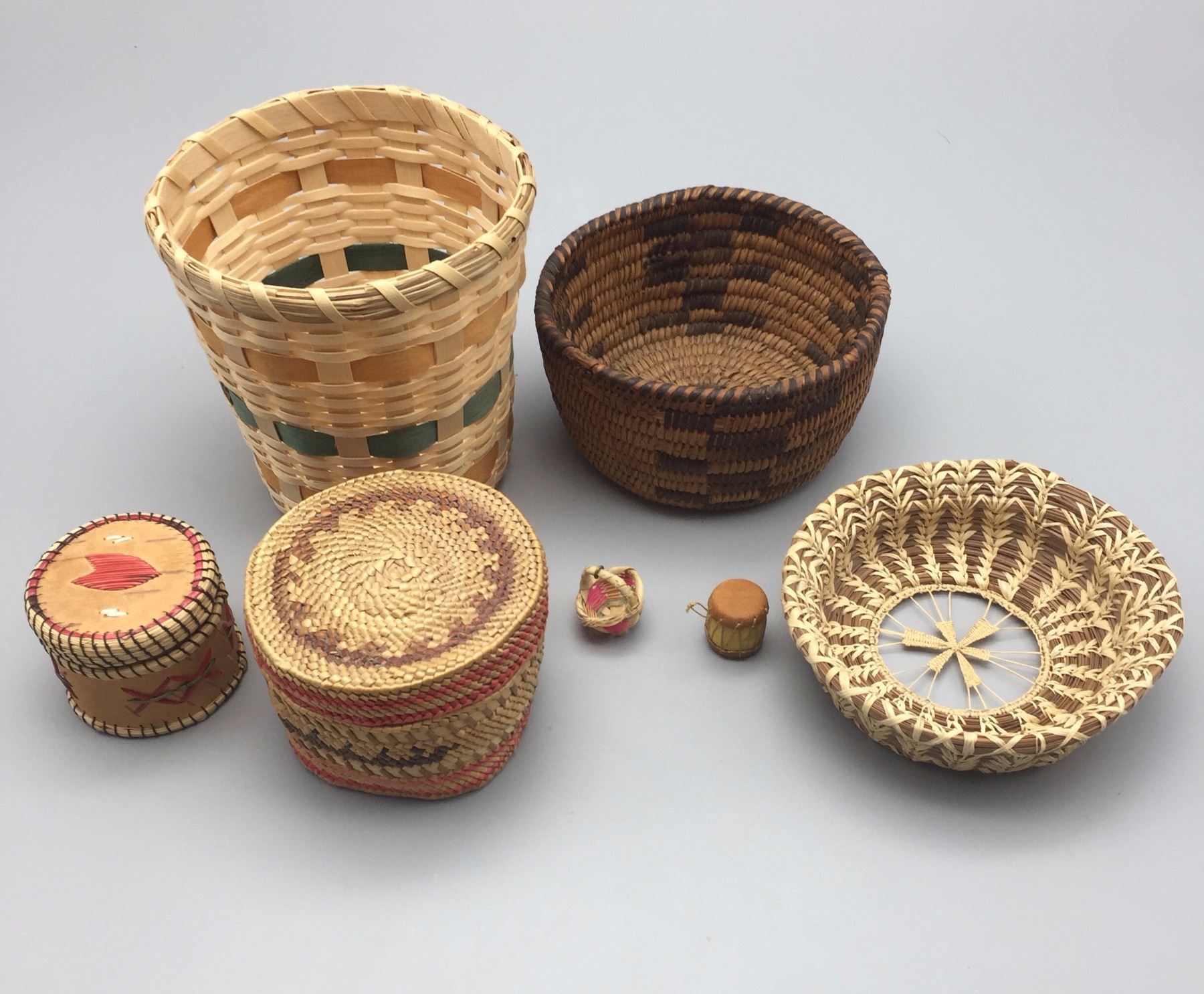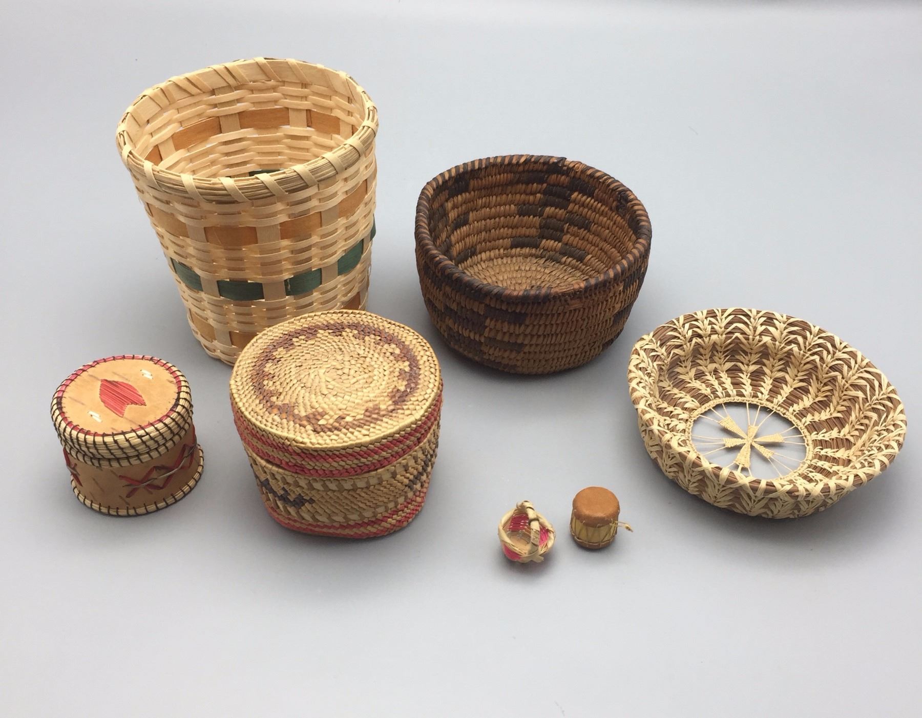 Maker: Various makers. Approx. Age: Vintage to fairly modern. Size: 3 1/4” to 4 3/4” w x 1” to 5 1/2” h. Additional Info: Group of miscellaneous basketry, including an old Pima basket, birch-bark, a couple of eastern baskets, etc. Condition: Pretty good for their ages, normal wear expected. Please look closely at the pictures - they are an important part of our description. Shipping: There will be a $7 handling / packaging fee for shipping this lot. The actual cost of postage will be added on top of that.