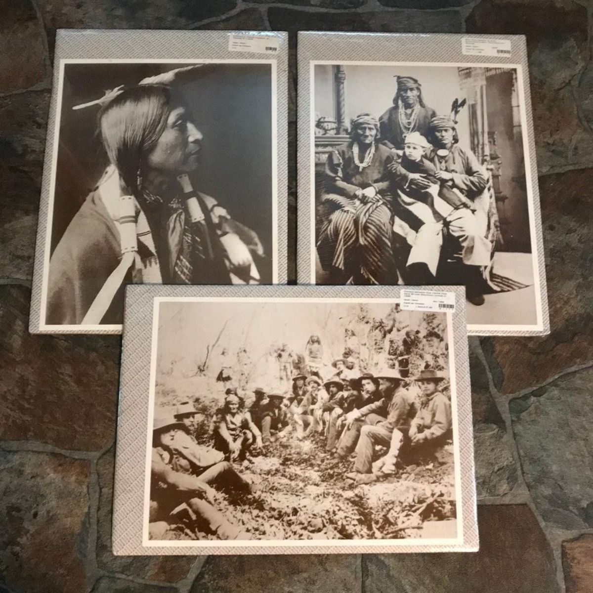 Group of Native American Indian sepia-tone photo prints, to include: a Jicarilla Indian by Edward Curtis, Zuni Bow Priests & Council Between Gen Crook and Geronimo, 1886. All three 11" X 14" printed on heavy card stock in the early 1990's for The American Heritage Gallery. All in original shrink-wrapped packaging.Â