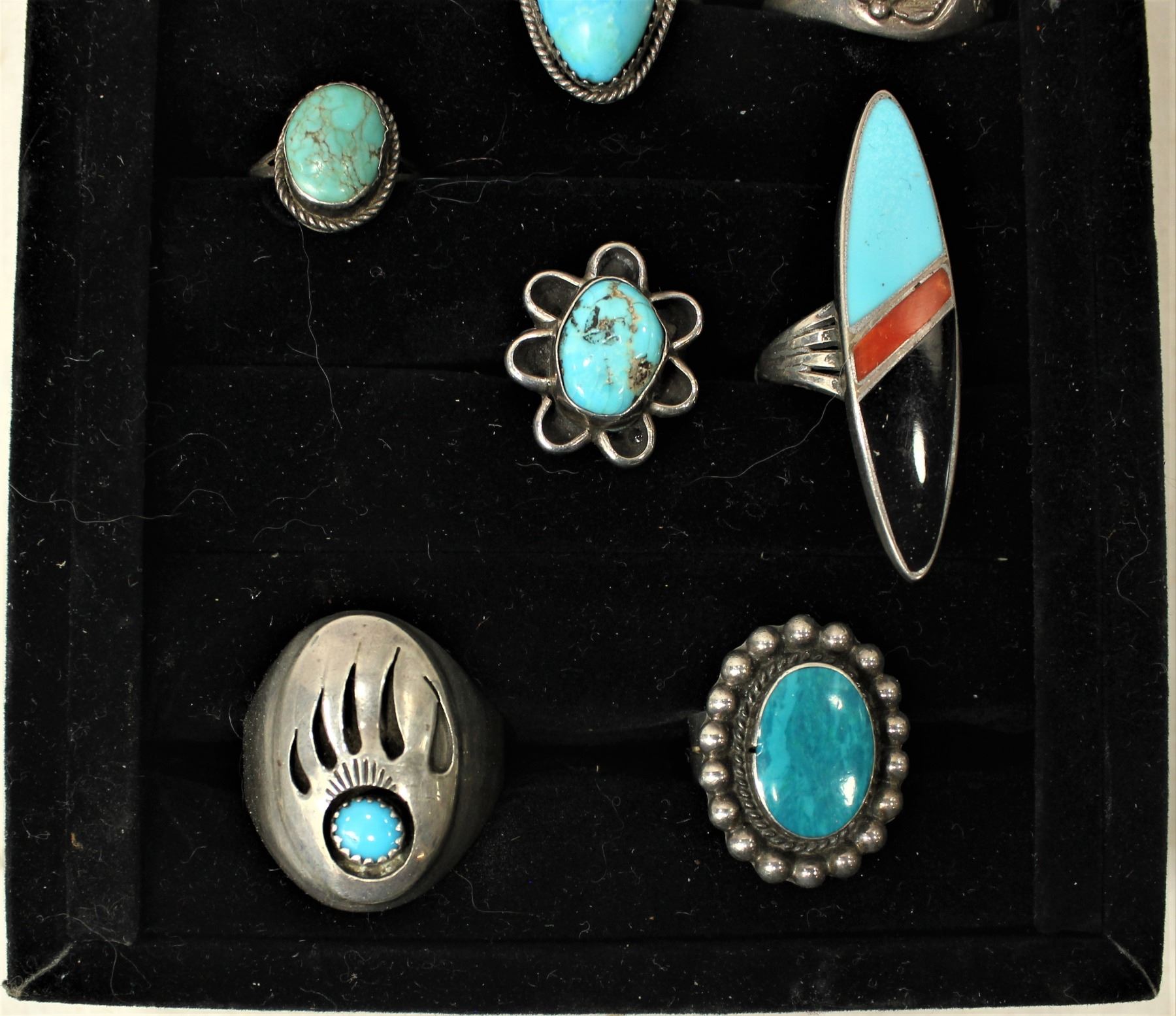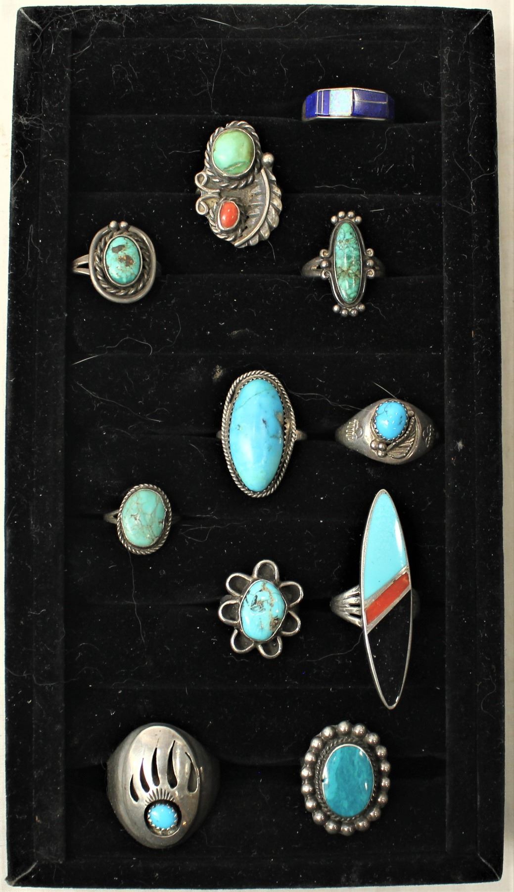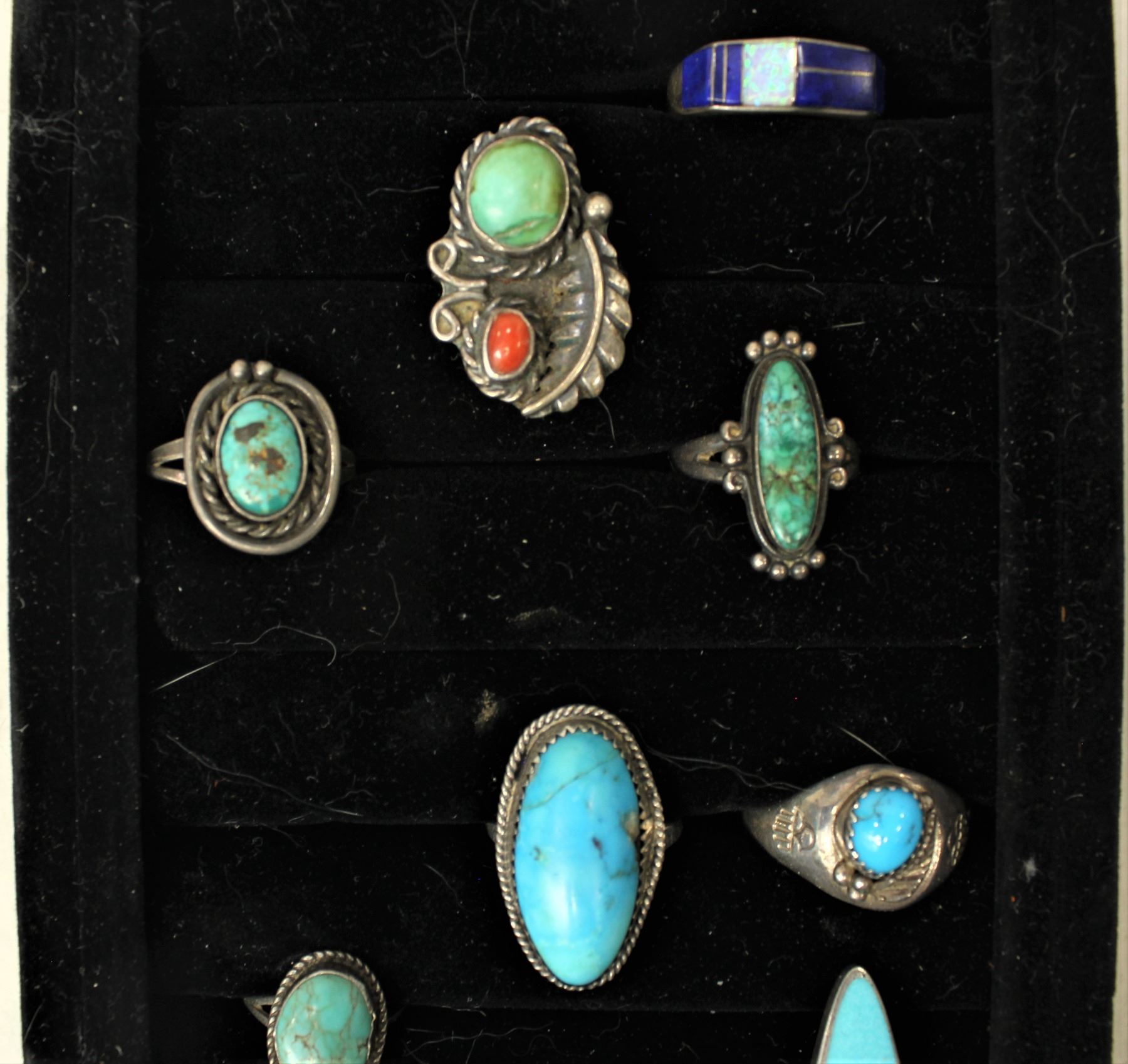 A grouping of 11 various Native American made silver and turquoise rings.