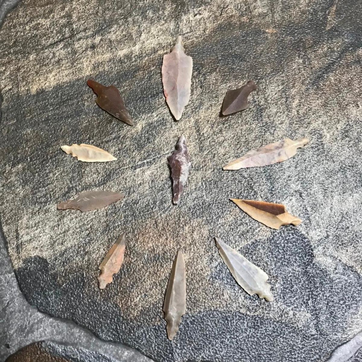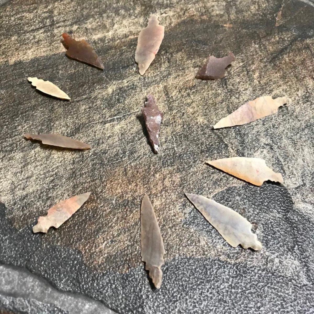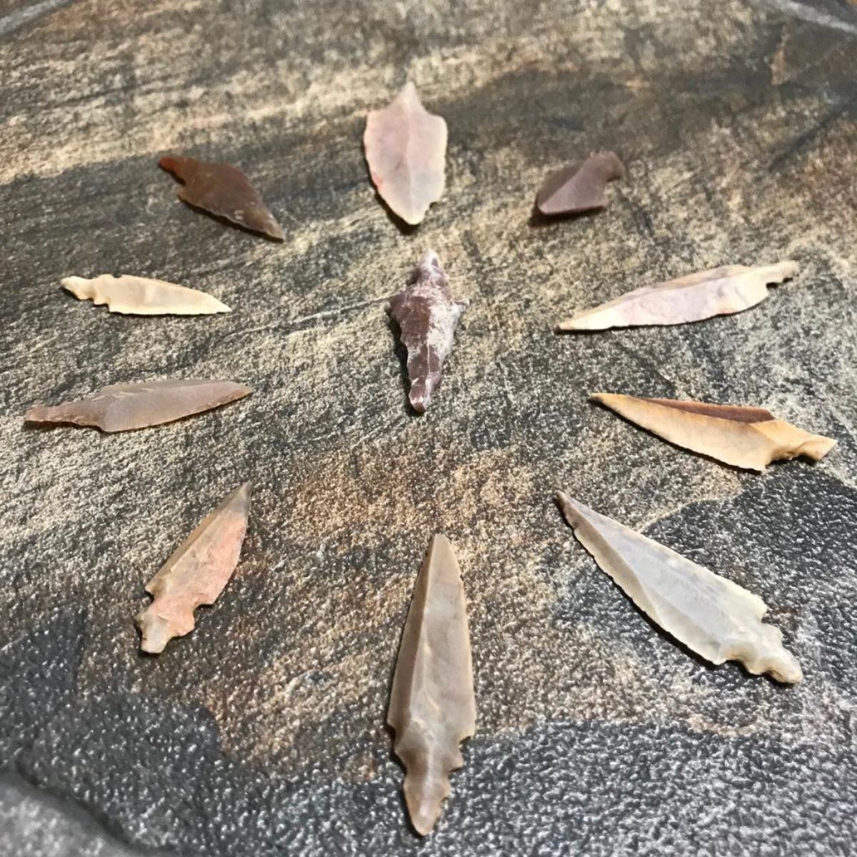 Group of eleven Neolithic Sahara Desert projectile points, arrowheads, projectile points. Stone Age artifacts, surface gathered by indigenous nomadic tribes during their travels across the Sahara Desert in Africa. Approx 3000 - 5000 years old. 1" - 2" average size.