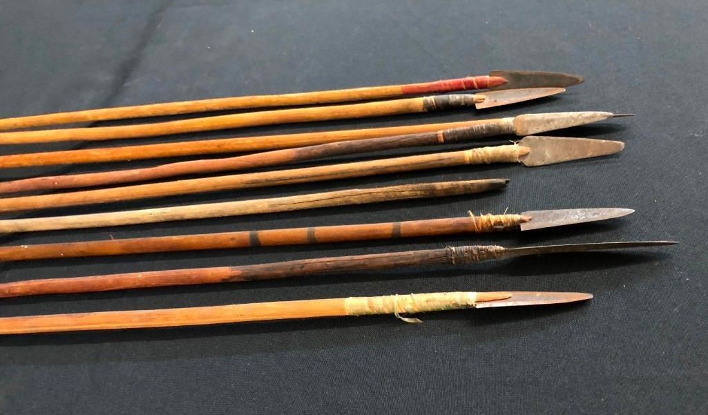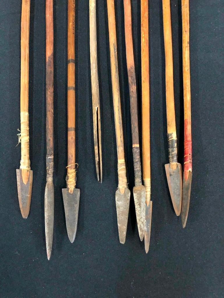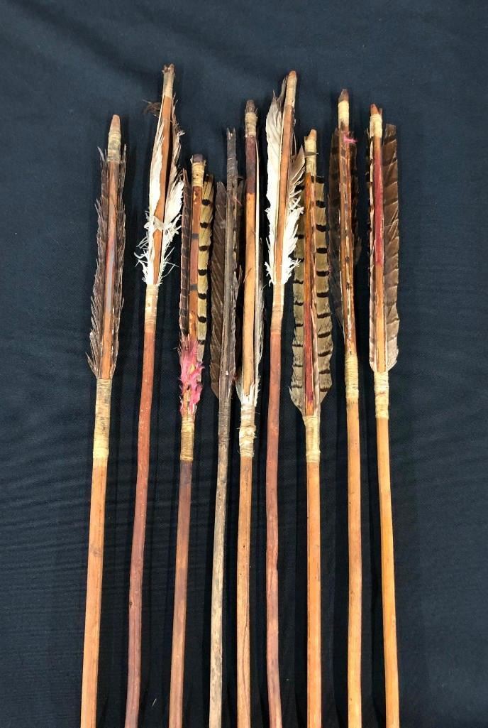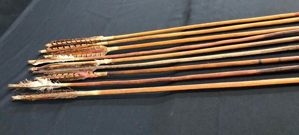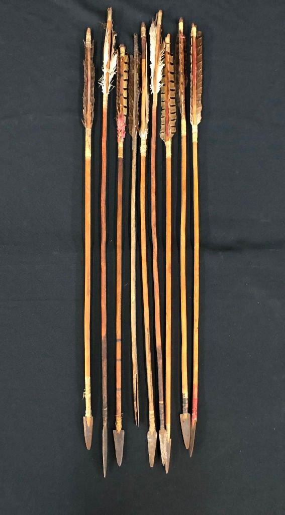 Presented here is a rare opportunity to own a group of nine antique Plains arrows. Most of them have iron arrowheads that have been hand forged and attached with sinew. MAKER/ARTIST: Unmarked. APPROX AGE: Antiques. SIZE: They are about 2 ft. long each. CONDITION: Pretty good for their ages, wear expected. Please look closely at the pictures as they are an important part of our description and are hereby incorporated into the description, specifically with regards to condition. SHIPPING: There will be a $10 handling / packaging fee for shipping this lot. The actual cost of postage will be added on top of that. BUY IT NOW: If you would like to buy this item now, without waiting for the auction day to bid on it, we do offer this option (which is available up to 48 hours before the actual auction starts). The “Buy it Now†price is the high estimate of this lot (plus applicable fees and the Buyer's premium is discounted to 10% when using the Buy it Now option). If you would like to exercise this option, you must contact us by email (or phone as long as you talk to someone live). Reference this lot number and your intention to "Buy it Now."