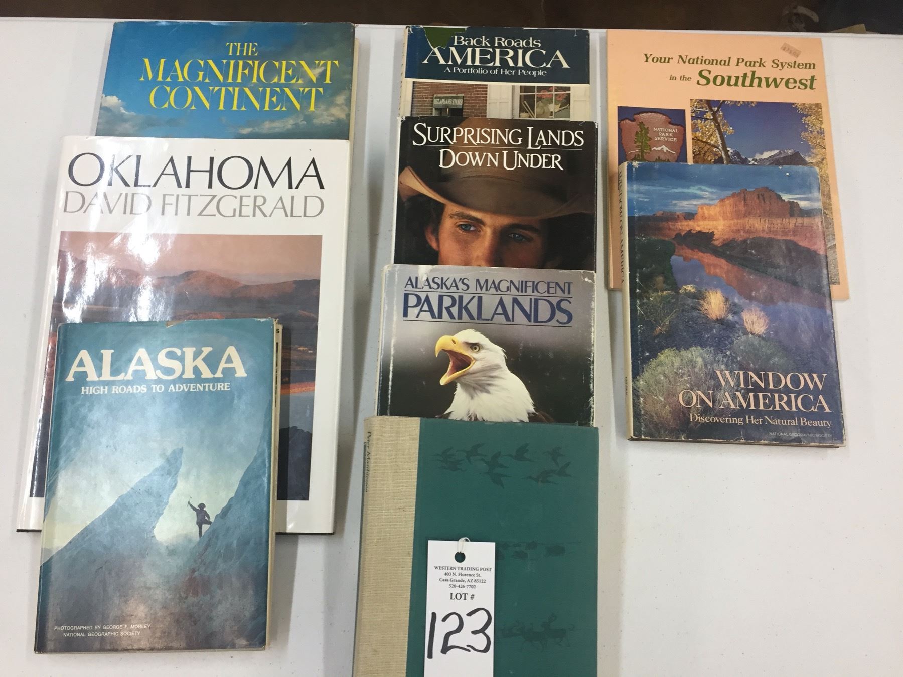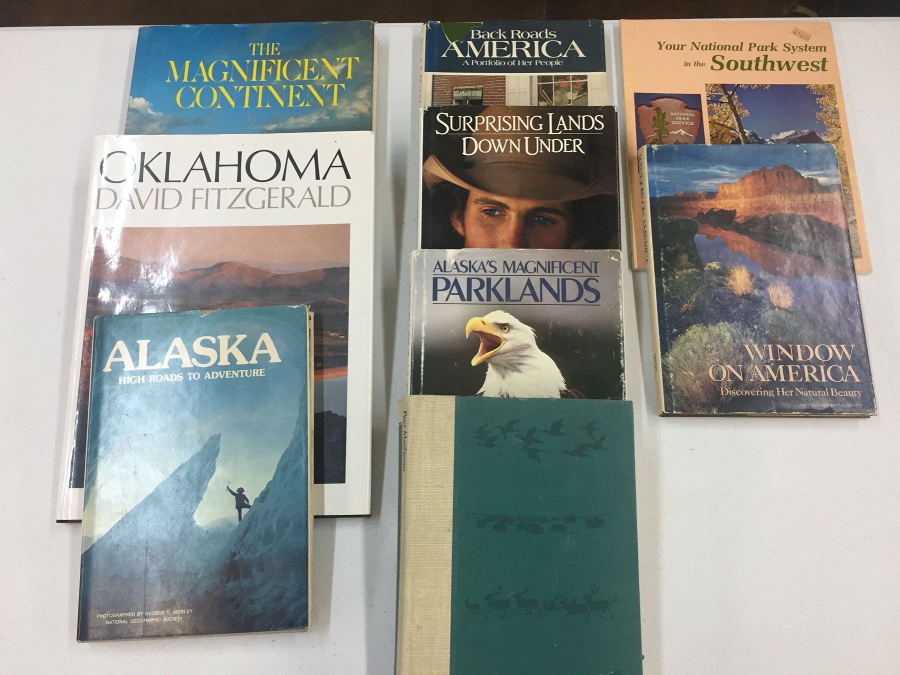 Description: Included for sale in this lot is a group of nine books on various subjects, which include a book about Alaska and a book about Oklahoma, just to name a few. Maker: Various. Approx. Age: Vintage too modern. Size: Varies. Condition: Pretty good for their ages, some wear expected. Please look closely at the pictures - they are an important part of our description. Shipping: There will be a $10 handling / packaging fee for shipping this lot. The actual cost of postage will be added on top of that.
