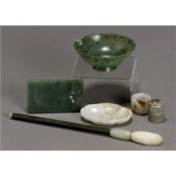 Consisting of a spinach-green jade bowl; three thumb rings, one light brown amber, one russet white jade, and one russet calcified jade; a celadon seal surmounted with a tortoise; three snuff dishes, one circular apple-green jadeite, one lobed celadon, and one of spinach-green jade; and one celadon and spinach green jade-handled brush. The lobed dish with chip.
