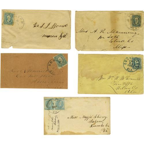 <B>Group of Nine Confederate Covers.</B></I> A diverse assortment with two covers carrying pairs of 5-cent Davis stamps (#s 6 and 7) and seven covers carrying single 10-cent Jefferson Davis stamps (#11 various shades). One of the covers - from Vicksburg - carries that city's postmark and contains an ALS from B.M. Lowe, Jr. regarding a debt. The remaining covers carry Virginia, Georgia, Alabama and North Carolina postmarks. Most of these covers have slight defects such as staining, wear and fading. Overall good condition.<BR><BR><b>Shipping:</b> Small Flat (<a target="_blank" href="http://www.heritageauctions.com/common/shipping.php">view shipping information</a>)