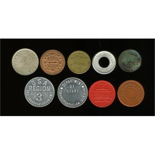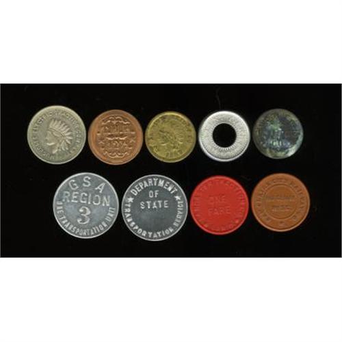 <B>Group of Nine Transportation Tokens.</B></I> Hard rubber/aluminum/brass. A variety of transportation tokens from around the United States, including <B>Eau Claire Wisc #180a </B></I>good for one fare; <B>Wood County Bridge Co.; Wisconsin Rapid #980c </B></I>15 cents.<BR><BR><b>Shipping:</b> Coins & Currency (<a target="_blank" href="http://www.heritageauctions.com/common/shipping.php">view shipping information</a>)