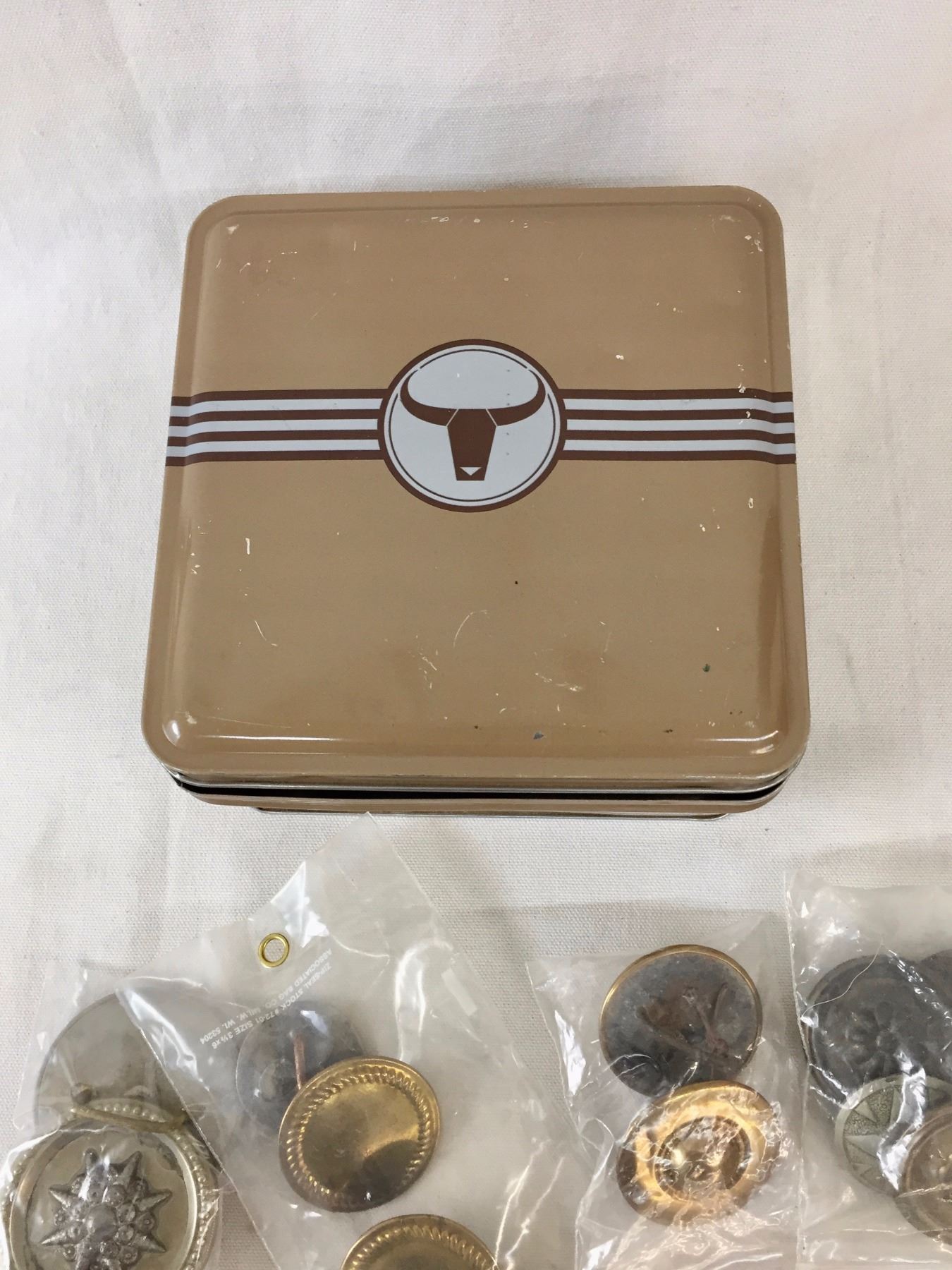 Description: Large group of vintage bridle rosettes. Mostly appear to be pairs. The collection comes with the vintage tin they are in. Maker: Varies. Approx. Age: Vintage. Size: Varies, but pretty standard sizes. Condition: Pretty good for its age, normal wear expected. Please look closely at the pictures - they are an important part of our description. Shipping: There will be a $5 handling / packaging fee for shipping this lot. The actual cost of postage will be added on top of that.