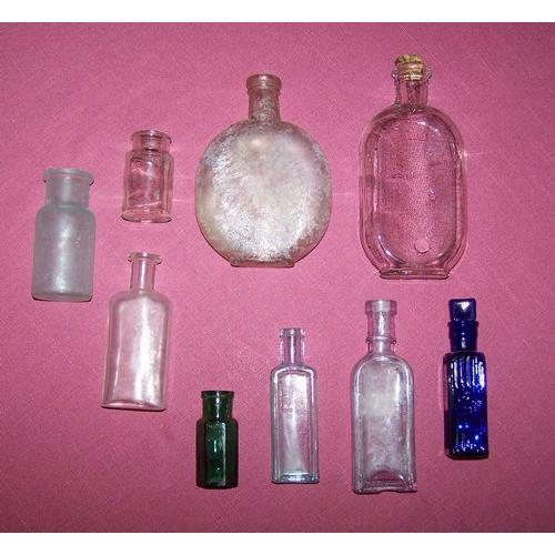 This is an assortment of 9 old cork top bottles ranging from the late 1800's to the early 1900's. They range in size from approximately 2" up to 6" in height. As can be seen in the pictures the cobalt blue one has a glass stopper. One of the clear bottles has a chip on the rim. All others are in good to very good condition.