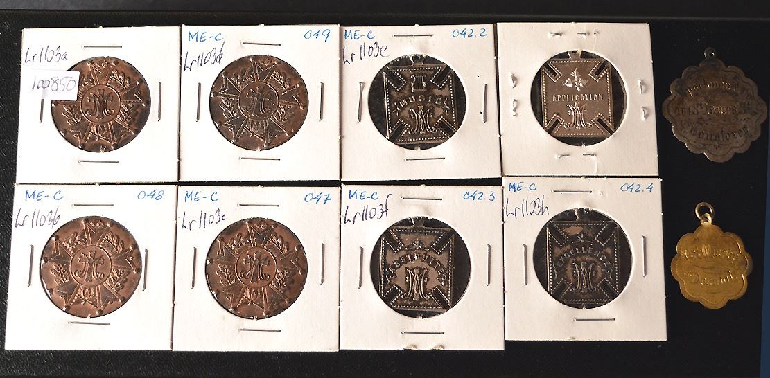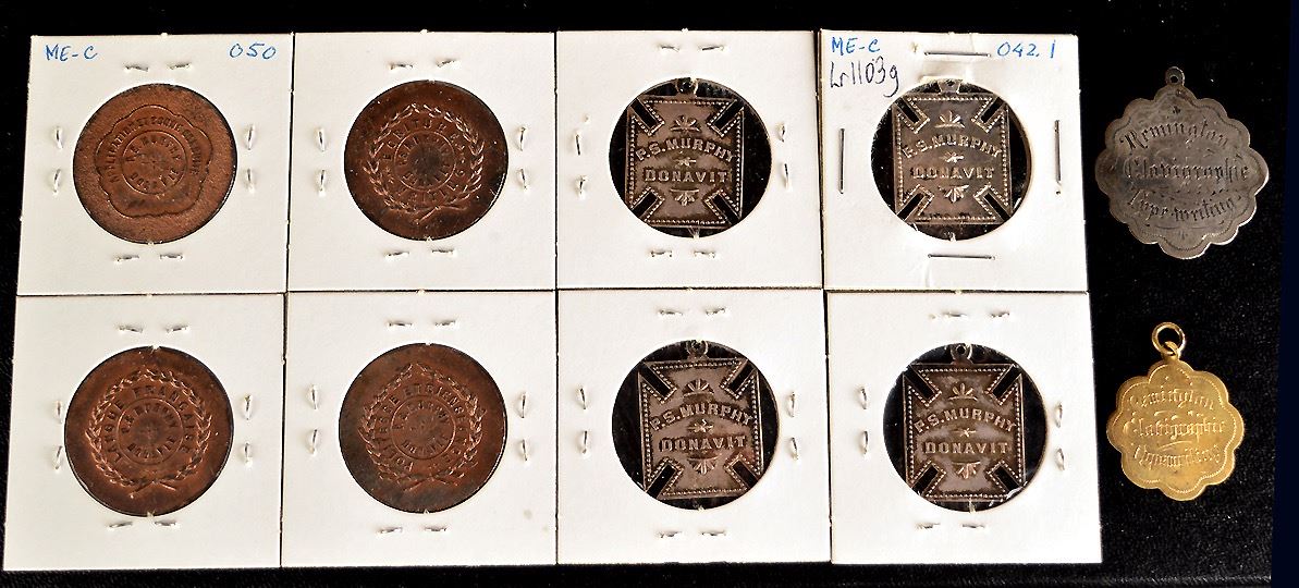 A group of P.S. Murray medals, consisting of: Lr.1103a; 1103b; 1103c; 1103d; 1103e; 1103f; 1103g; 1103h; another, with 8 scallops, obv: "P.S. Murphy Donavit", decoratively designed; Rev: "Remington Clavigraphie Typewriting"; Ae, gold plated, 29.6 x 26 mm, ring at top, slight bend; another, Obv: Sparkman & Co. 164 St. James St. Donatores"; Rev: as last; Ae, silver plated; 37.6 x 34mm; first 4 appear Wm, copper plated; Fine to EF, total 10 pcs.