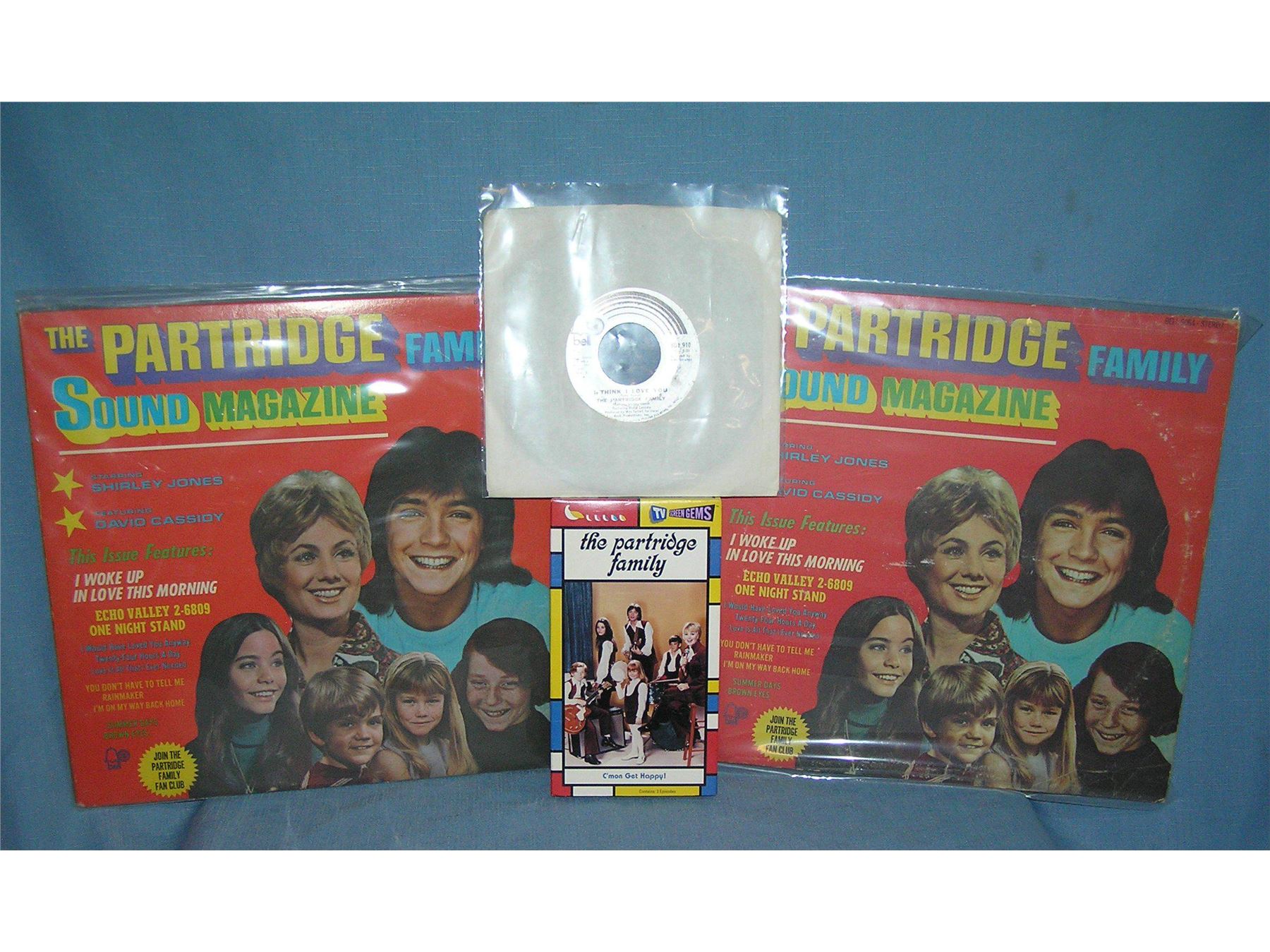 Group of Partridge Family collectibles includes 2 record albums, 45 RPM record and the Partridge Family C'mon Get Happy TV video est. value $65.00-$75.00