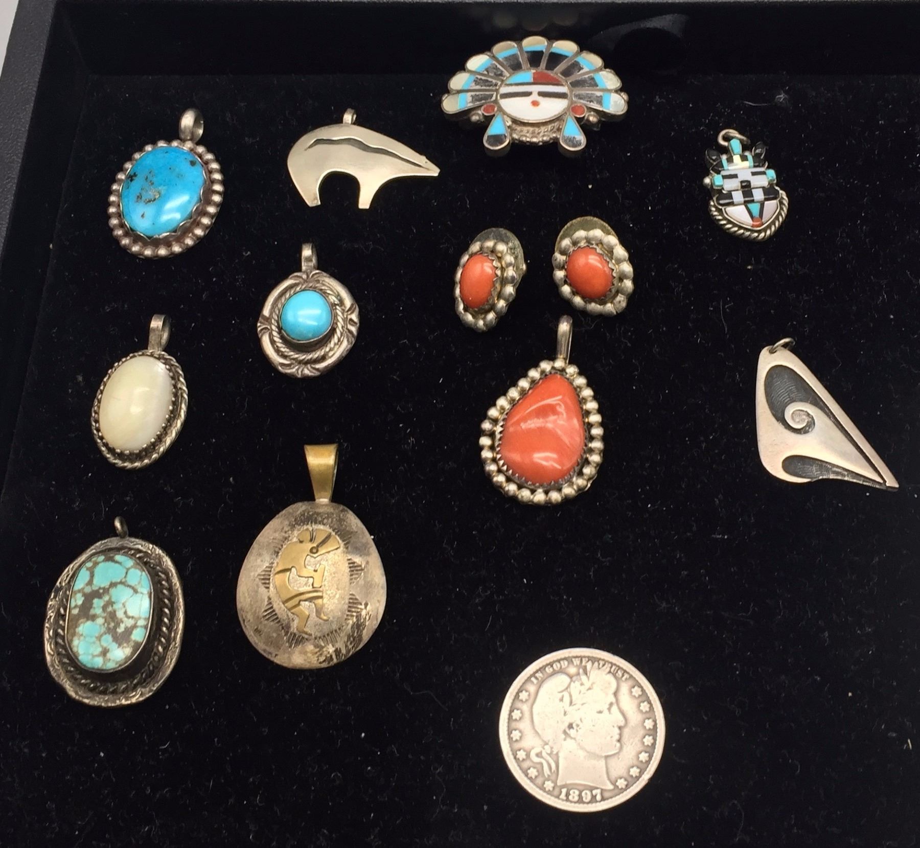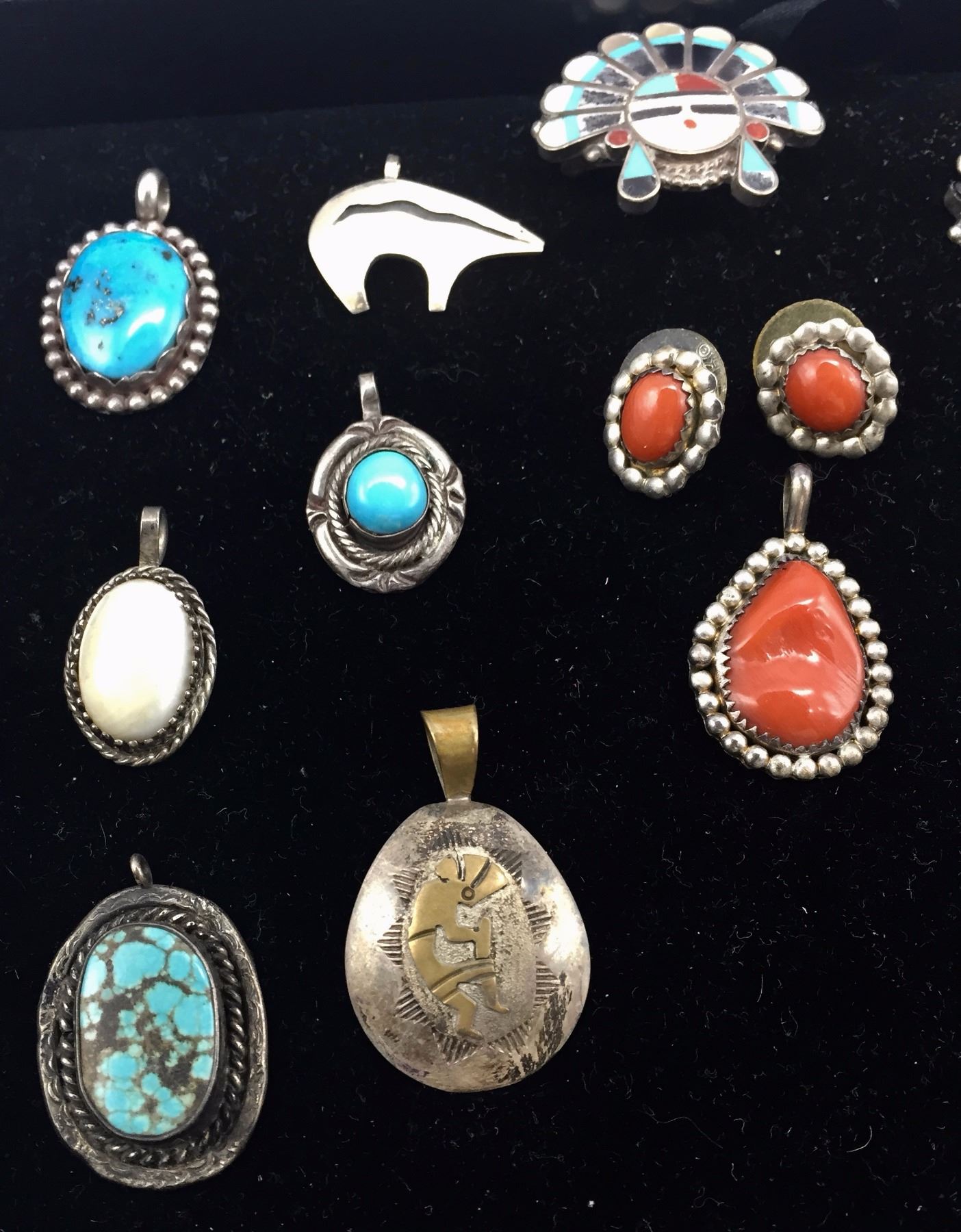 Maker: Various, there is one Hopi hallmarked piece, a Zuni and Navajo hallmarked piece and several unmarked (apparently Navajo) pieces. Approx. Age: Circa 1960s - 80s. Size: None are over 1.5” long. Collectively they weigh 49.8g. Condition: Vintage good, normal wear expected. Additional Info: The Zuni sunface piece is a pin/pendant. The Coral pendant has matching earrings. All other items are pendants. 12 total pieces. All are sterling where applicable. Please look closely at the pictures - they are an important part of our description. Shipping: There will be a $5 handling / packaging fee for shipping this lot. The actual cost of postage will be added on top of that.