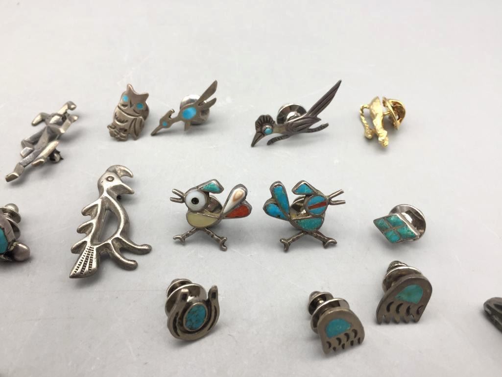 Included for sale in this lot is a group of pins, pendants and tacks in various designs and sizes, some have turquoise, some are sterling silver. A nice group lot. Maker: Some are marked, others unmarked. Approx. Age: Various. Size: Various sizes. Combined weight of 113.3 grams. Condition: Good for its age, normal wear expected. Please look closely at the pictures - they are an important part of our description. Shipping: There will be a $5 handling, packaging fee for shipping this lot. The actual cost of postage will be added on top of that.