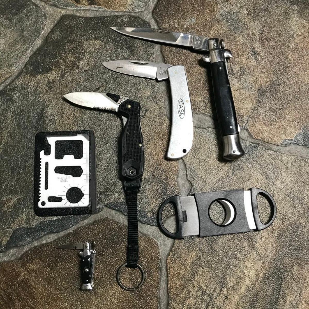 Group of stainless steel pocket knives & multi tools, including a cigar cutter & miniature switch blade knife, as pictured.Â