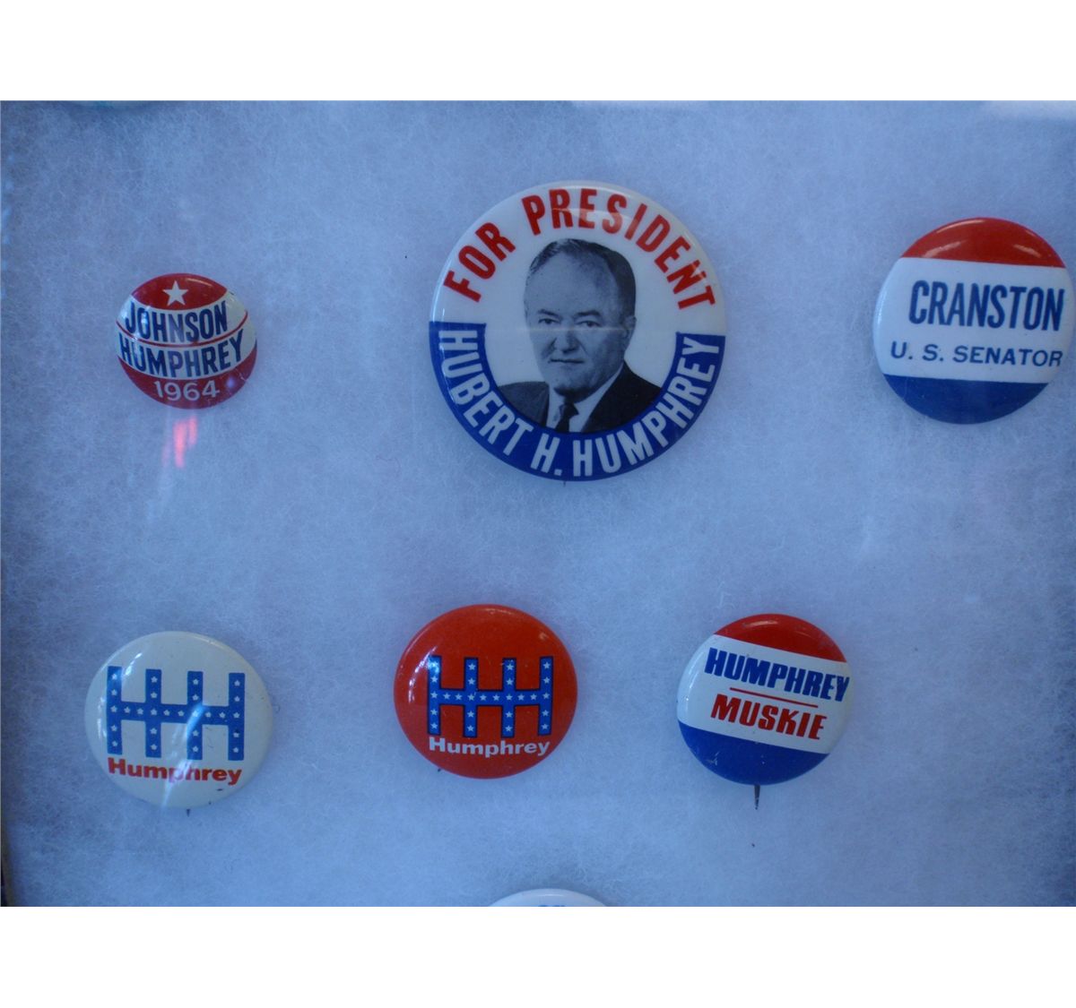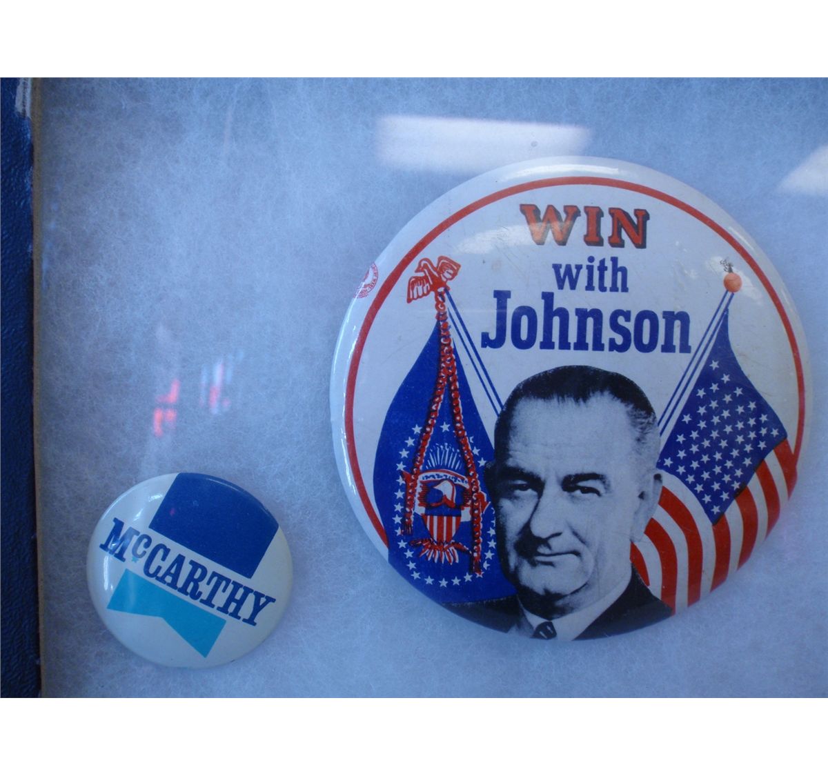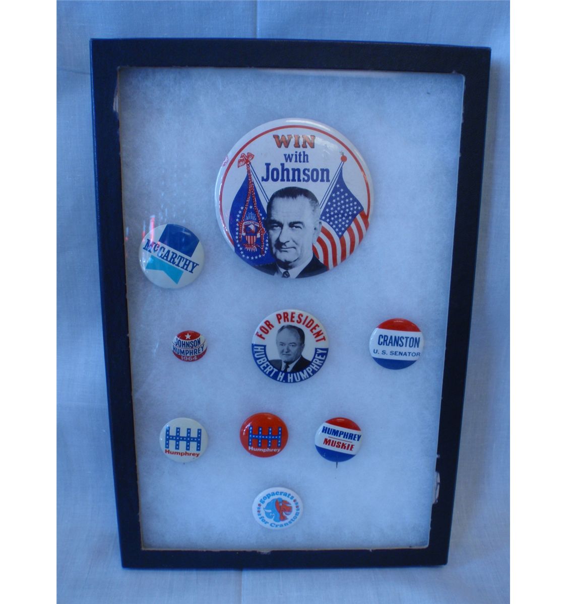 Nine Political buttons in riker mount. Featuring 3 1/2" "Win with Johnson" various sizes. Approx 1960's Shipping on this lot: $10.00. Additional Shipping Charges for Lots sent outside of the U.S