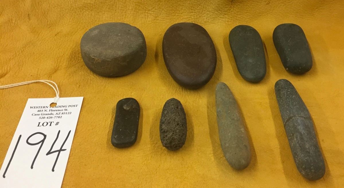 Maker: Prehistoric Hohokam items from a Coolidge, AZ collection. Approx. Age: Prehistoric. Size: Items are from 2” to 4” across. Condition: As found. Additional Info: Rare “prayer” stones and other stone items! Please look closely at the pictures - they are an important part of our description. Shipping: There will be a $7 handling / packaging fee for shipping this lot. The actual cost of postage will be added on top of that.