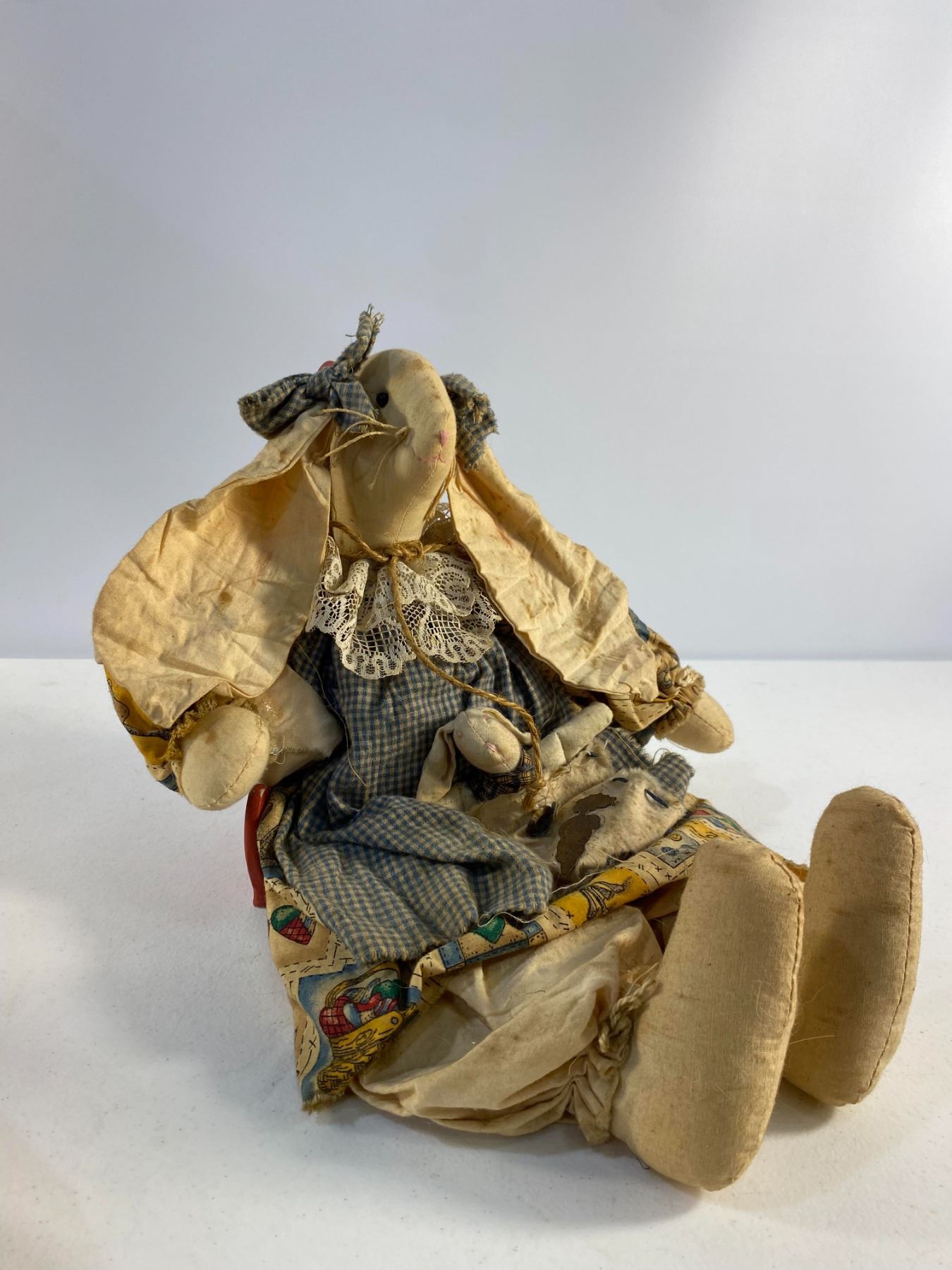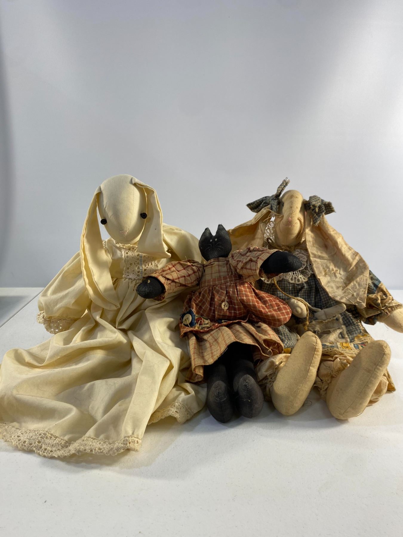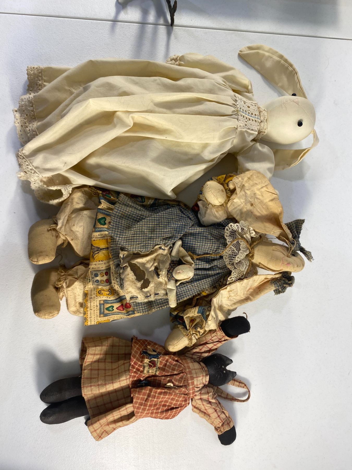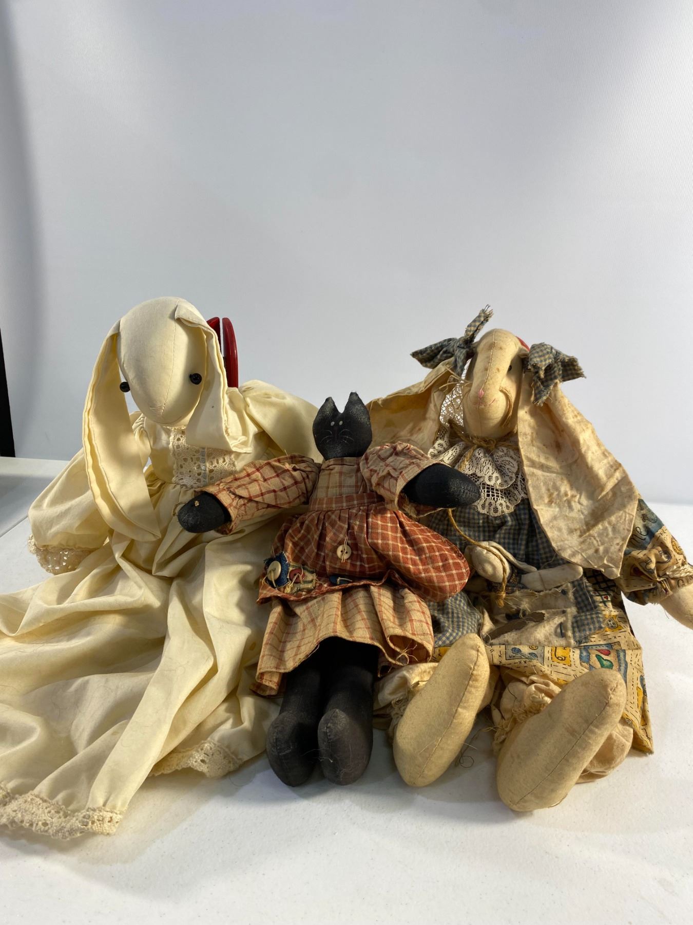 Charming trio of handcrafted primitive-style cloth dolls including two rabbits and one cat. Each dressed in vintage-inspired fabric outfits with lace and checkered details. Unique folk art appeal with soft, aged patina and homespun character.