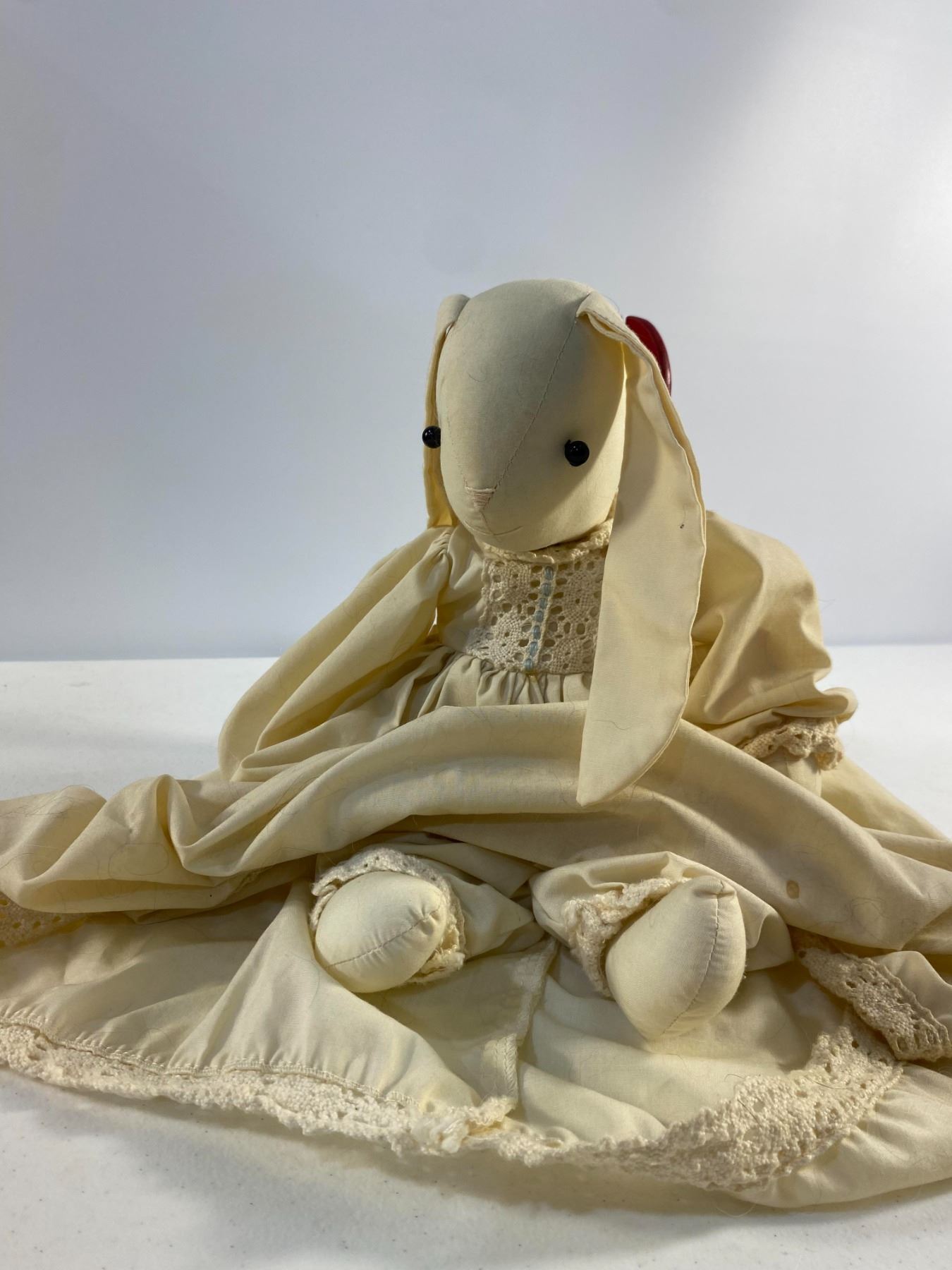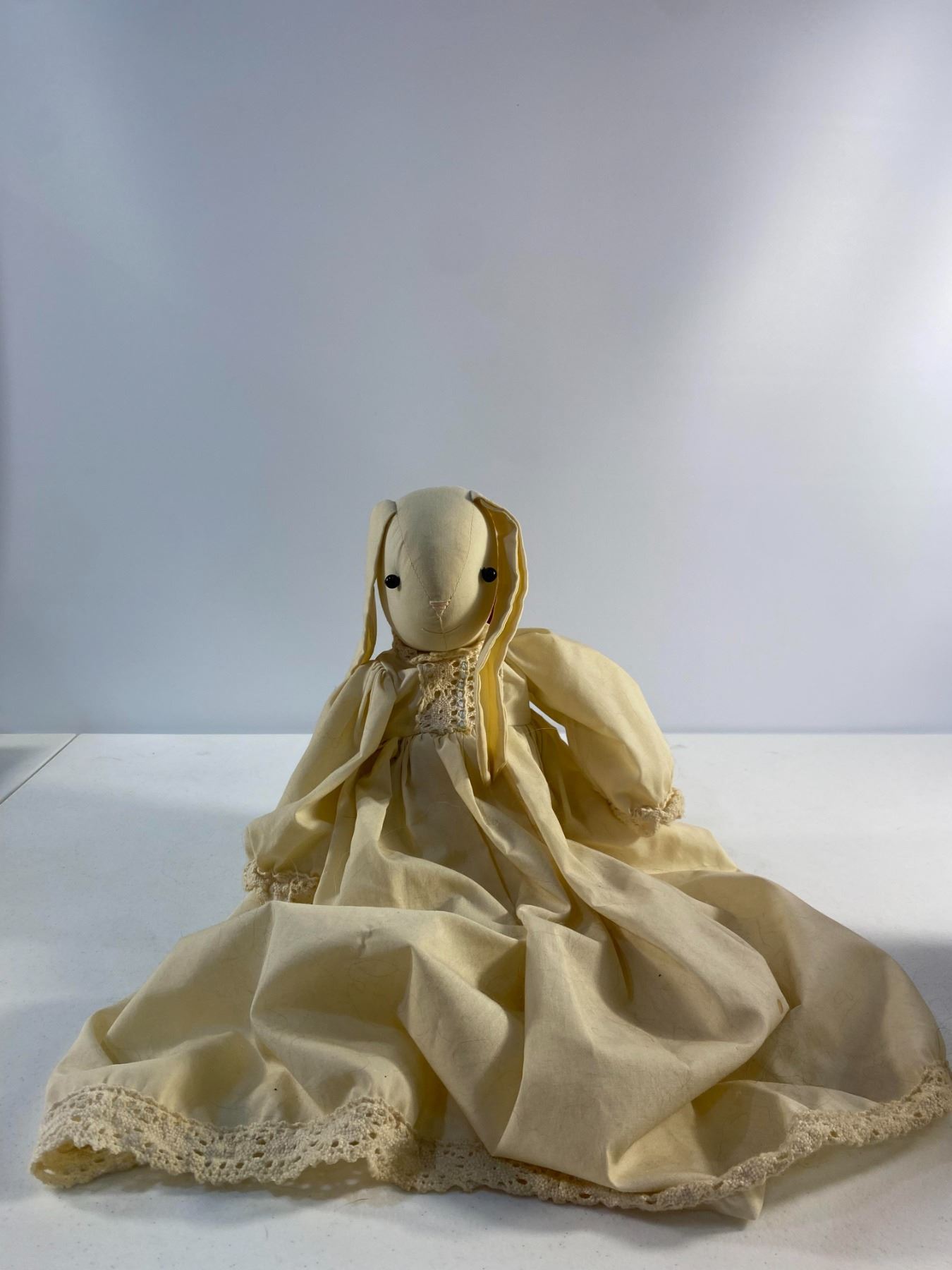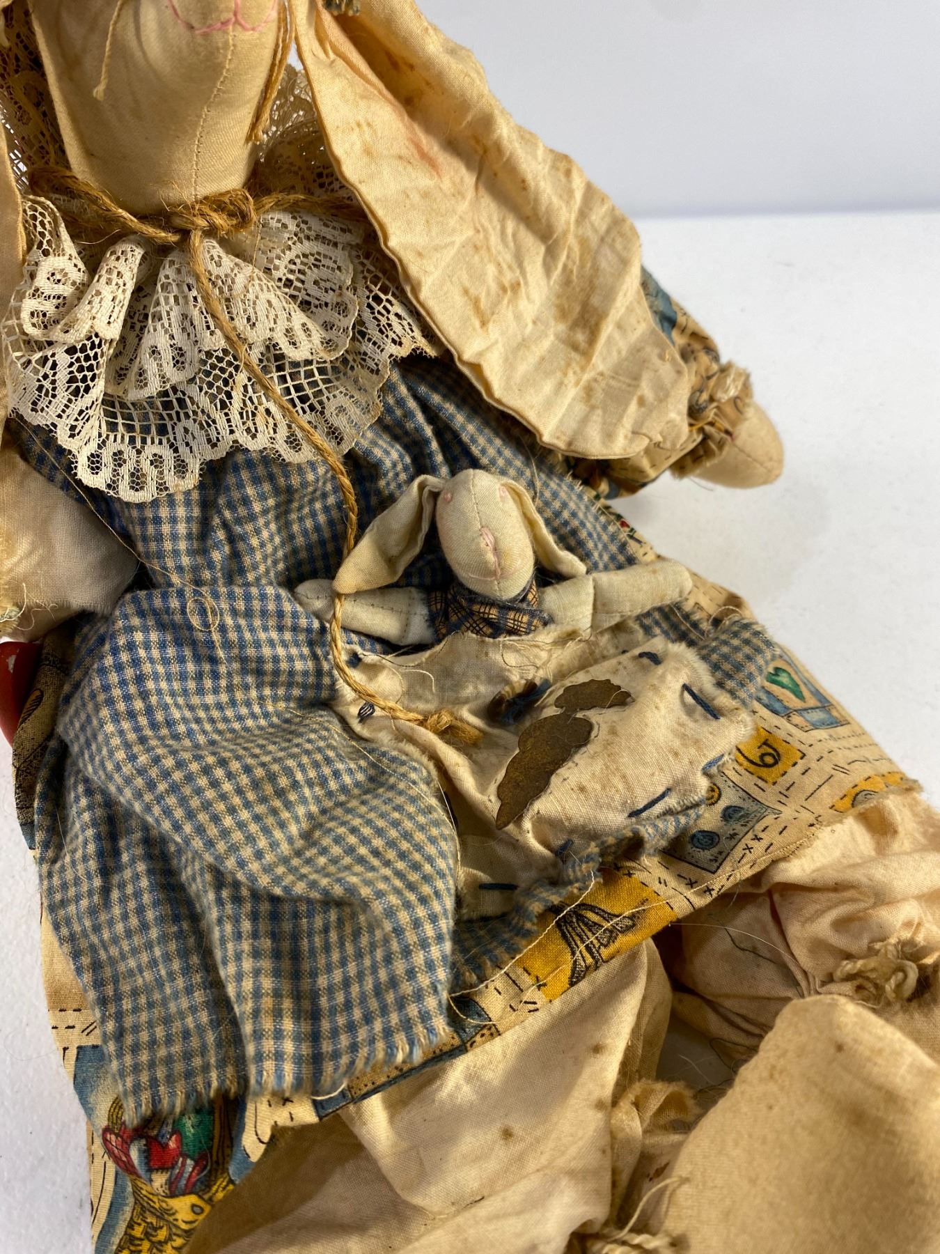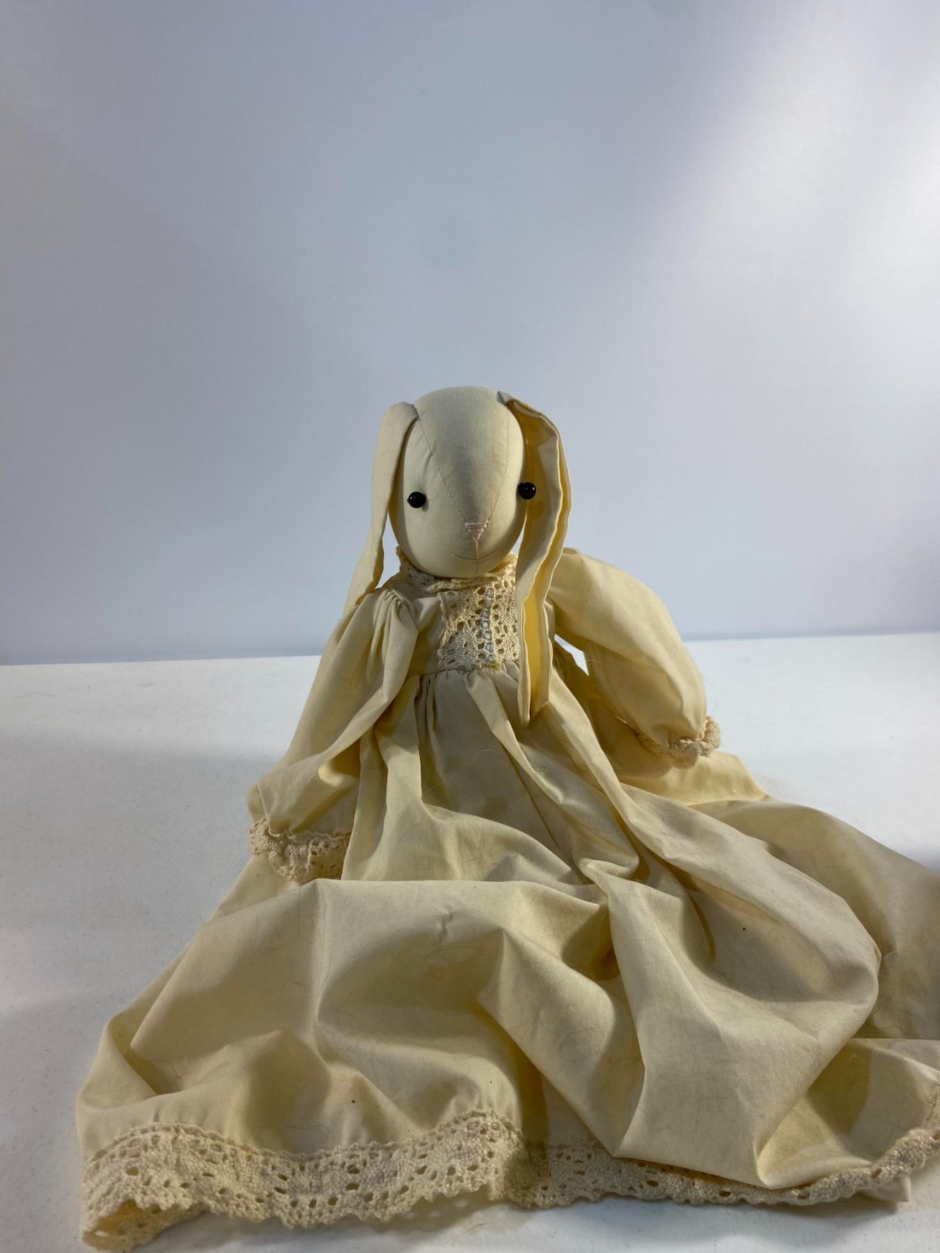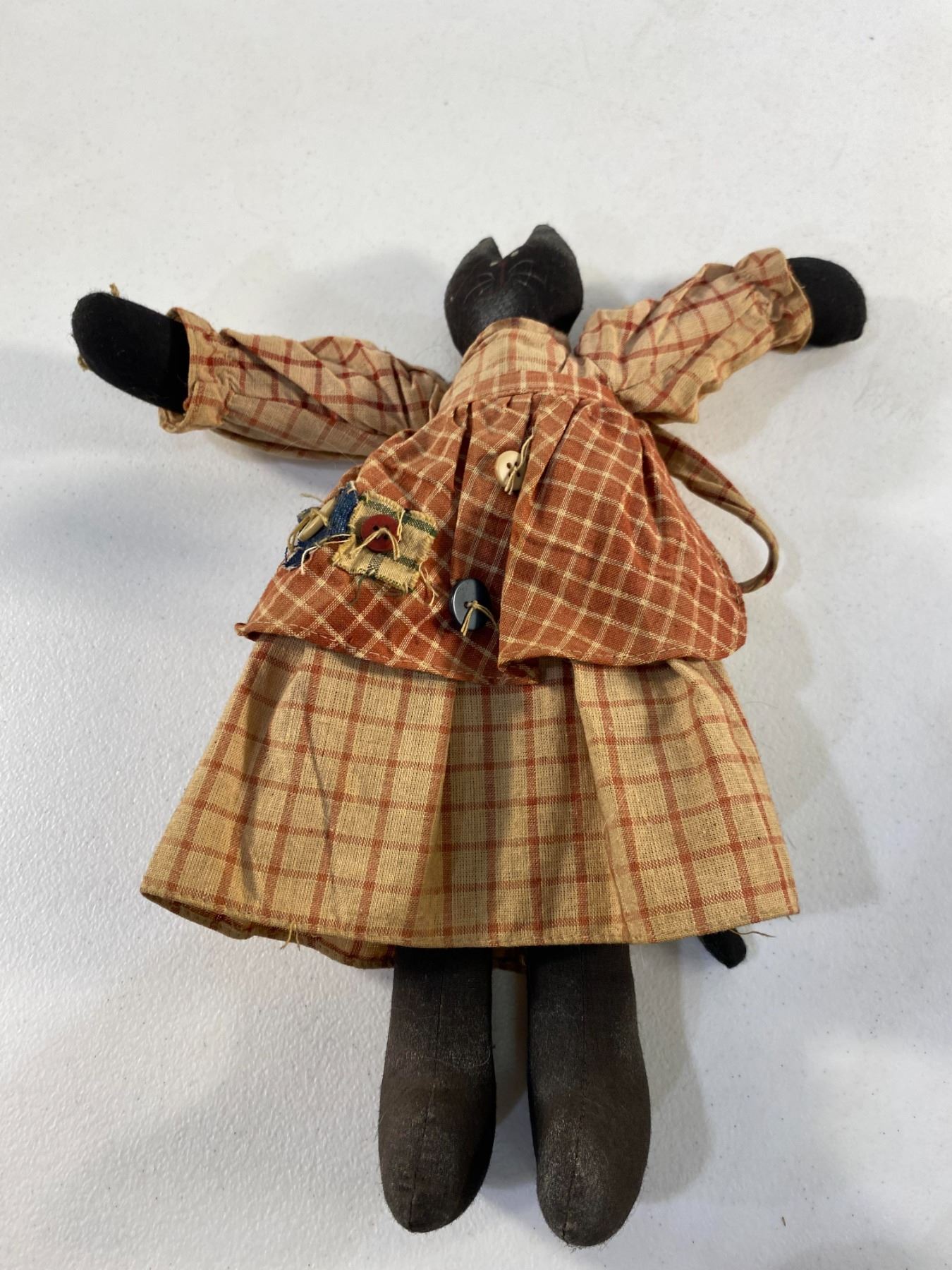 Charming trio of handcrafted primitive-style cloth dolls including two rabbits and one cat. Each dressed in vintage-inspired fabric outfits with lace and checkered details. Unique folk art appeal with soft, aged patina and homespun character.