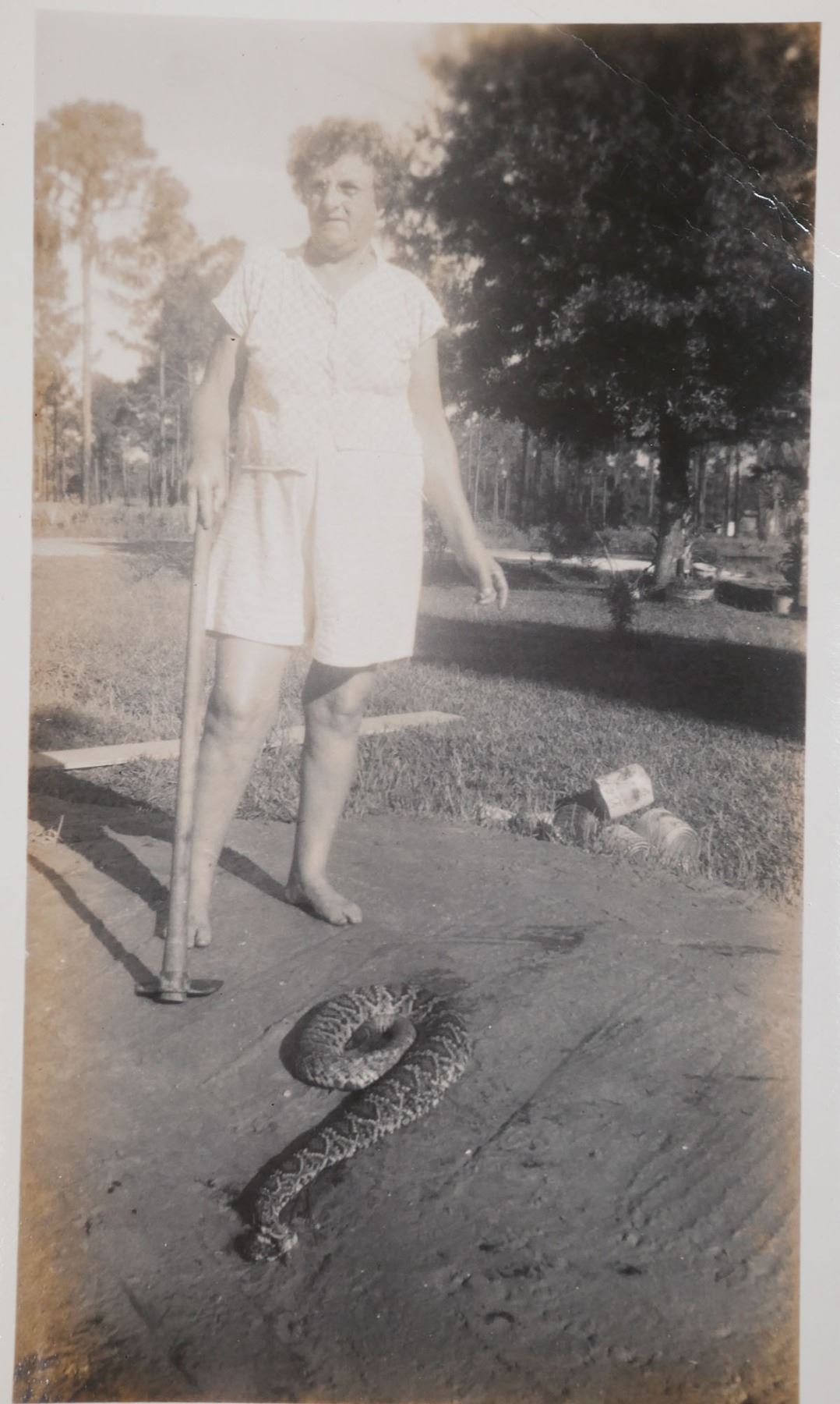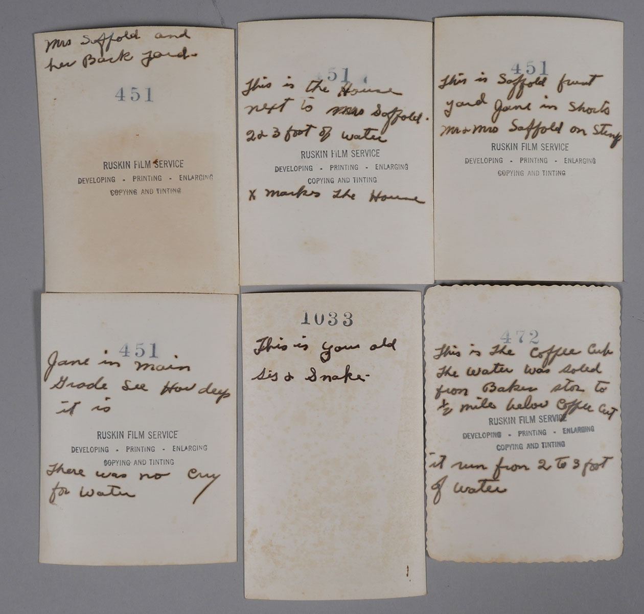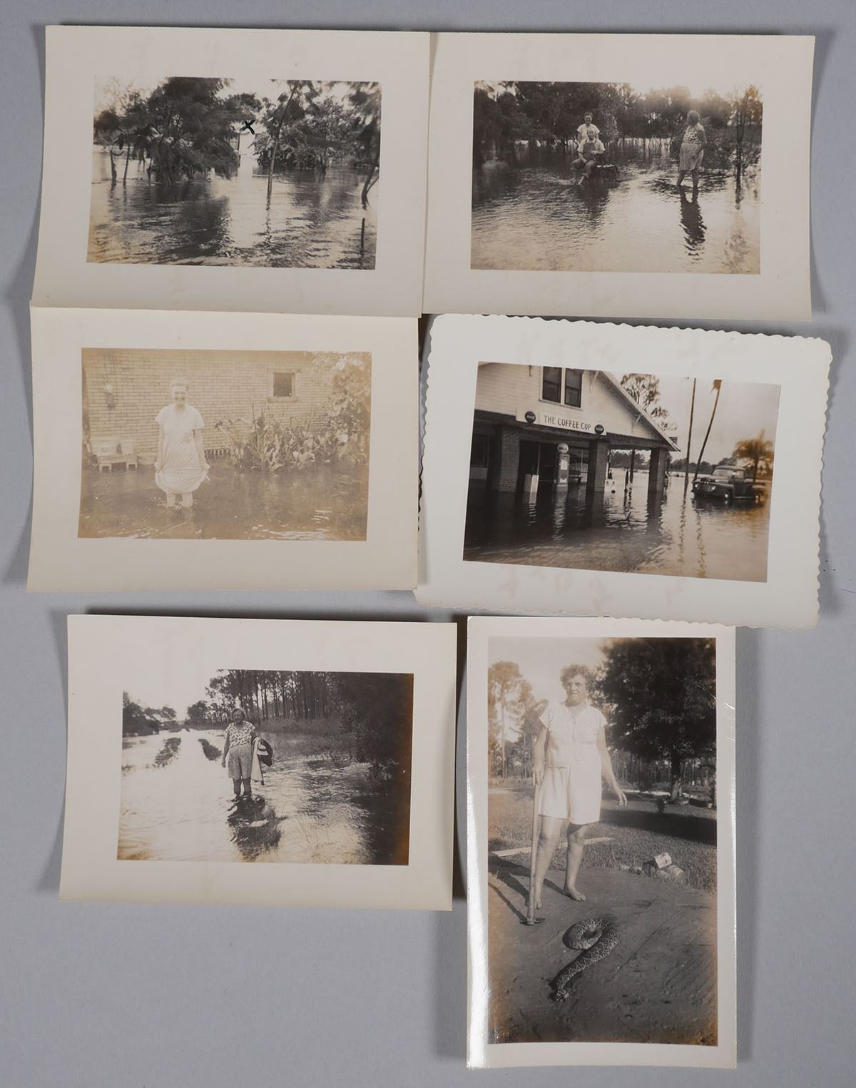Antique silver gelatin print disaster photos showing Ruskin, Florida during a flood. Most with a Ruskin stamp verso as well as written descriptions. One showing a woman with large Eastern Diamondback Rattlesnake. Largest measures 4" tall. Excellent condition.