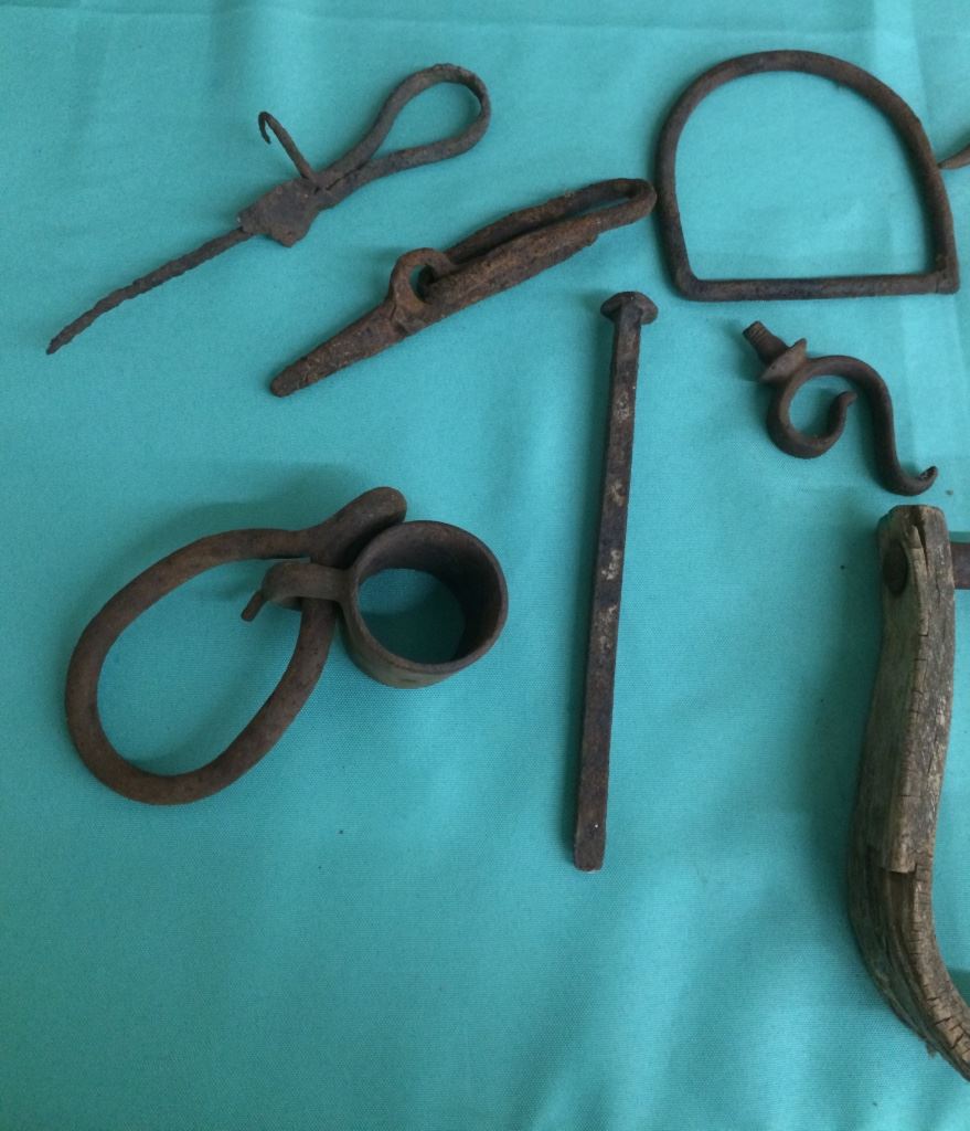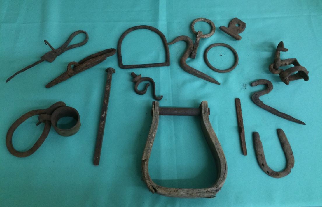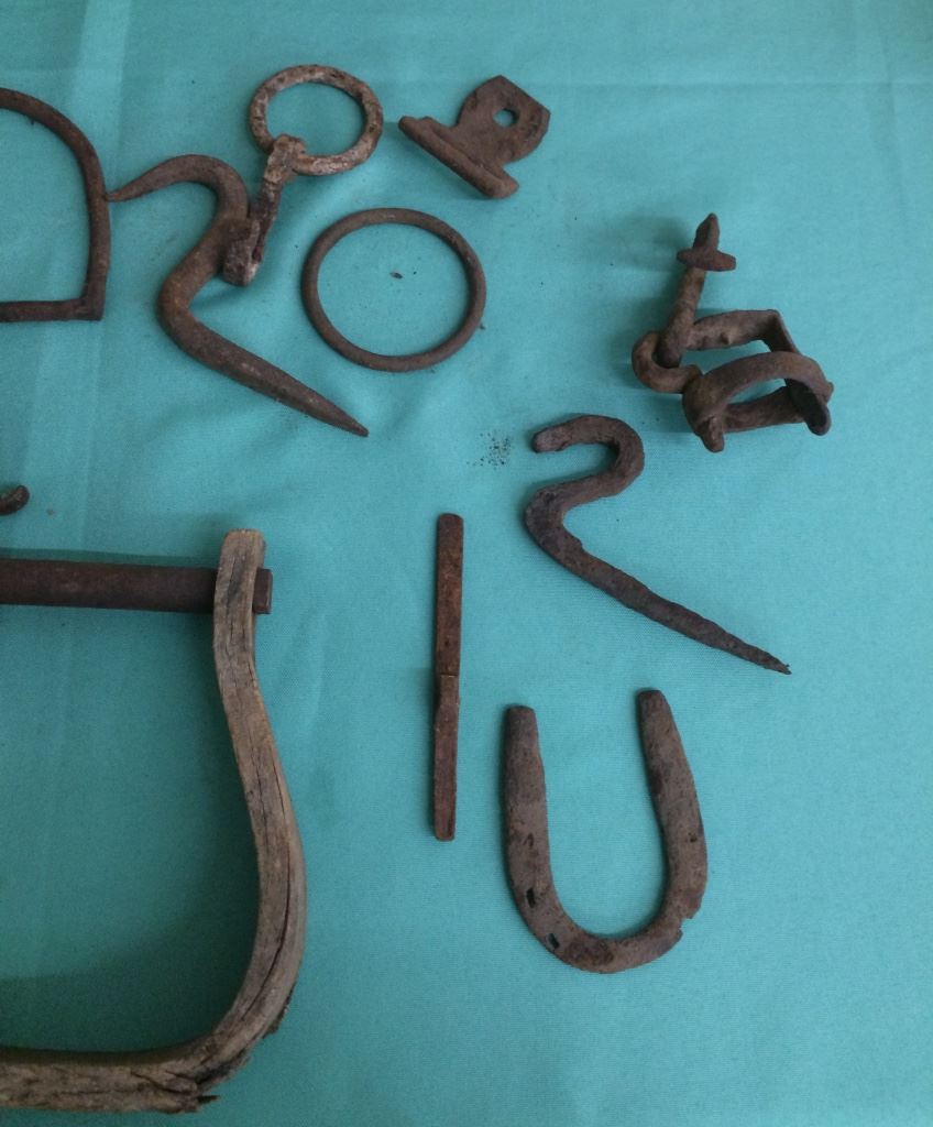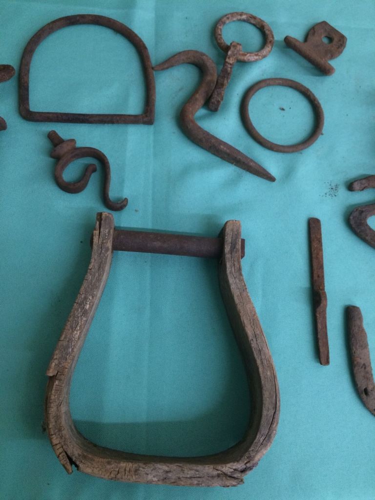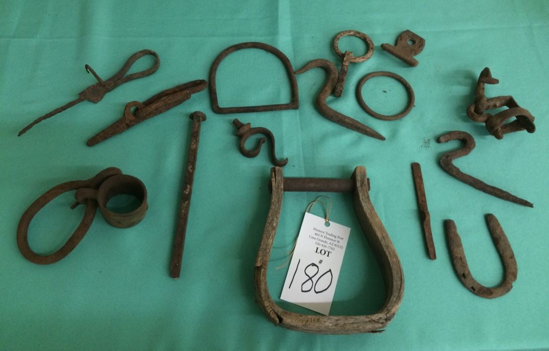 This group of (15 items) came out of the old Frontier Relics Museum (Orville Mickens estate). Items include an old miners candle pick, handmade wood stirrup, metal wagon and harness parts, a mule shoe and many others. They seem to date to the late 1800s - early 1900s. Mr. Mickens found most of the items in his museum while tromping around historical areas in Arizona and New Mexico. Please look at pics to see what all you will get. As found condition. Shipping: There will be a $7 handling / packaging fee for shipping this lot. The actual cost of postage will be added on top of that.