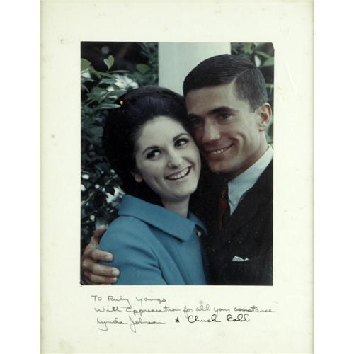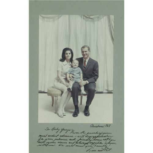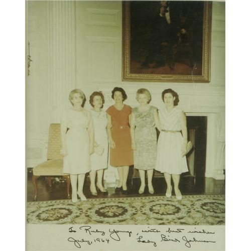 <B> Group of Seven Photographs Signed by multiple First Ladies, First Family members, and one Hollywood luminary .</B></I> These photographs, 4 - 8" x 10"'s and 3 somewhat larger examples, are from the 1950s - 1960s and each is inscribed to a "Ruby Youngs". The gratitude and familiar tone of the messages indicate that Ms.Youngs was probably a beloved White House staffer. Celebrity signatures included are Margaret Truman, Mamie Eisenhower, Lady Bird Johnson, Lucie Johnson, Lynda Johnson, Tricia Nixon, and Paul Newman. Yes, that's right, Paul Newman. Some discoloration from exposure to sunlight. Overall Fine condition.