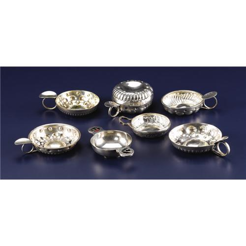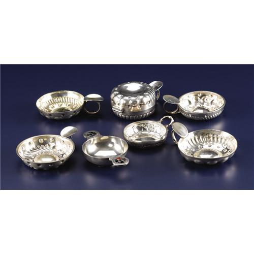 <B>A Group of Silver Wine Tasters</B></I><BR><BR>Various makers, France and England<BR>Nineteenth and Twentieth Centuries<BR>Silver, agate<BR>Various marks<BR>Various dimensions<BR><BR>Comprising a French lidded wine taster with gadrooned and embossed ball decoration engraved <I>P. Joumier,</B></I> the thumb rest monogrammed <I>J.J.</B></I>; four French wine tasters of various sizes with gadrooned and embossed ball decoration and thumb rests (one monogrammed <I>JLR</B></I>), a French wine taster with embossed grape cluster decoration and shaped loop handle, and one double handled bowl with agate insets and chased decoration, Birmingham, England, circa 1920-1921, inscribed <I>Hellie 1921</B></I>. <B>Condition Report:</B> Denting to several.<BR><BR><b>Shipping:</b> Requires 3rd Party Shipping (<a target="_blank" href="http://www.heritageauctions.com/common/shipping.php">view shipping information</a>)